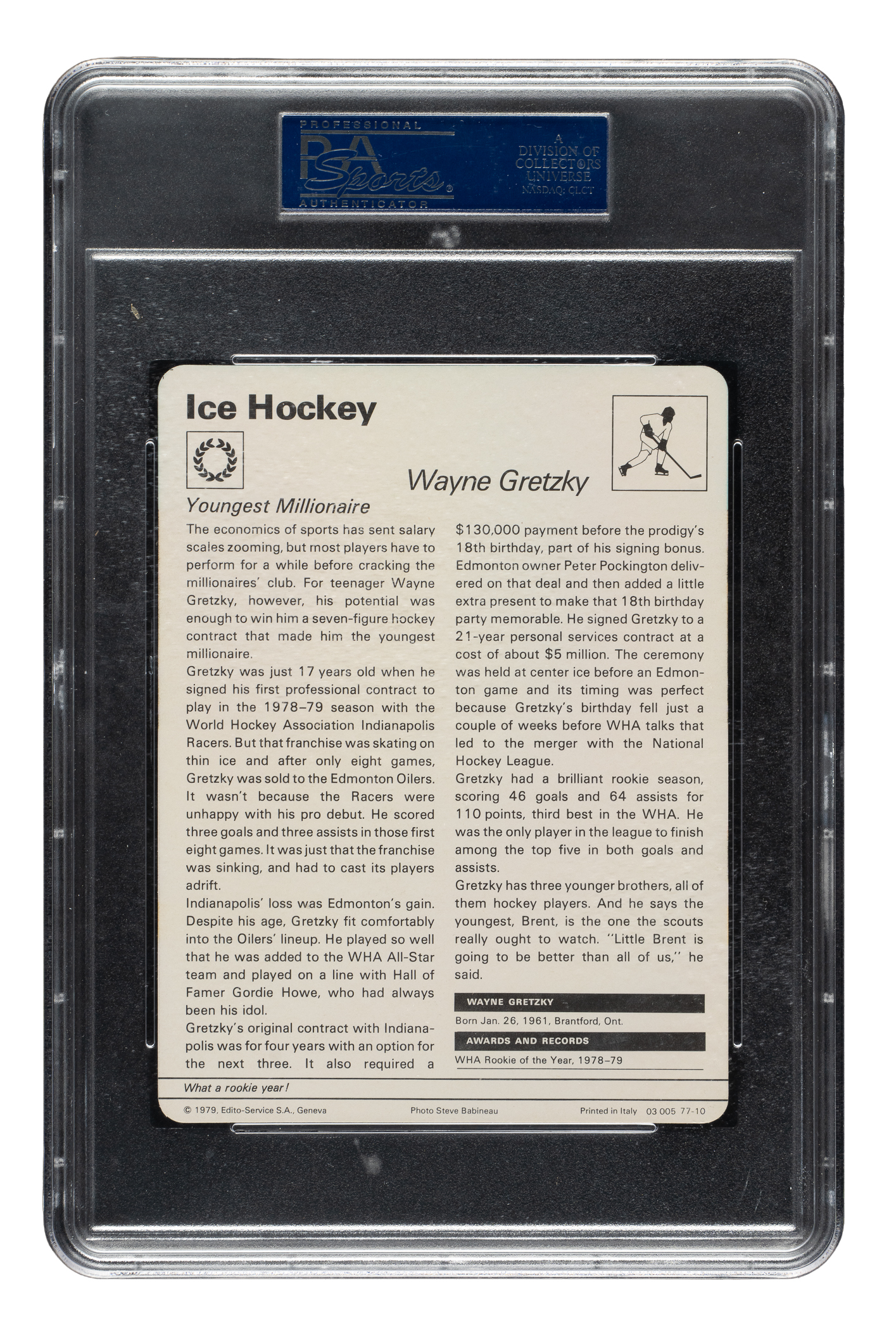 Graded NM-MT 8 by PSA. Outstanding rarely seen 1977-1979 Sportscaster Italy Hockey #77-10 Wayne Gretzky rookie card. While everyone knows Gretzky's O-Pee-Chee and Topps rookie cards, few are familiar with his 1977-1979 Sportscaster card, which was printed in Italy. The offered example displays outstanding color, a sharp image, and crisp curved corners. Boldly printed reverse. This card would make a fantastic addition to any Wayne Gretzky or world-class hockey collection.