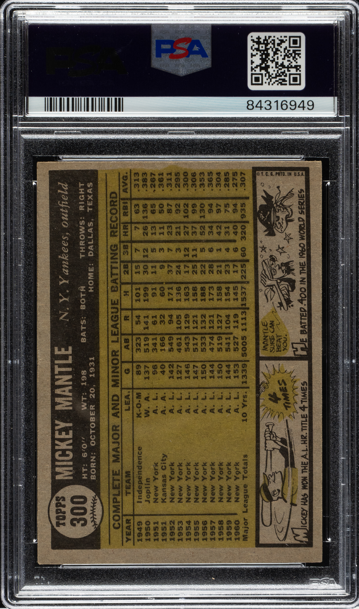 Lot # 1871: 1961 Topps #300 Mickey Mantle PSA EX-MT 6