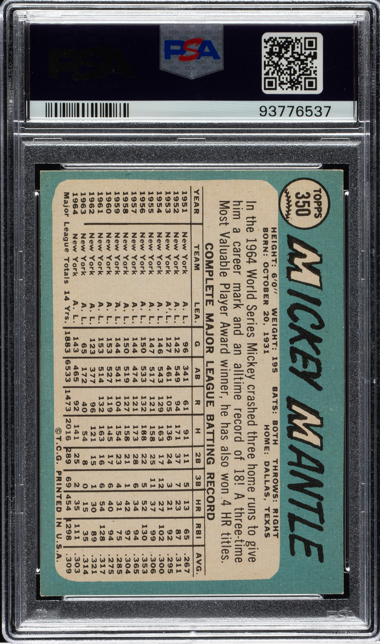 Lot # 2003: 1965 Topps #350 Mickey Mantle PSA EX-MT 6