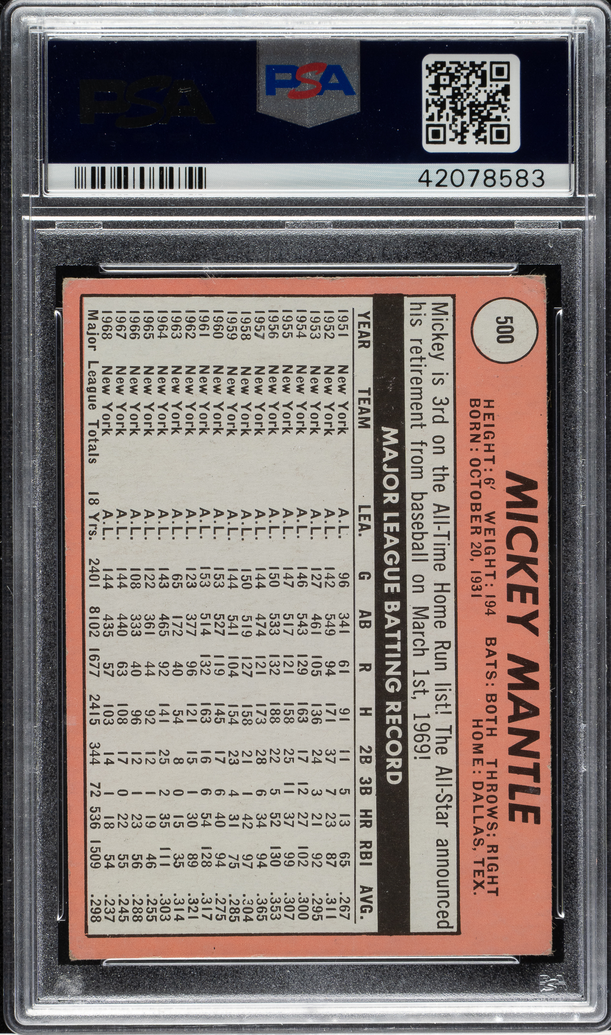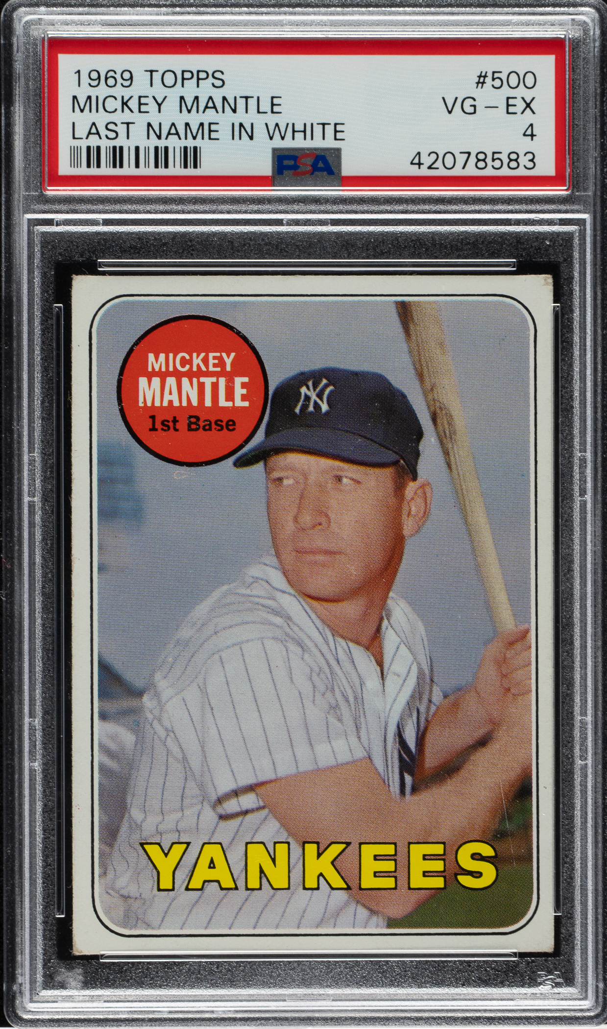 Lot # 2137: 1969 Topps #500 Mickey Mantle White Letter Variation PSA VG-EX 4