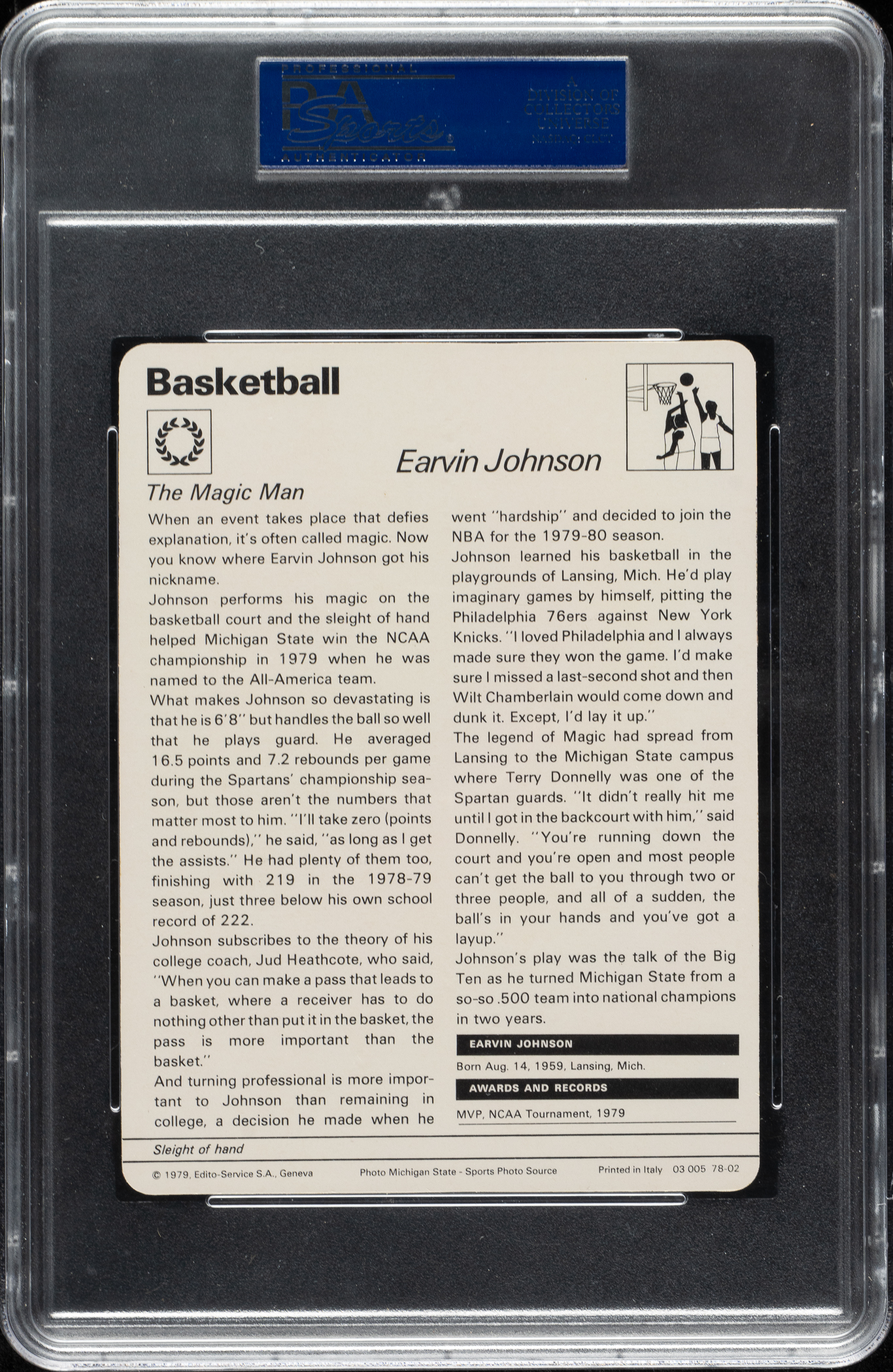 Graded MINT 9 by PSA. Los Angeles Lakers basketball Hall of Famer Magic Johnson.