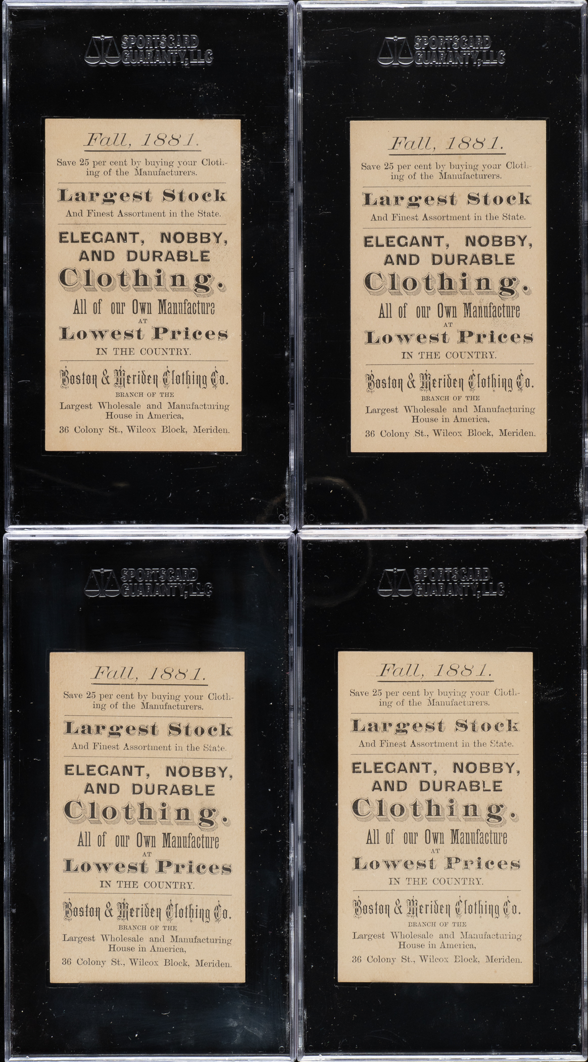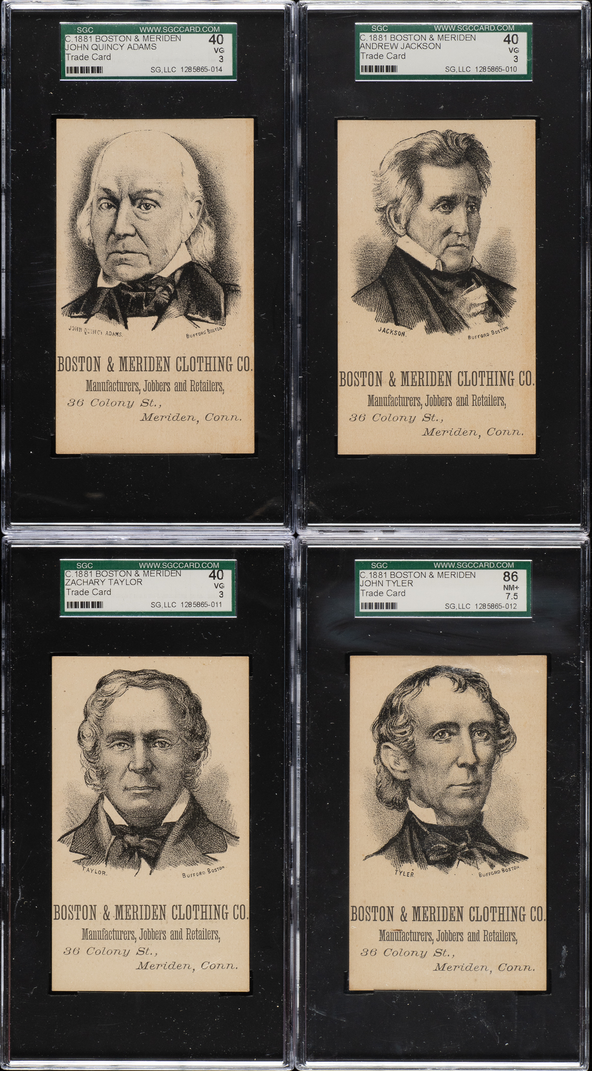 Collection of four Circa 1881 Boston & Meriden trade cards, each graded and encapsulated by SGC. This collection consists of the following: Adams (VG 40), Jackson (VG 40), Taylor (VG 40), and Tyler (NM+ 86). Total: 4 cards.