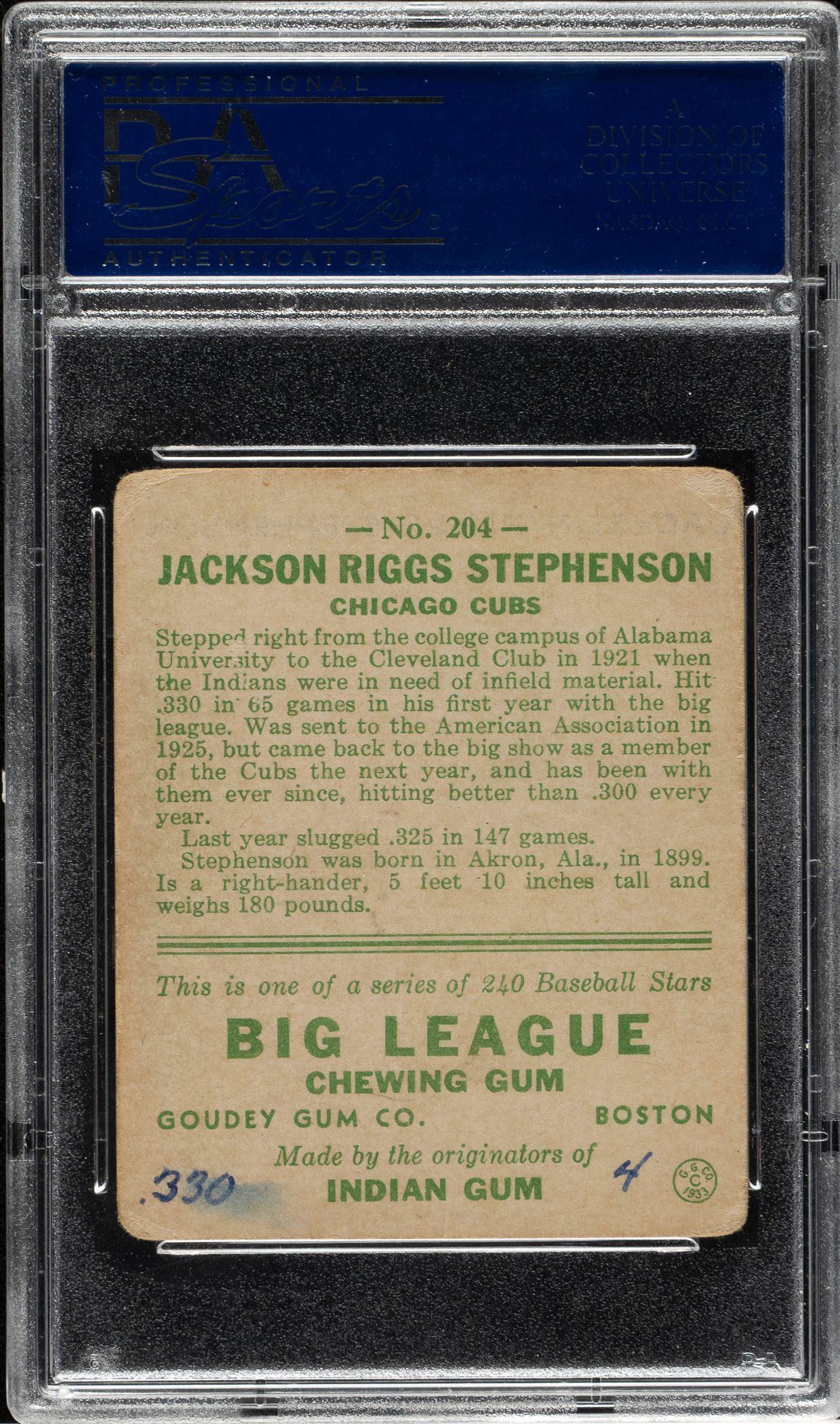 Lot # 1120: Signed 1933 R319 Goudey #204 Riggs Stephenson - PSA/DNA