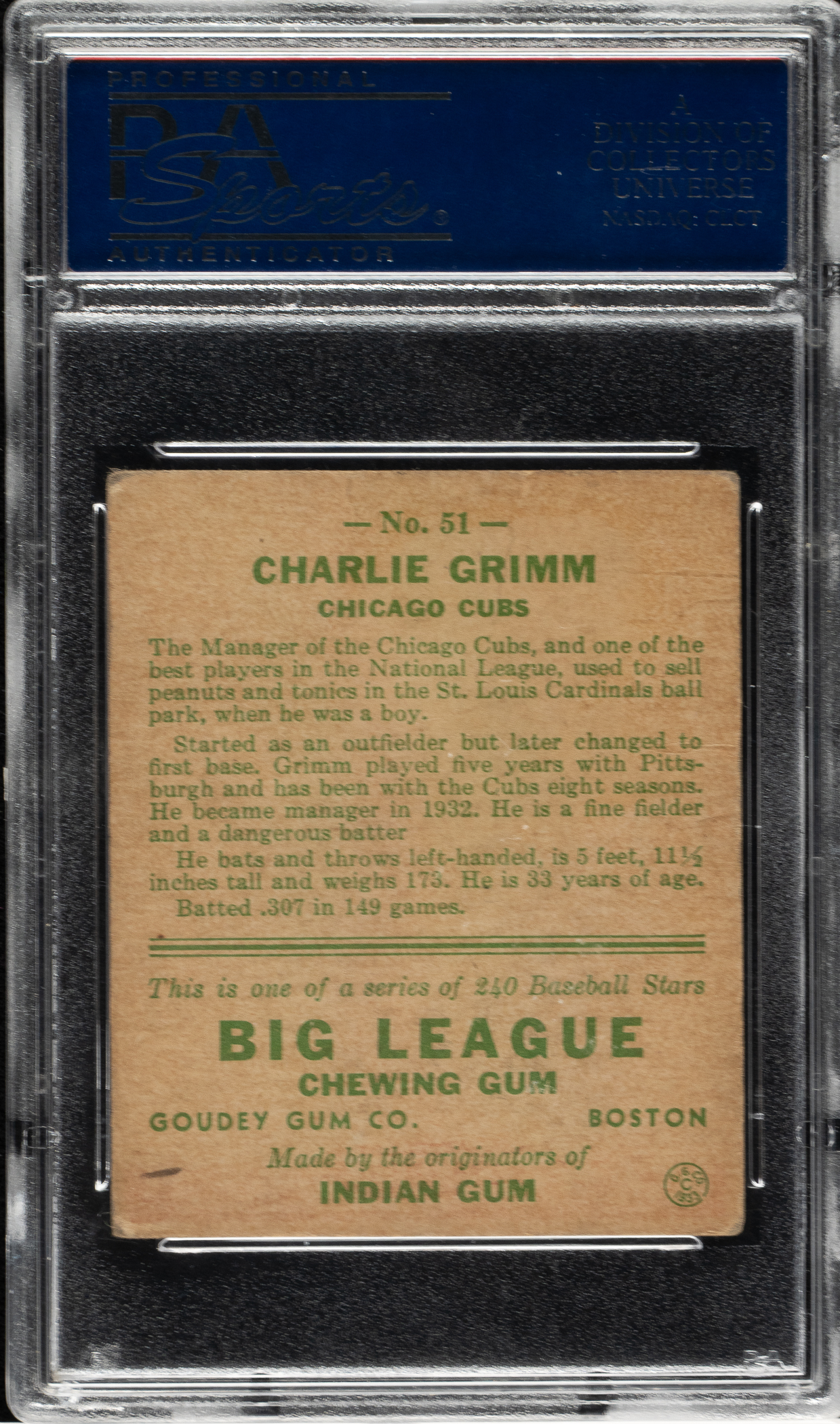 Lot # 1122: Signed 1933 R319 Goudey #51 Charlie Grimm - PSA/DNA