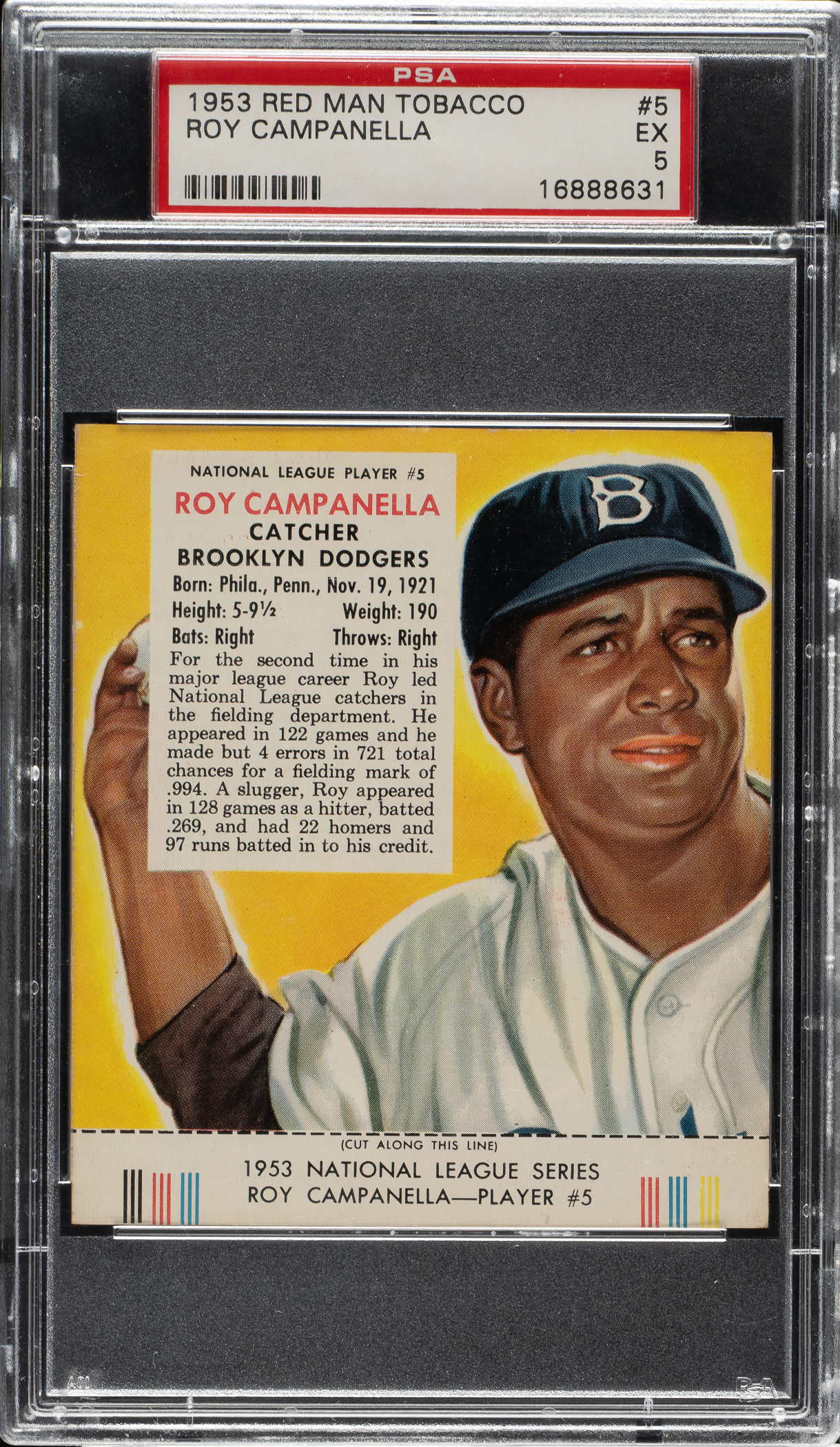 Graded EX 5 by PSA. Brooklyn Dodgers Hall of Famer Roy Campanella.