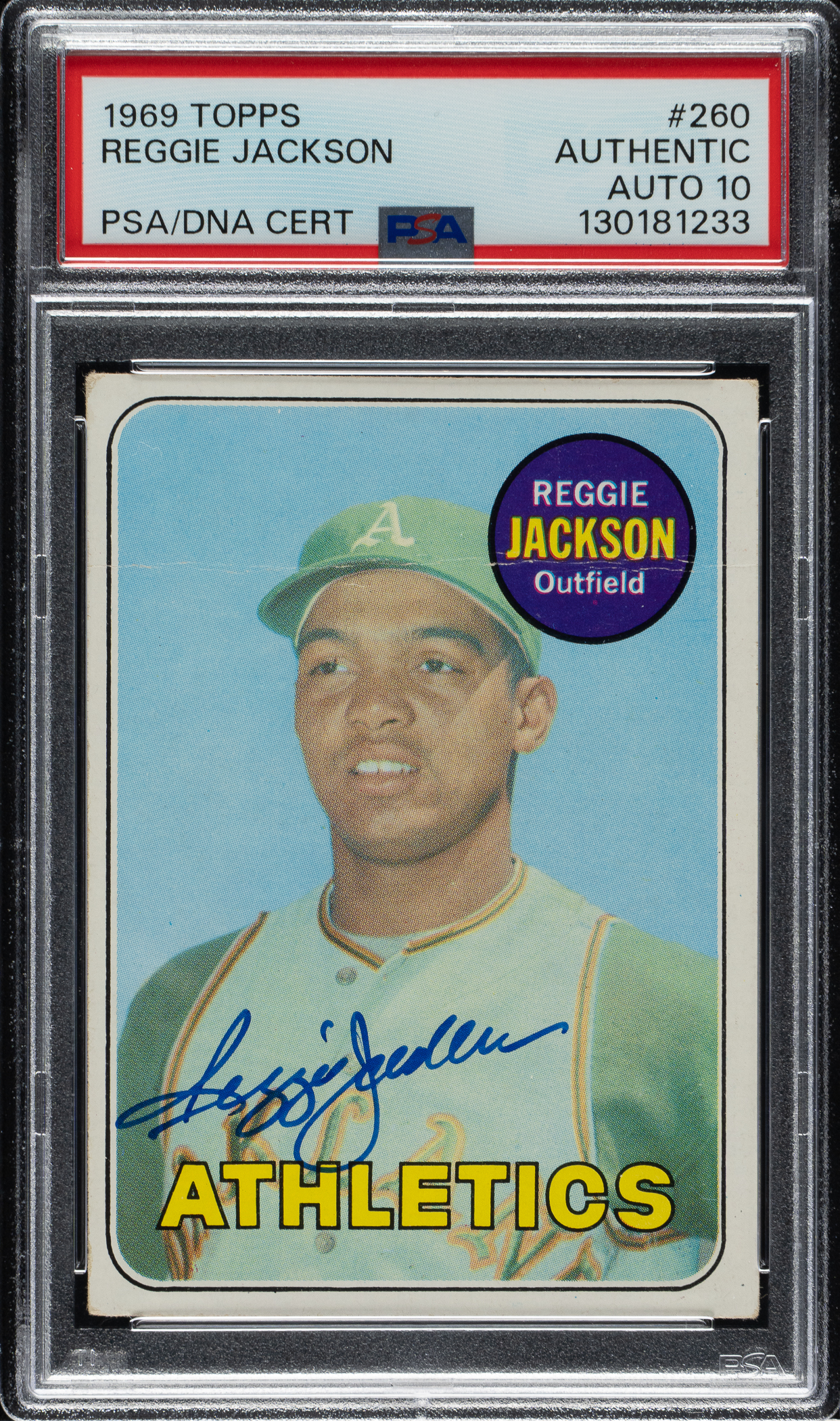 PSA/DNA has encapsulated the card, grading the signature GEM MINT 10. Oakland athletics Hall of Famer Reggie Jackson.