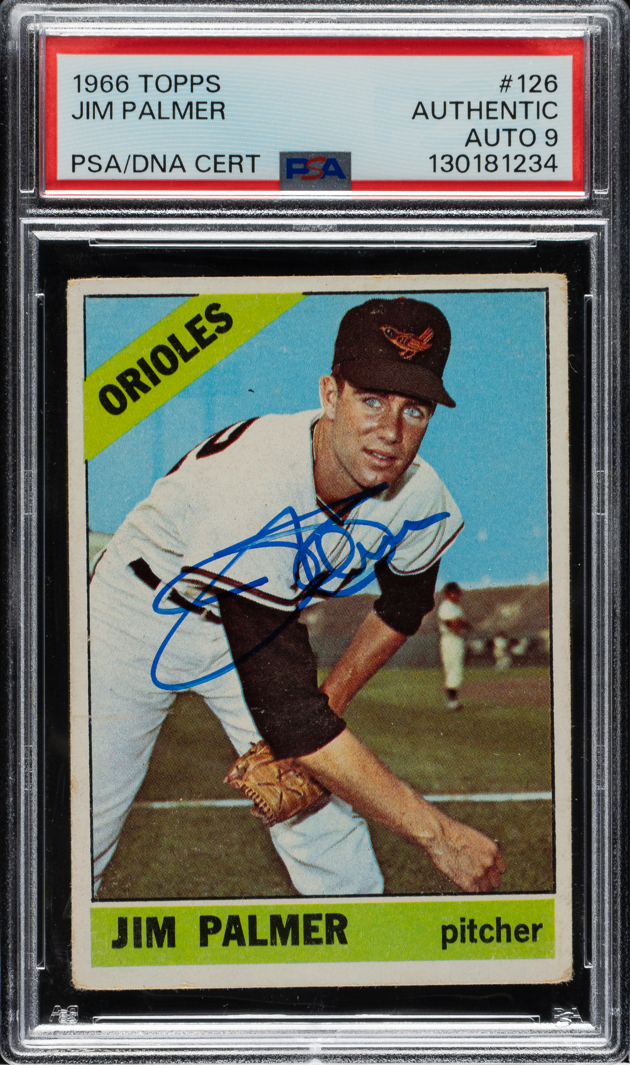 PSA/DNA has encapsulated the card, grading the signature MINT 9. Baltimore Orioles Hall of Famer Jim Palmer.
