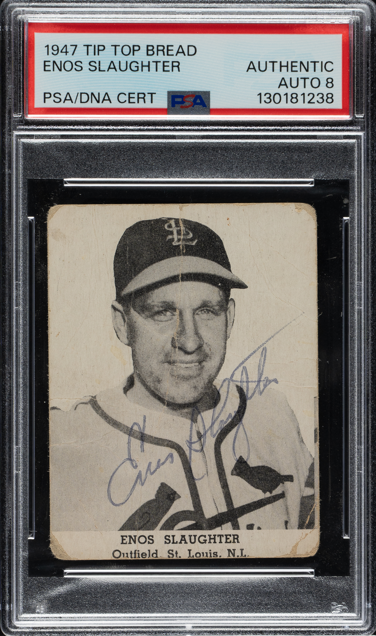PSA/DNA has encapsulated the card, grading the signature NM-MT 8. St. Louis Cardinals Hall of Famer Enos Slaughter