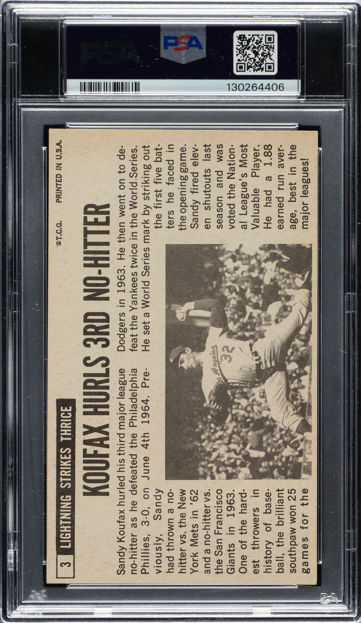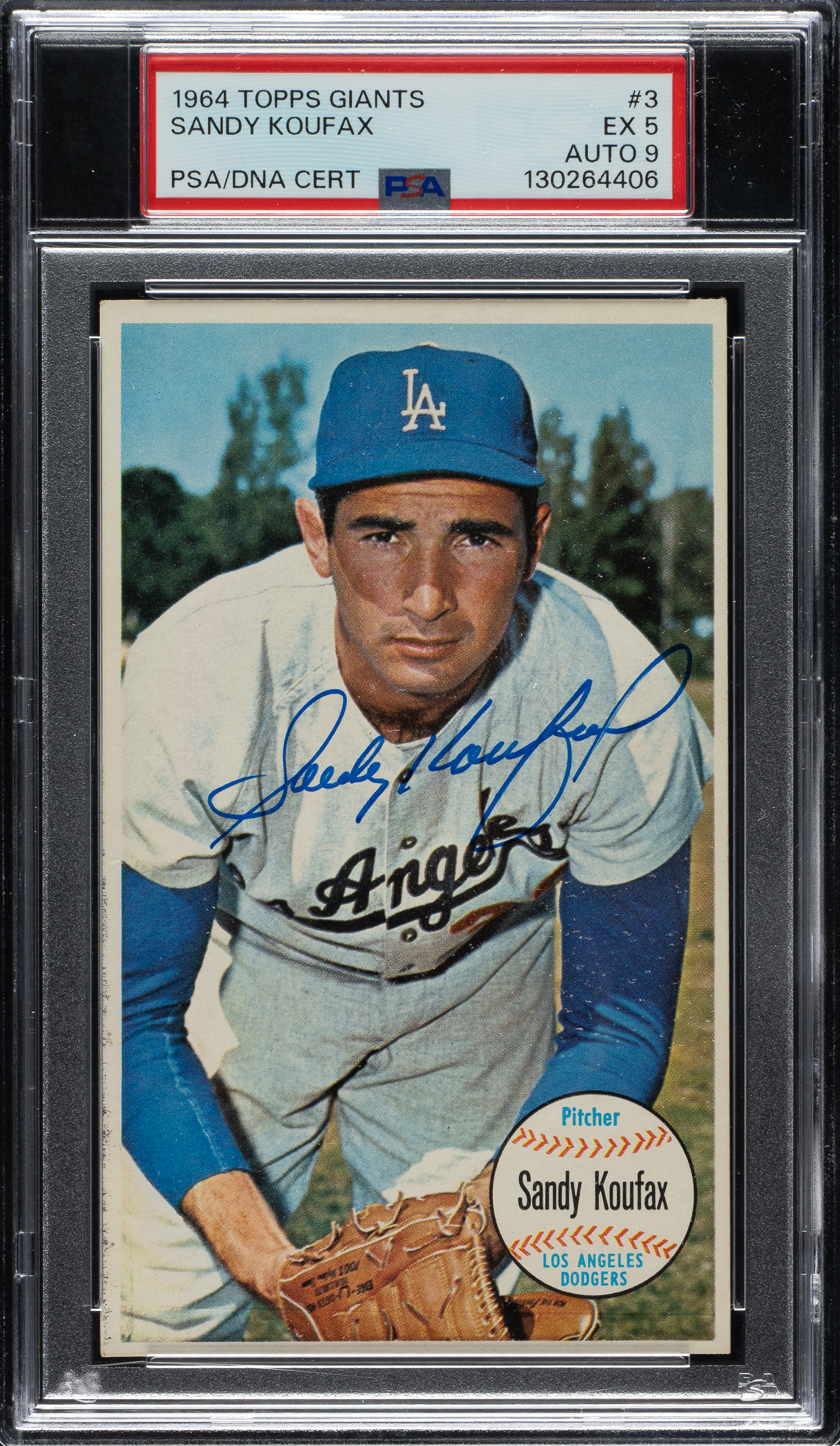 PSA/DNA has encapsulated the card, grading the signature MINT 9 and the card EX 5. Brooklyn Dodgers Hall of Famer Sandy Koufax.