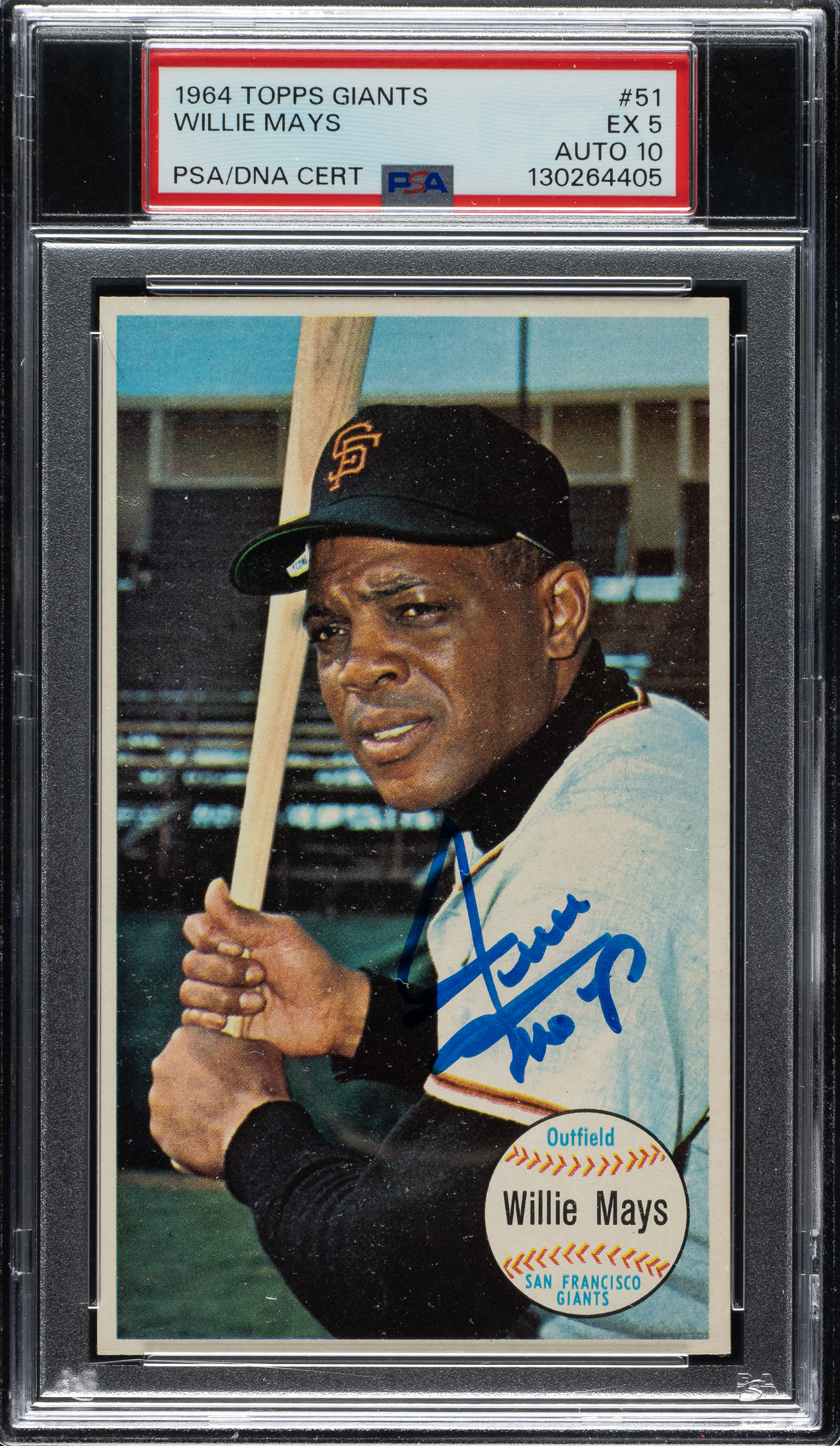 PSA/DNA has encapsulated the card, grading the signature GEM MINT 10 and the card EX 5. San Francisco Giants Hall of Famer Willie Mays.