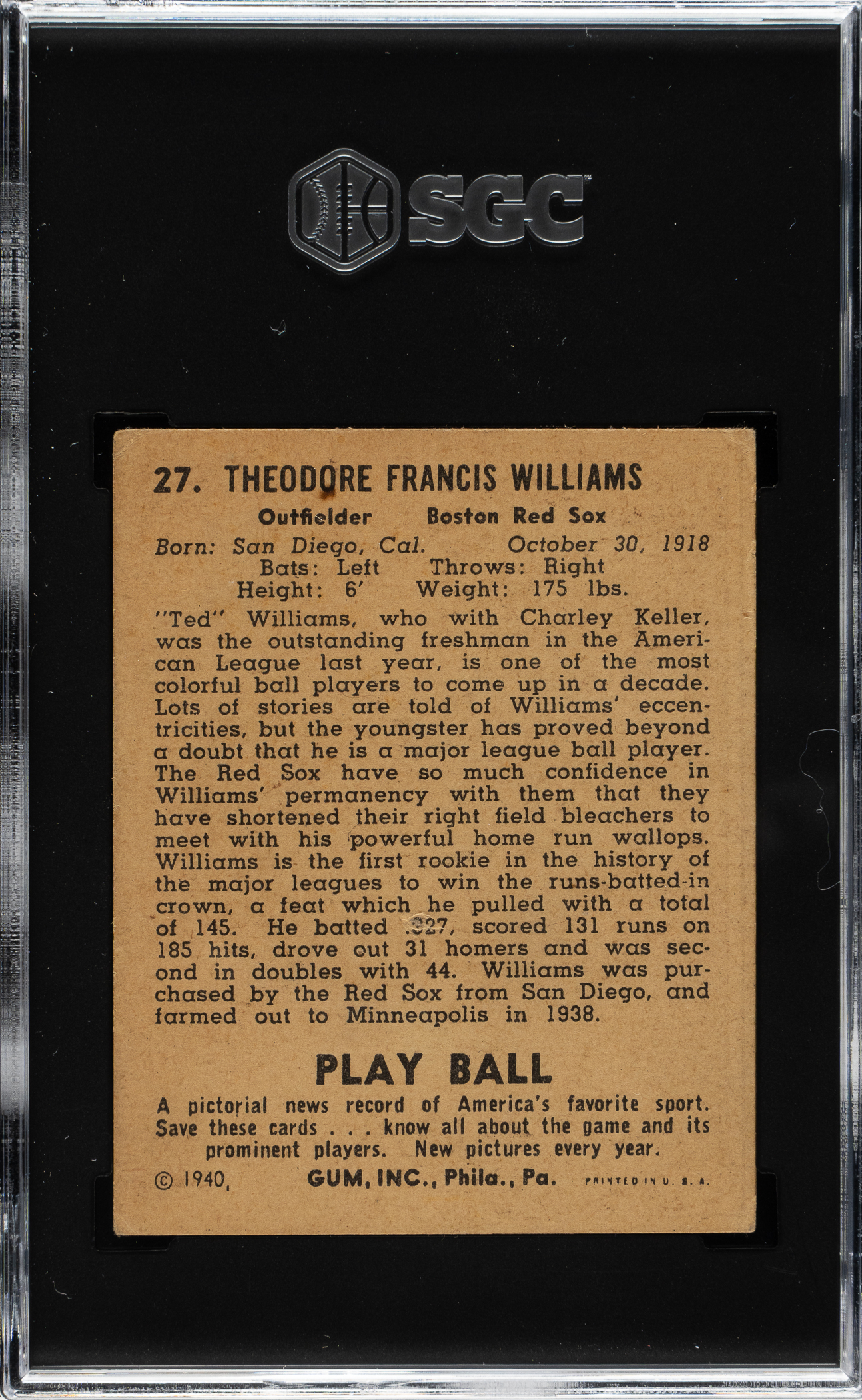 Lot # 1208: 1940 R335 Play Ball #27 Ted Williams SGC VG 3