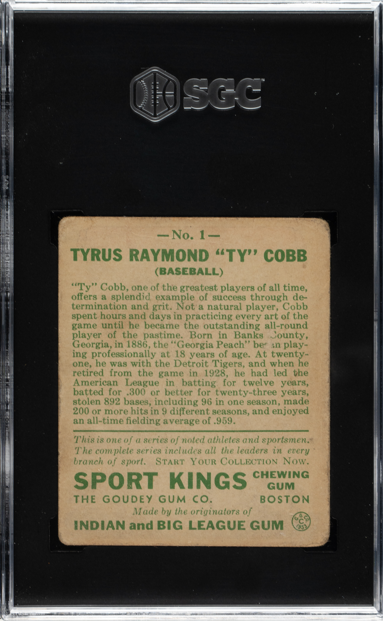 Graded GOOD 2 by SGC. Detroit Tigers Hall of Famer Ty Cobb.