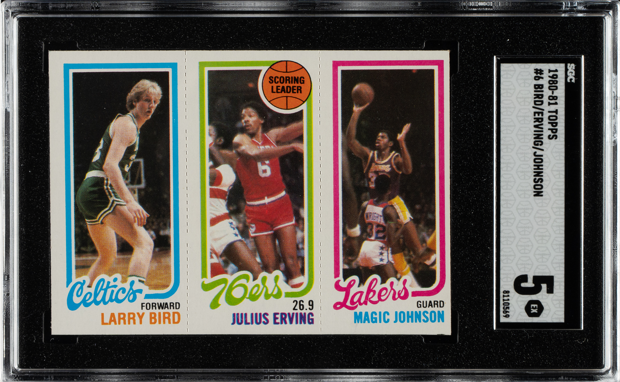 Graded EX 5 by SGC. Hall of Famers Larry Bird (Boston Celtics), Julius Erving (Philadelphia 76ers), and Magic Johnson (Los Angeles Lakers).