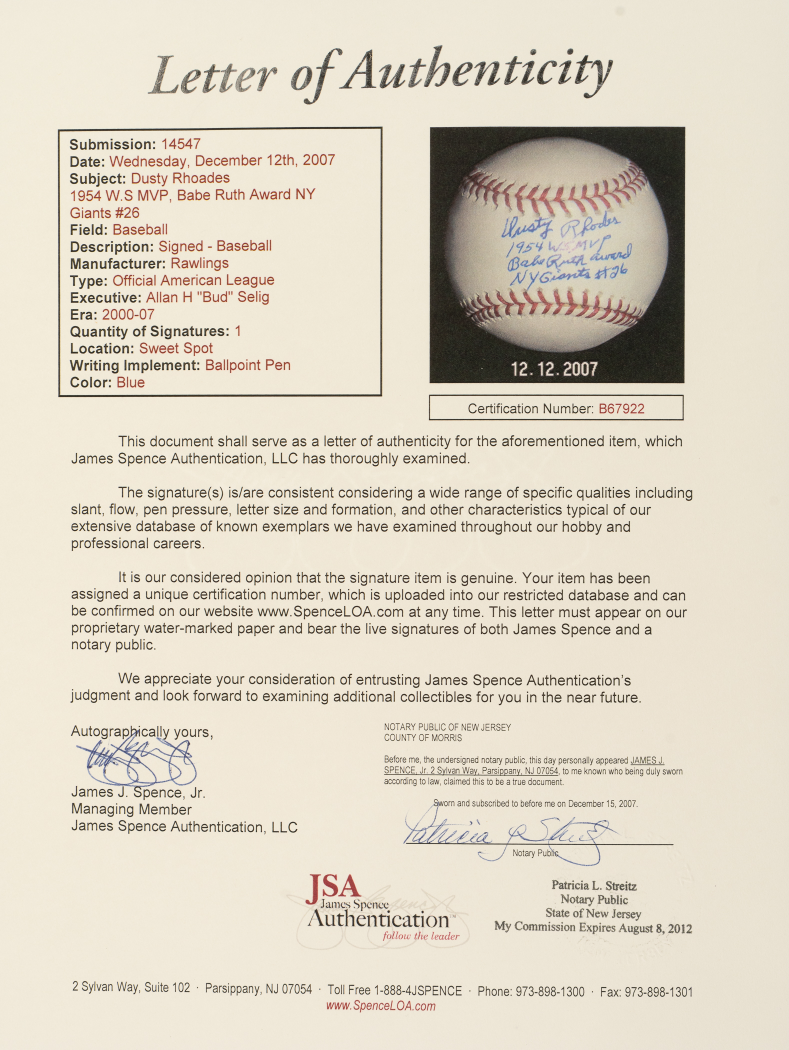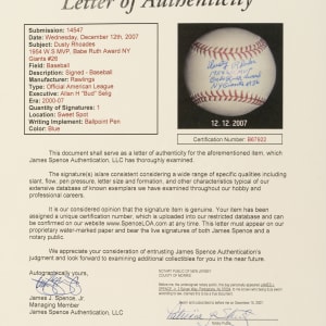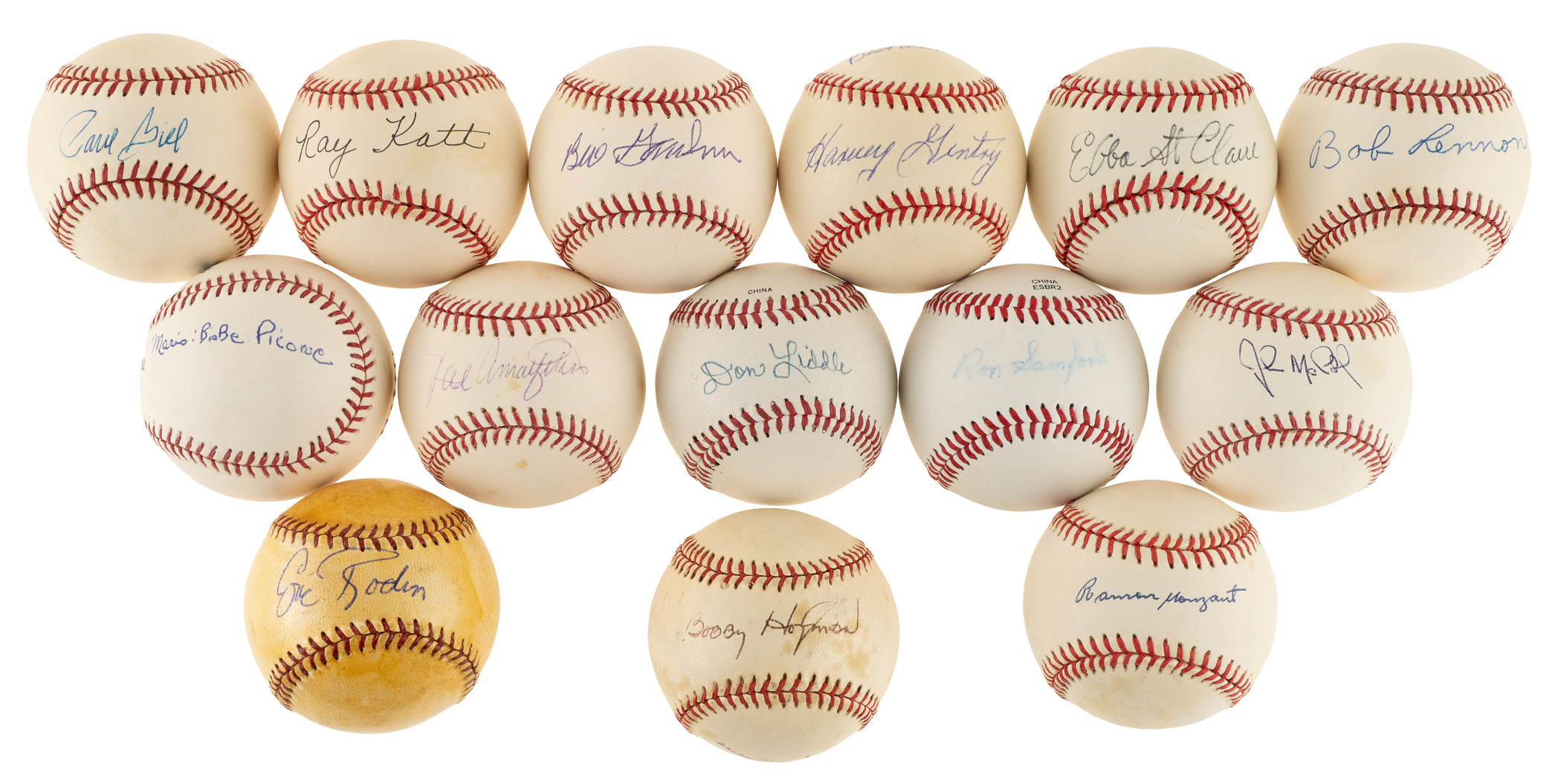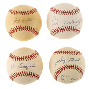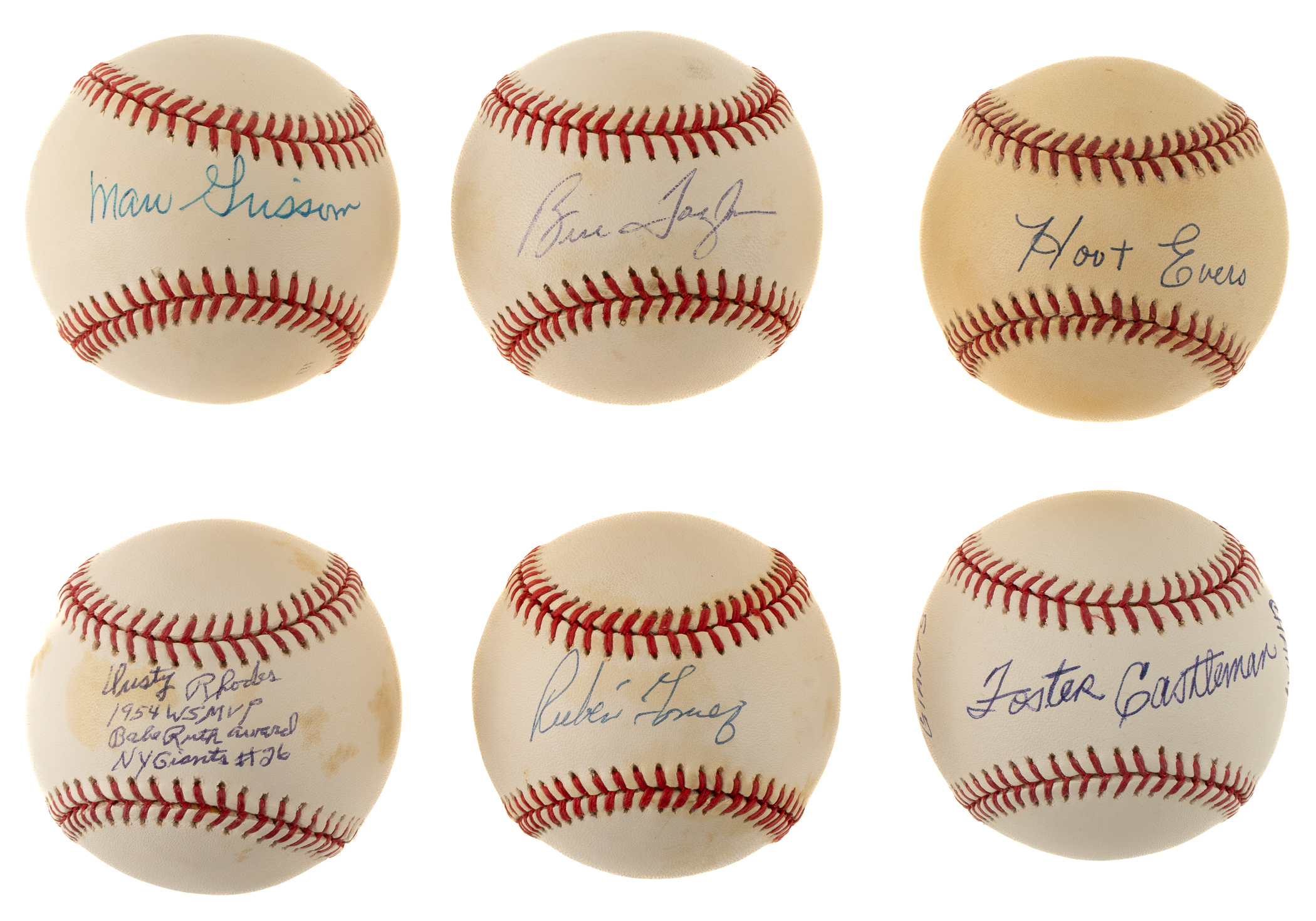 Collection of 24 single-signed baseballs consisting exclusively of former New York Giants players from the 1954 World Series Championship roster (who were not on the 1951 team). This collection is highlighted by Hoyt Wilhelm, Joe Garagiola, and many other tough-to-find signees. Unless otherwise noted, all the signatures appear on the sweet spot of an official Major or National League baseball (except for one American League and four non-Official balls) dating from the 1980s or later. The signatures have been scripted in a variety of inks. Four of the offered baseballs have full JSA LOAs while fourteen others have basic individual authentication from JSA or PSA/DNA. Most of the balls have varying degrees of age toning. Otherwise all are in Excellent to Mint or better condition overall. In this auction we are offering two other New York Giants signed baseball collections, one from the 1951 NL Championship roster and one from various years spanning the 1950s. This collection consists of the following: Joe Amalfitano, Johnny Antonelli ("2x20 1954 21-7 2.30 ERA, 1956 20-13 2.86 ERA"), Foster Castleman ("1954 World Series Champions, New York Giants"), Hoot Evers, Joe Garagiola, Bill Gardner, Harvey Gentry, Paul Giel, Ruben Gomez, Marv Grissom, Bobby Hofman, Ray Katt, Bob Lennon, Don Liddle, John McCall, Ramon Monzant, Mario "Babe" Picone (side panel), Dusty Rhodes ("1954 WS MVP, Babe Ruth Award NY Giants #26"), Eric Rodin, Ron Samford, Ebba St. Claire, Bill Taylor, Hoyt Wilhelm, and Al Worthington. Total: 24 signed baseballs. Auction LOA from James Spence/JSA. The size/weight of this item requires that there will be an additional shipping charge for this lot.