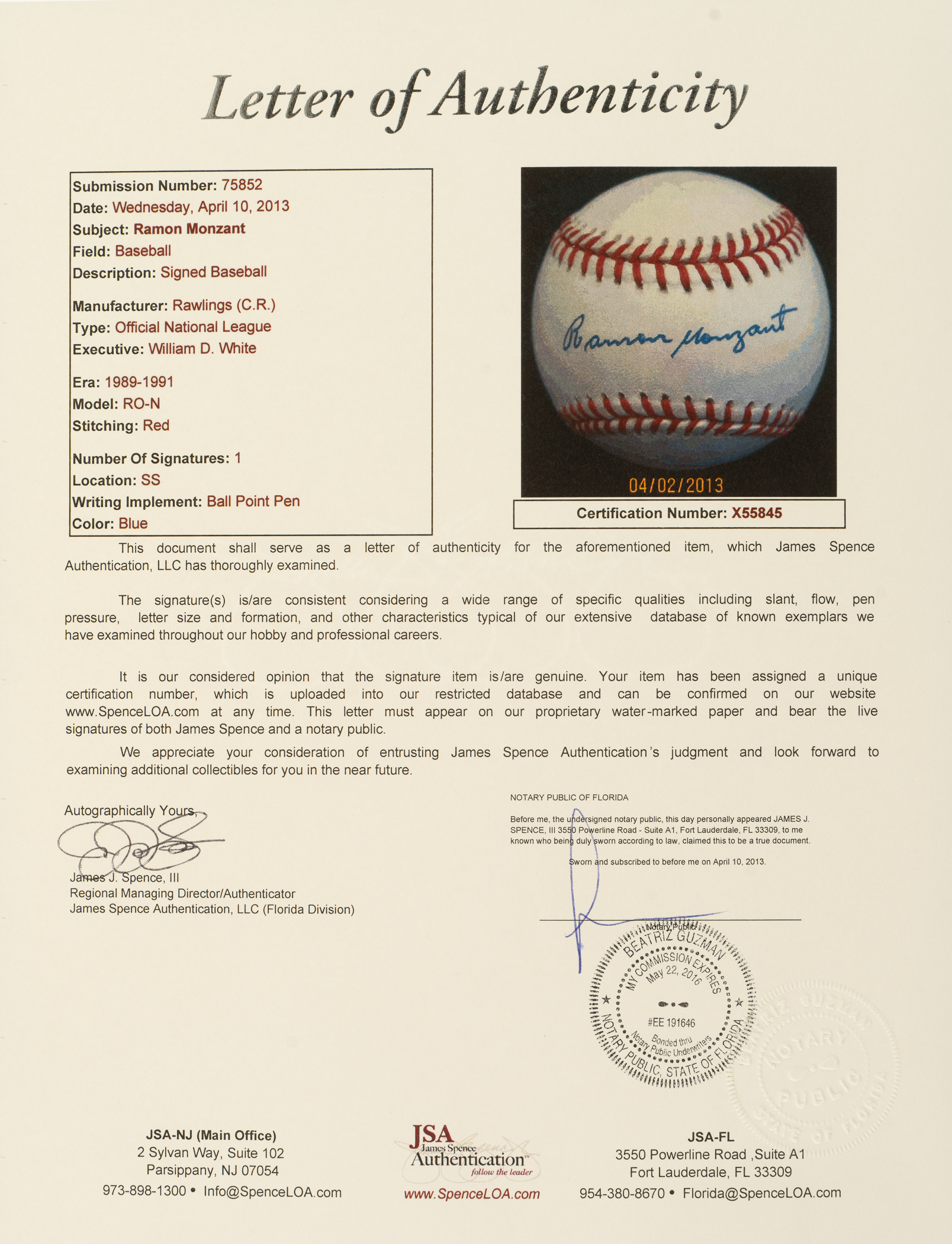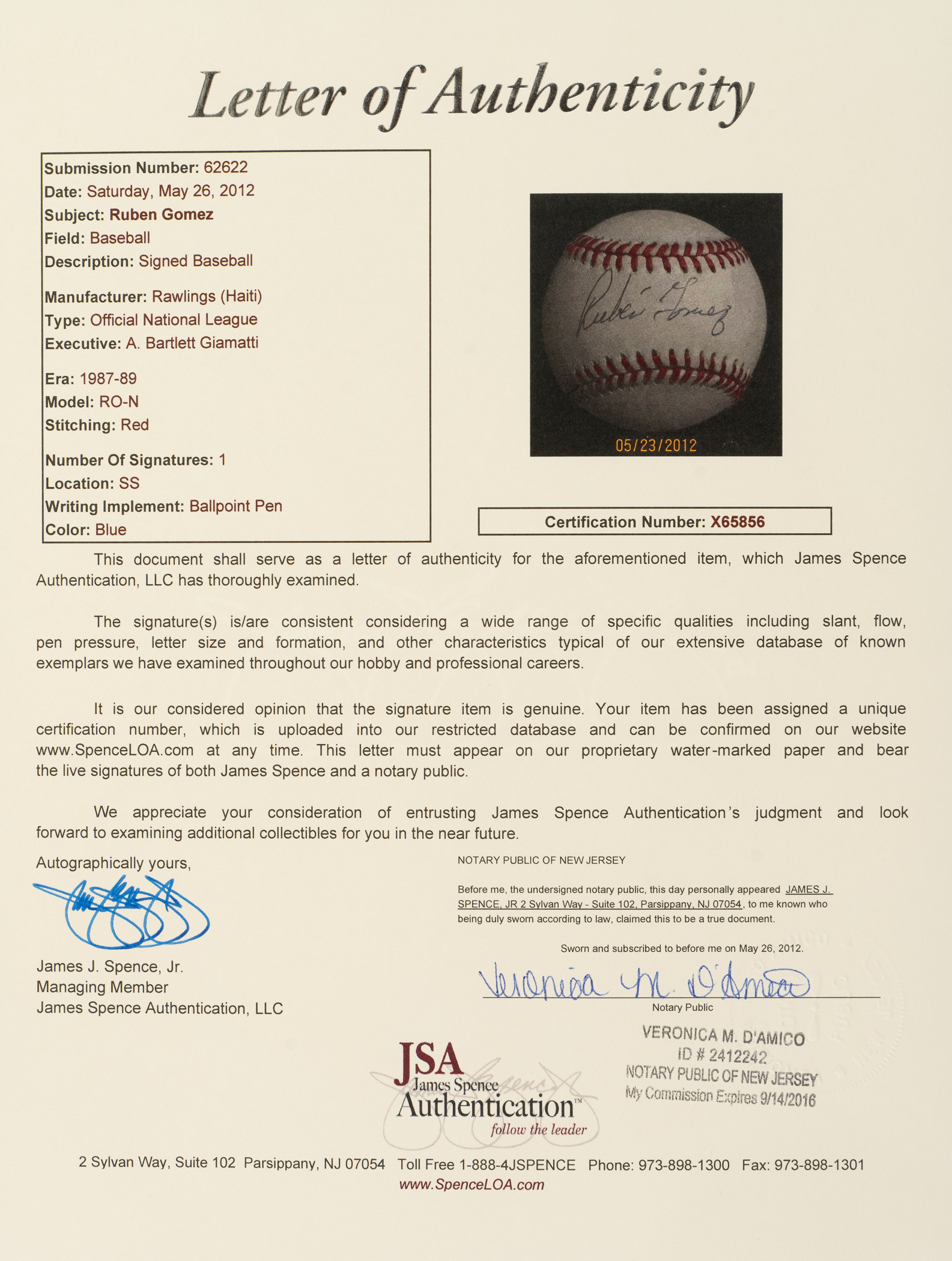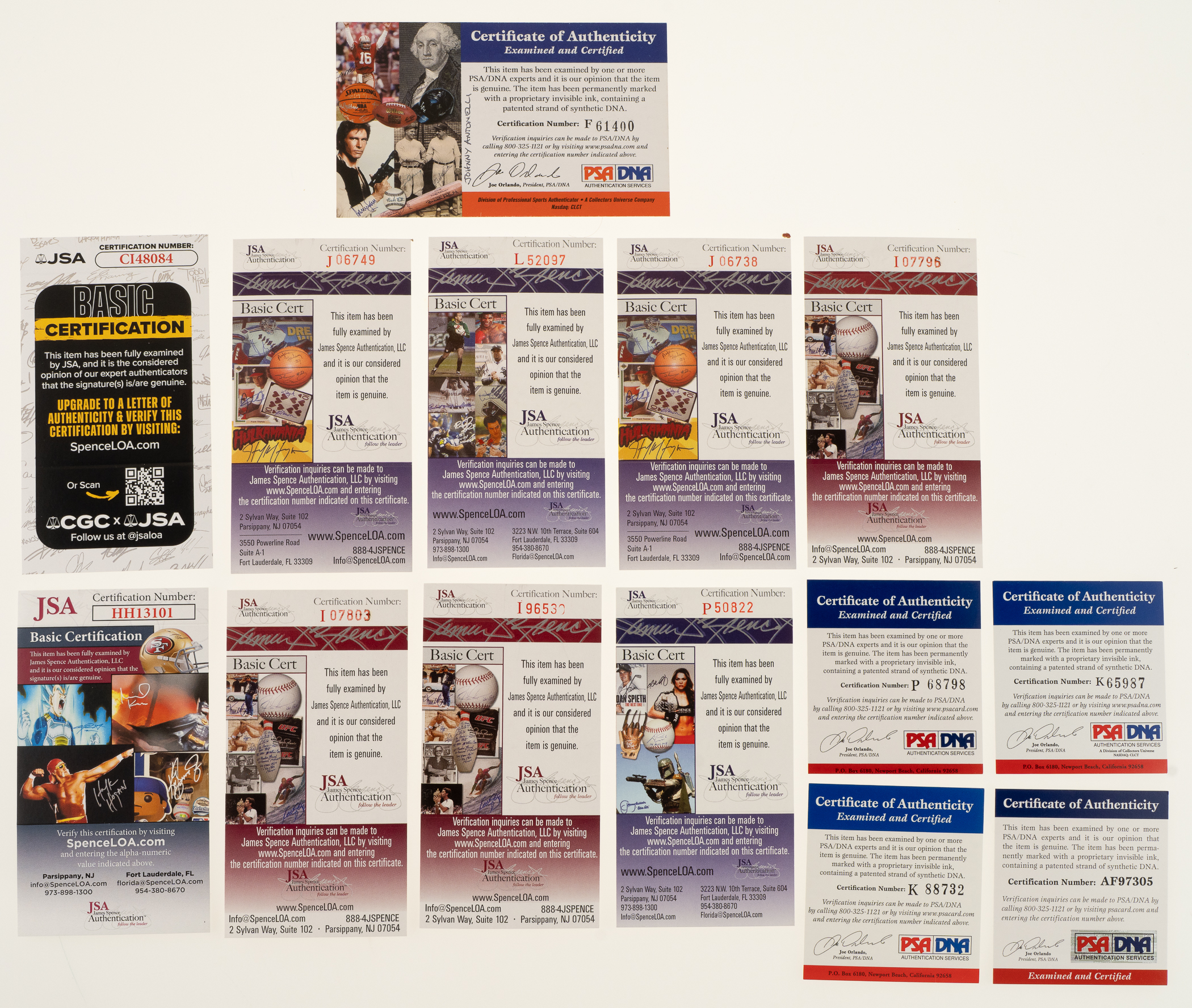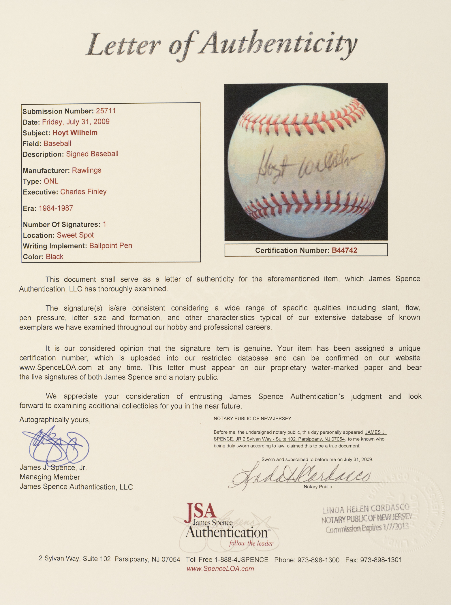 Collection of 24 single-signed baseballs consisting exclusively of former New York Giants players from the 1954 World Series Championship roster (who were not on the 1951 team). This collection is highlighted by Hoyt Wilhelm, Joe Garagiola, and many other tough-to-find signees. Unless otherwise noted, all the signatures appear on the sweet spot of an official Major or National League baseball (except for one American League and four non-Official balls) dating from the 1980s or later. The signatures have been scripted in a variety of inks. Four of the offered baseballs have full JSA LOAs while fourteen others have basic individual authentication from JSA or PSA/DNA. Most of the balls have varying degrees of age toning. Otherwise all are in Excellent to Mint or better condition overall. In this auction we are offering two other New York Giants signed baseball collections, one from the 1951 NL Championship roster and one from various years spanning the 1950s. This collection consists of the following: Joe Amalfitano, Johnny Antonelli ("2x20 1954 21-7 2.30 ERA, 1956 20-13 2.86 ERA"), Foster Castleman ("1954 World Series Champions, New York Giants"), Hoot Evers, Joe Garagiola, Bill Gardner, Harvey Gentry, Paul Giel, Ruben Gomez, Marv Grissom, Bobby Hofman, Ray Katt, Bob Lennon, Don Liddle, John McCall, Ramon Monzant, Mario "Babe" Picone (side panel), Dusty Rhodes ("1954 WS MVP, Babe Ruth Award NY Giants #26"), Eric Rodin, Ron Samford, Ebba St. Claire, Bill Taylor, Hoyt Wilhelm, and Al Worthington. Total: 24 signed baseballs. Auction LOA from James Spence/JSA. The size/weight of this item requires that there will be an additional shipping charge for this lot.