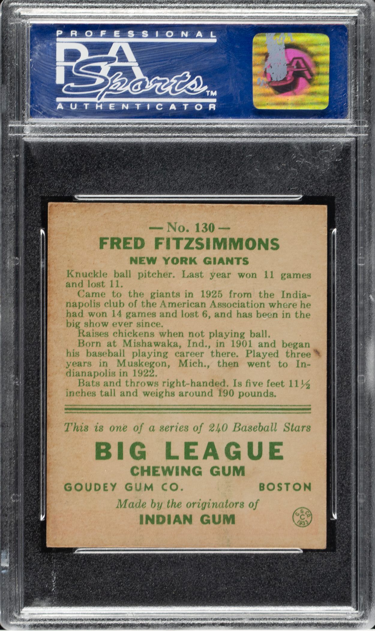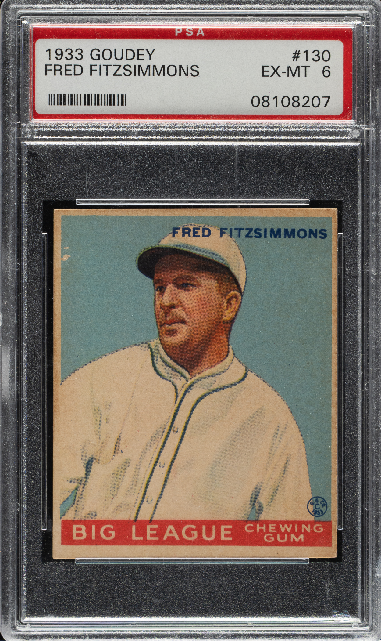 Lot # 1005: 1933 R319 Goudey #130 Fred Fitzsimmons PSA EX-MT 6