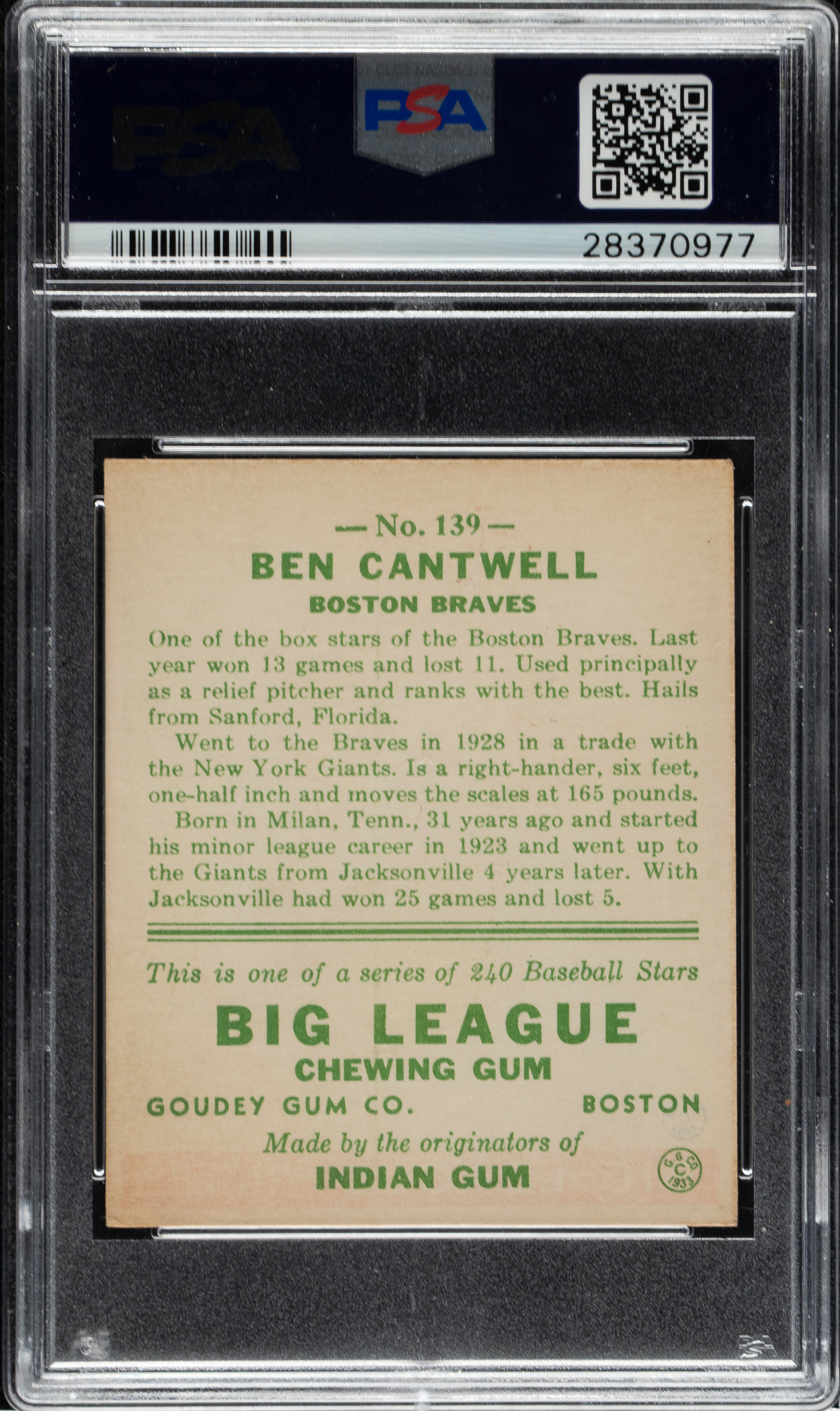 Graded EX+ 5.5 by PSA. Boston Braves.