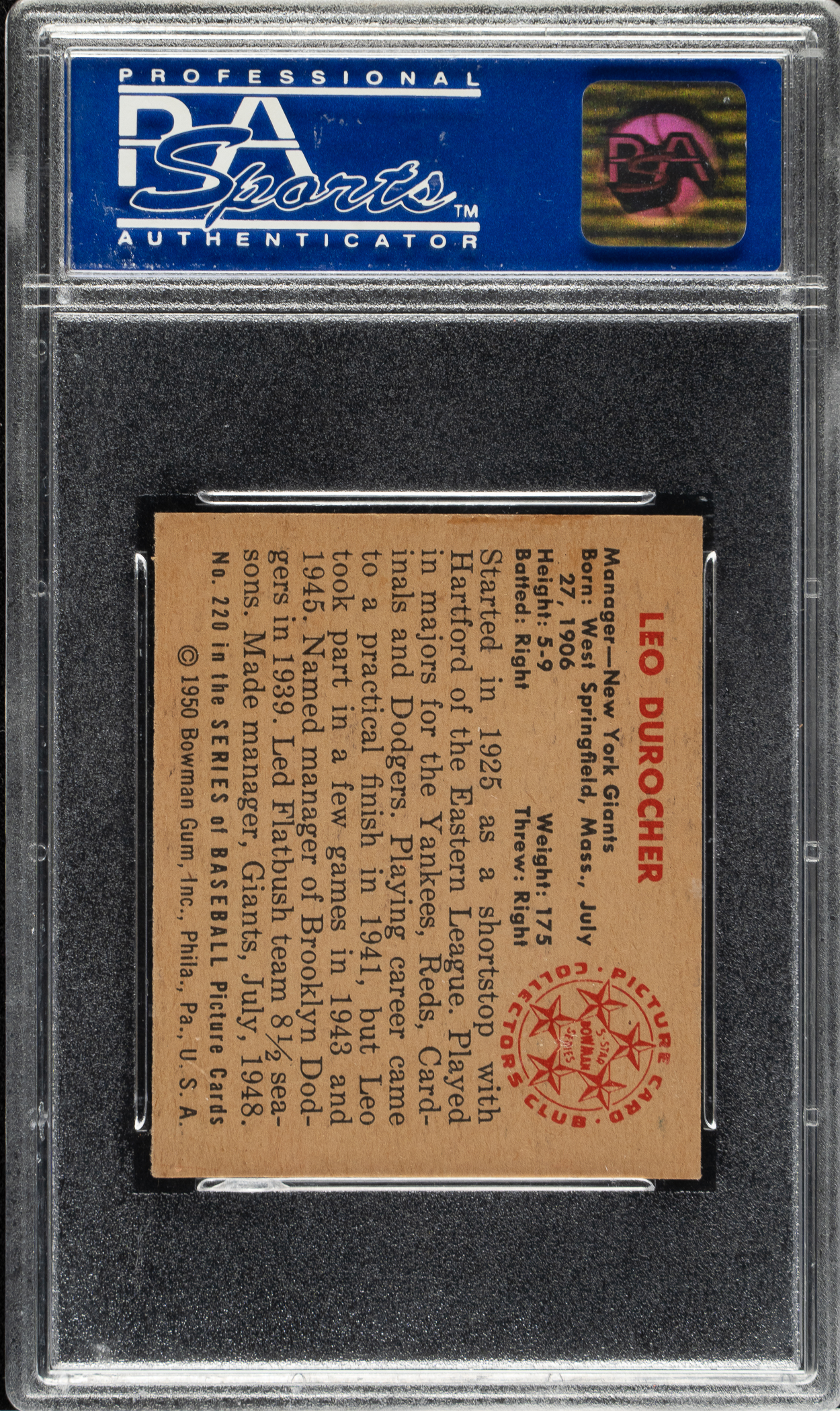 Graded NM 7 by PSA. New York Giants Hall of Famer Leo Durocher.