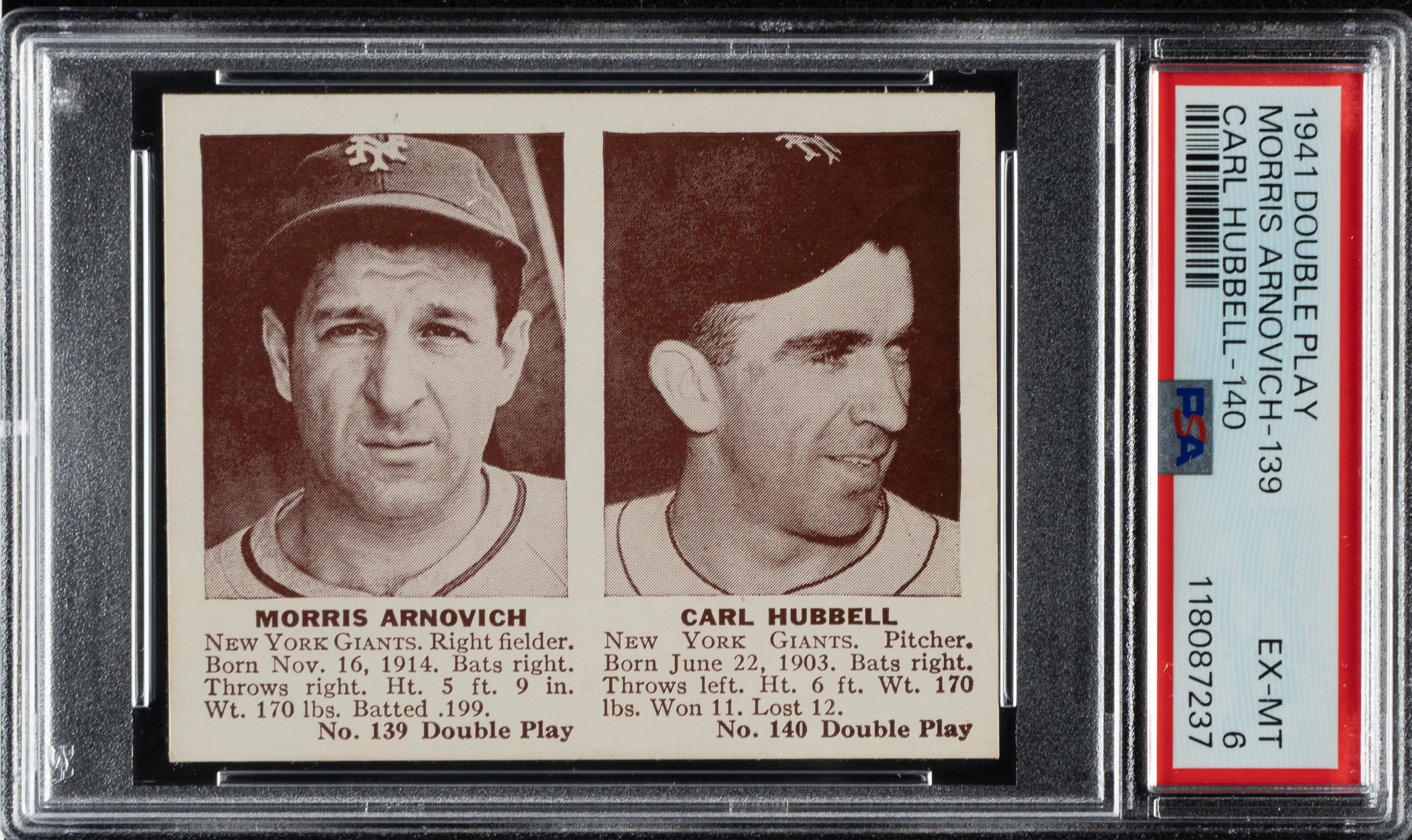 Graded EX-MT 6 by PSA. New York Giants Hall of Famer Carl Hubbell.