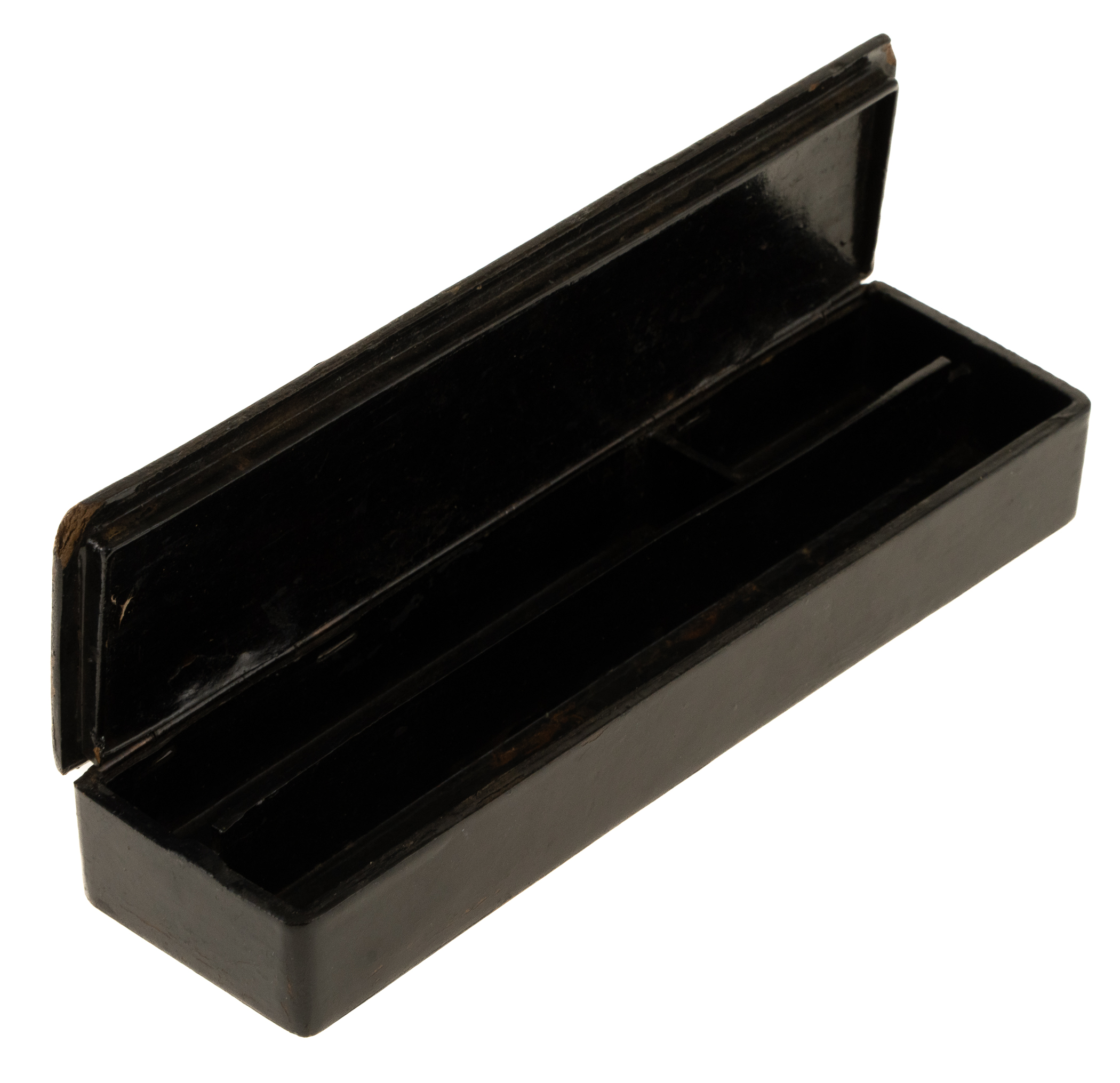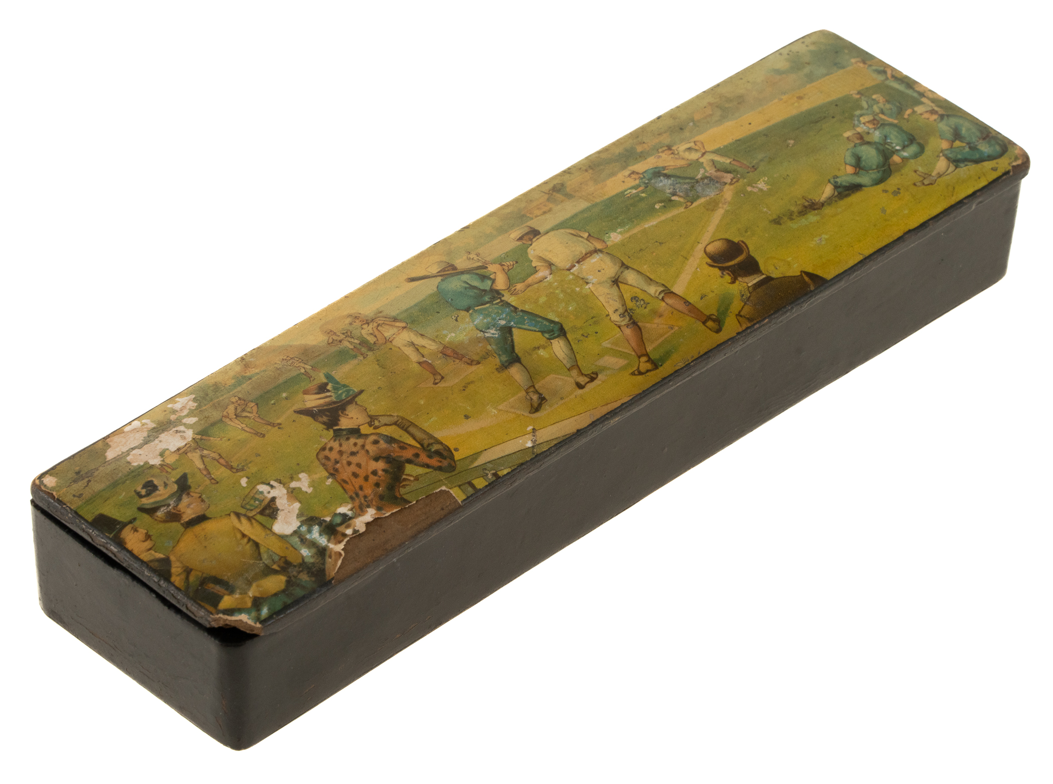 Rare 1880s children's pencil box displaying a beautiful full-color baseball illustration on its lid. The illustration on this box depicts a game in progress with several spectators. The case is designed with two or three separate compartments to hold pencils and other writing implements. The case displays moderate wear, including chipping to the painted surface and a chipped bottom-left corner along the lid; Fair condition overall. Dimensions: 7.75 x 2 x 1.25 inches. The size/weight of this item requires that there will be an additional shipping charge for this lot.