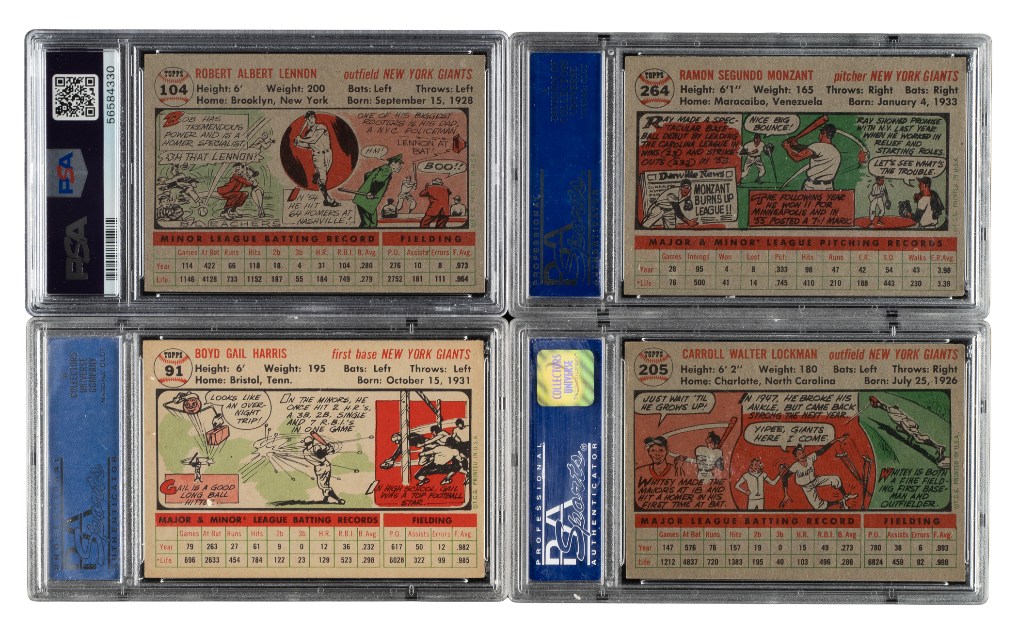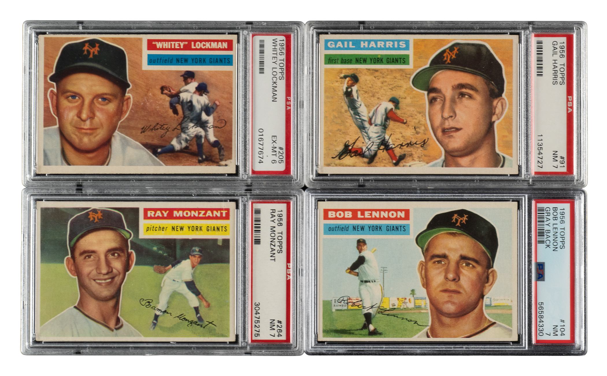 Collection of four 1956 Topps cards, each graded and encapsulated by PSA. This collection consists of the following: #91/white back (NM 7), 104/gray back (NM 7), 205 (EX-MT 6), and 264 (NM 7). Total: 4 cards.
