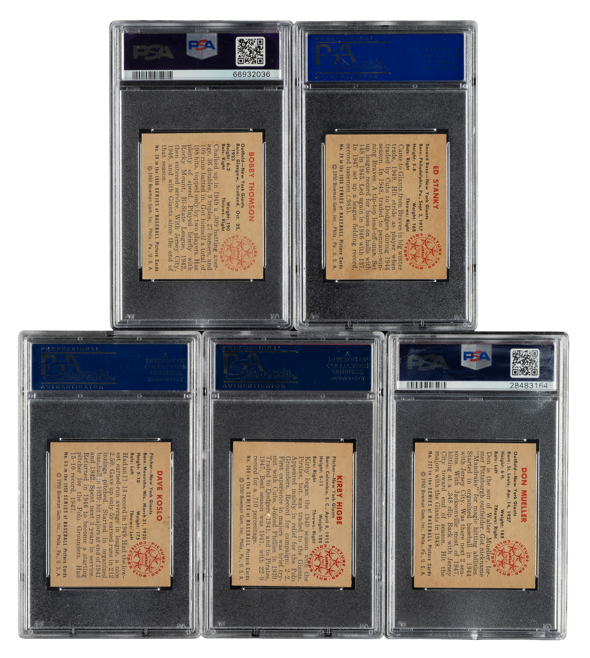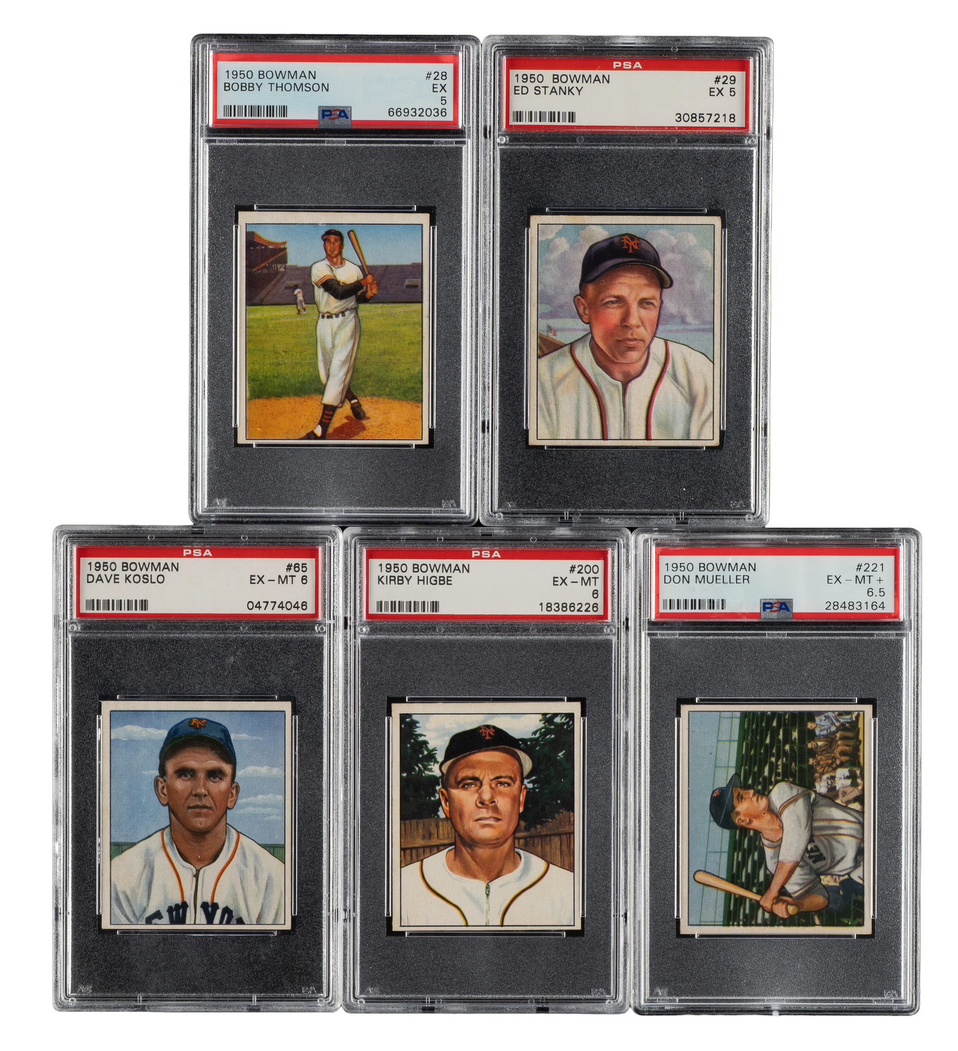 Collection of five 1950 Topps cards, each graded and encapsulated by PSA. This collection consists of the following: #28 (EX 5), 29 (EX 5), 65 (EX-MT 6), 200 (EX-MT 6), and 221 (EX-MT+ 6.5). Total: 5 cards.