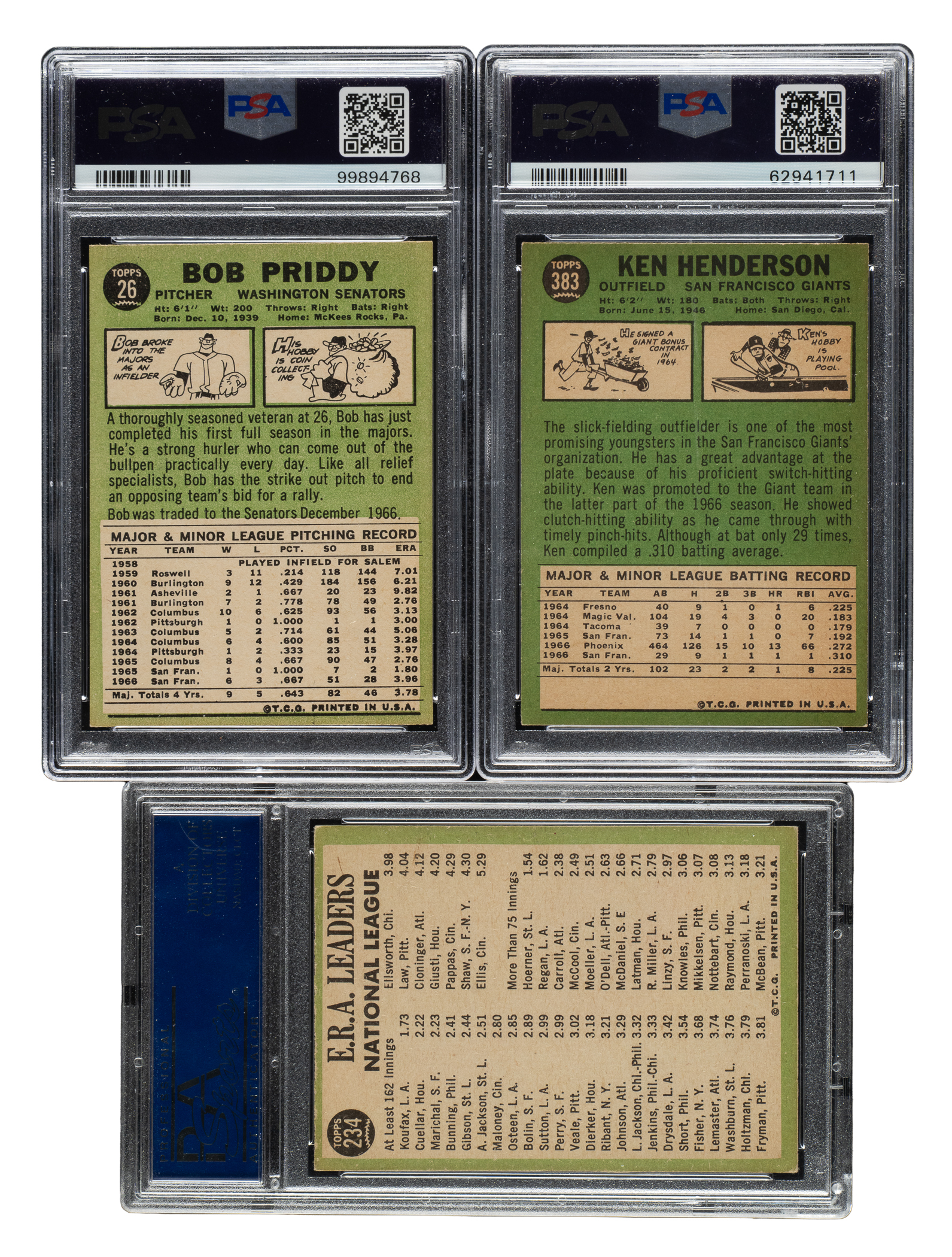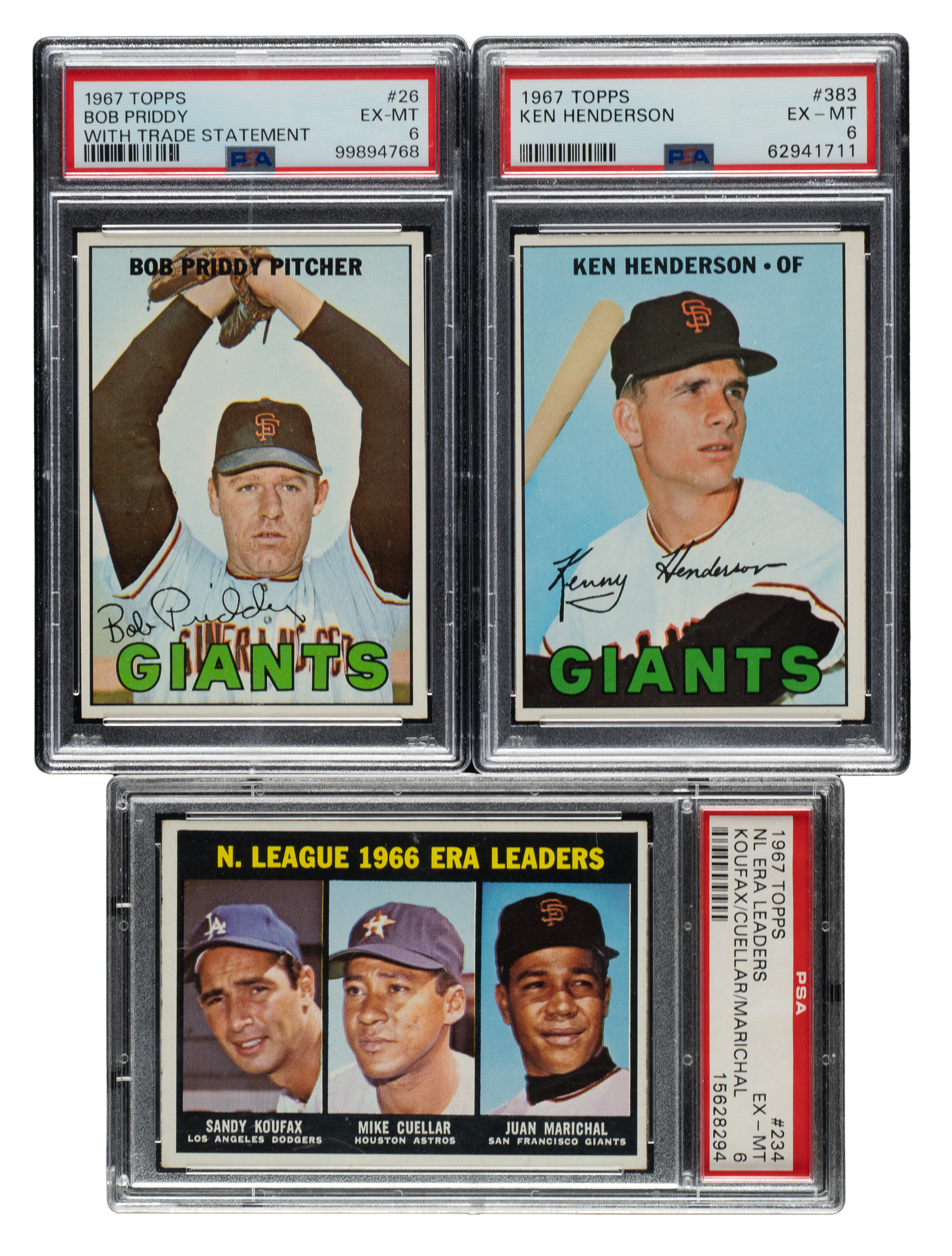 Trio of 1967 Topps cards, each graded and encapsulated EX-MT 6 by PSA. This trio consists of the following: #26/trade statement under bio, 234 NL ERA Leaders with Koufax/Marichal, and 383. Total: 3 cards.