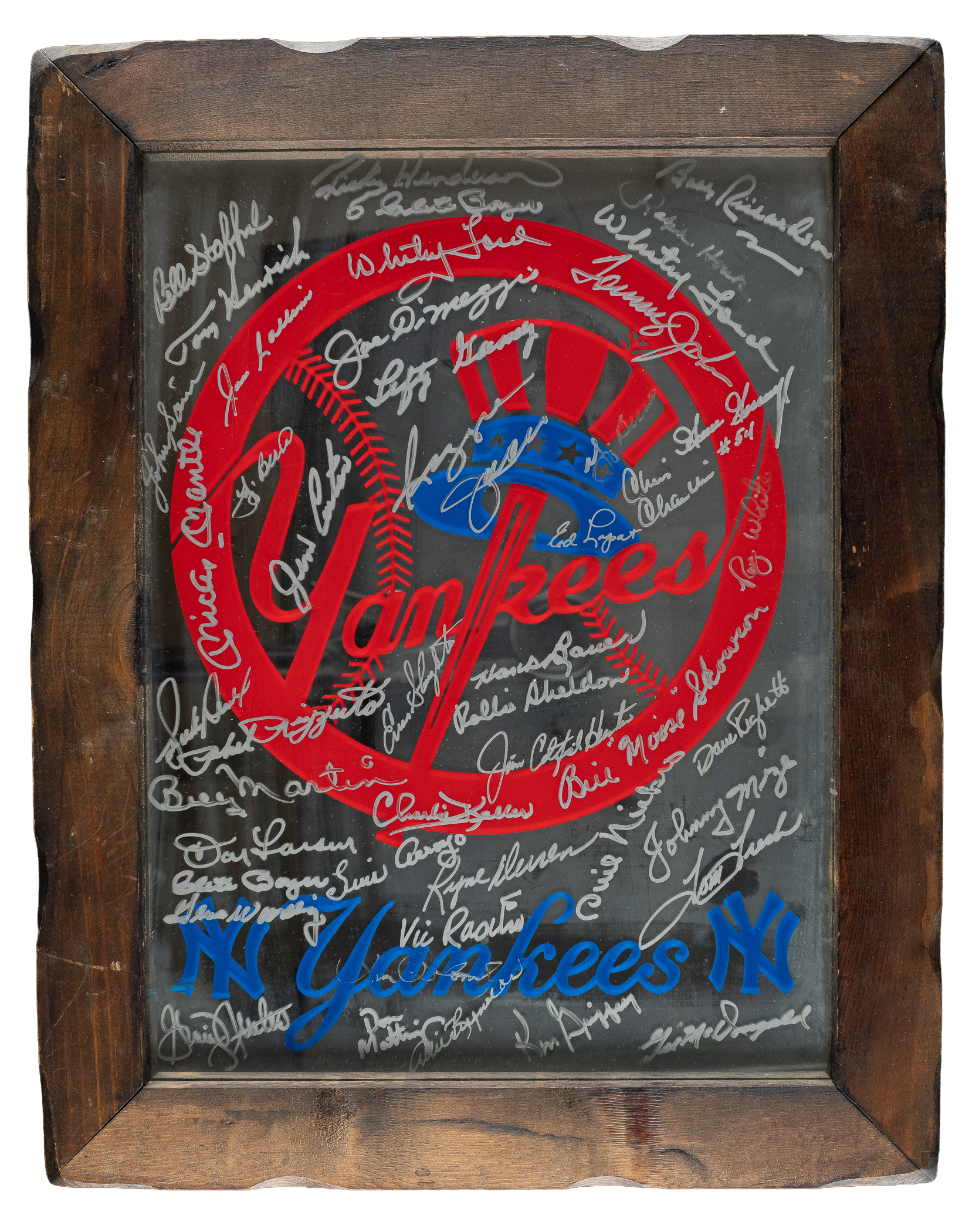 Presented is a unique "New York Yankees" mirror signed in white paint-pen by 47 former New York Yankees. This is one of the ultimate New York Yankees signed display pieces, and we cannot recall having ever seen another multi-signed mirror with this many signatures. Featured on this mirror are the signatures of Yankee players past and present, including Mantle, DiMaggio, Ford (twice), Berra (twice), Rizzuto, Gomez, R. Jackson, Gossage, R. Henderson, Slaughter, B. Martin, Hunter, Mize, Niekro, Mattingly, Nettles, Dent, Stafford, Henrich, Boyer (twice), Sain, Richardson, Houk, John, Collins, Chambliss, Lopat, Coates, Larsen, Woodling, Bauer, Arroyo, Keller, Sheldon, R. White, Skowron, Righetti, Tresh, Duren, Reynolds, Bouton, Raschi, McDougald, and Griffey. The mirror is in Excellent to Mint condition and is framed to total dimensions of 15 x 19 inches. Auction LOA from James Spence/JSA. The size/weight of this item requires that there will be an additional shipping charge for this lot.