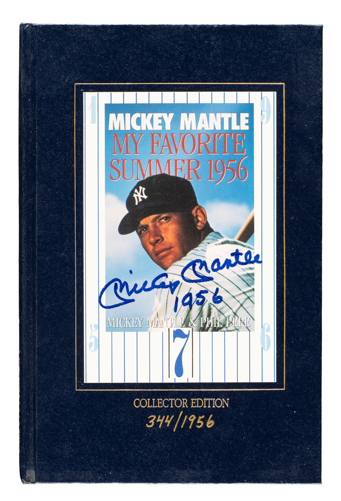 New York Yankees Hall of Famer Mickey Mantle signed book. Mantle has scripted his name in blue Sharpie across his image on the cover, below which he has added the year, "1956," which was his Triple Crown season. The "Collector Edition" book is numbered 344/1956. The hardbound book (6.25 x 9.5 inches) displays light handling wear; Near Mint condition overall. Auction LOA from James Spence/JSA.