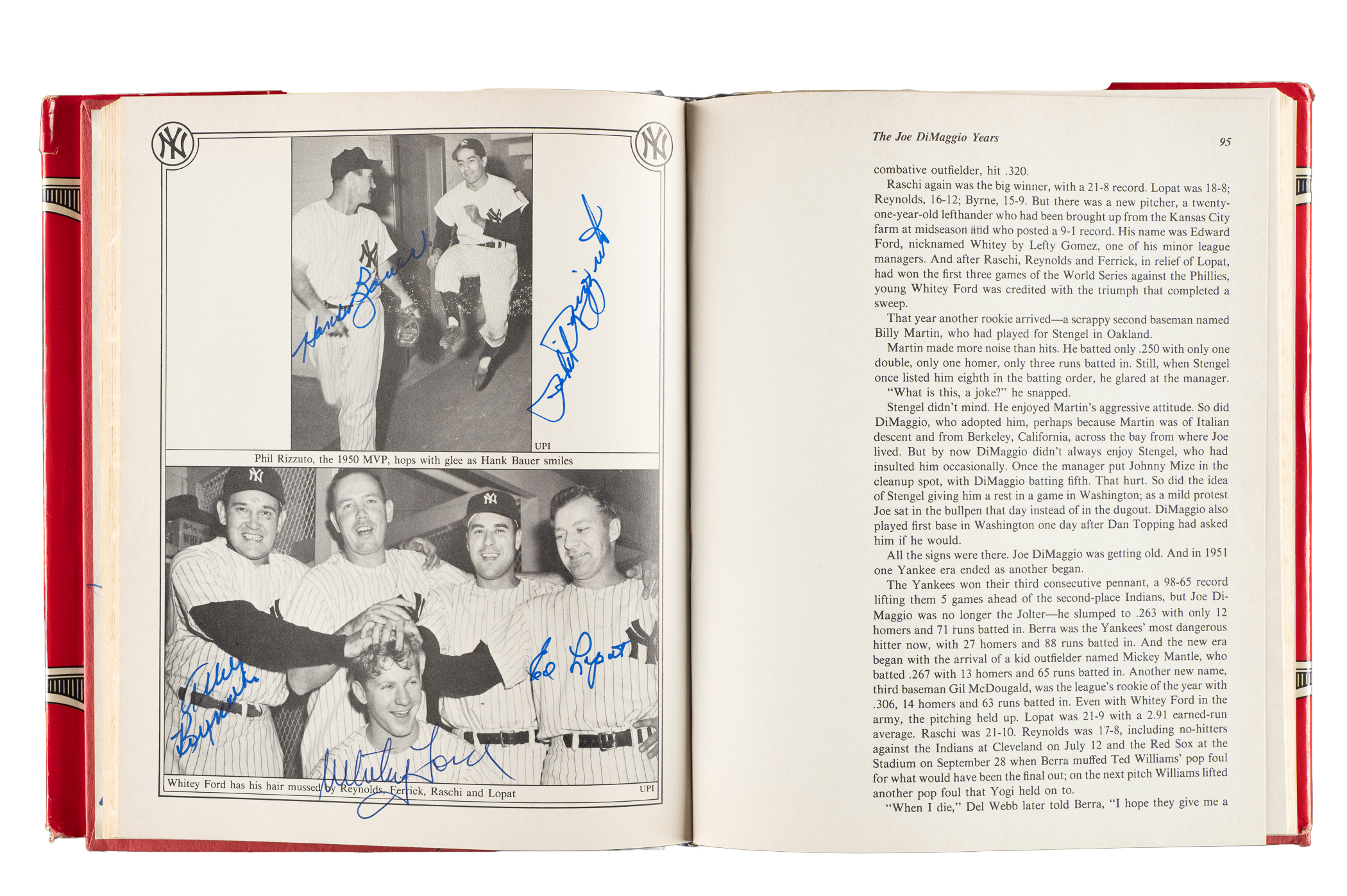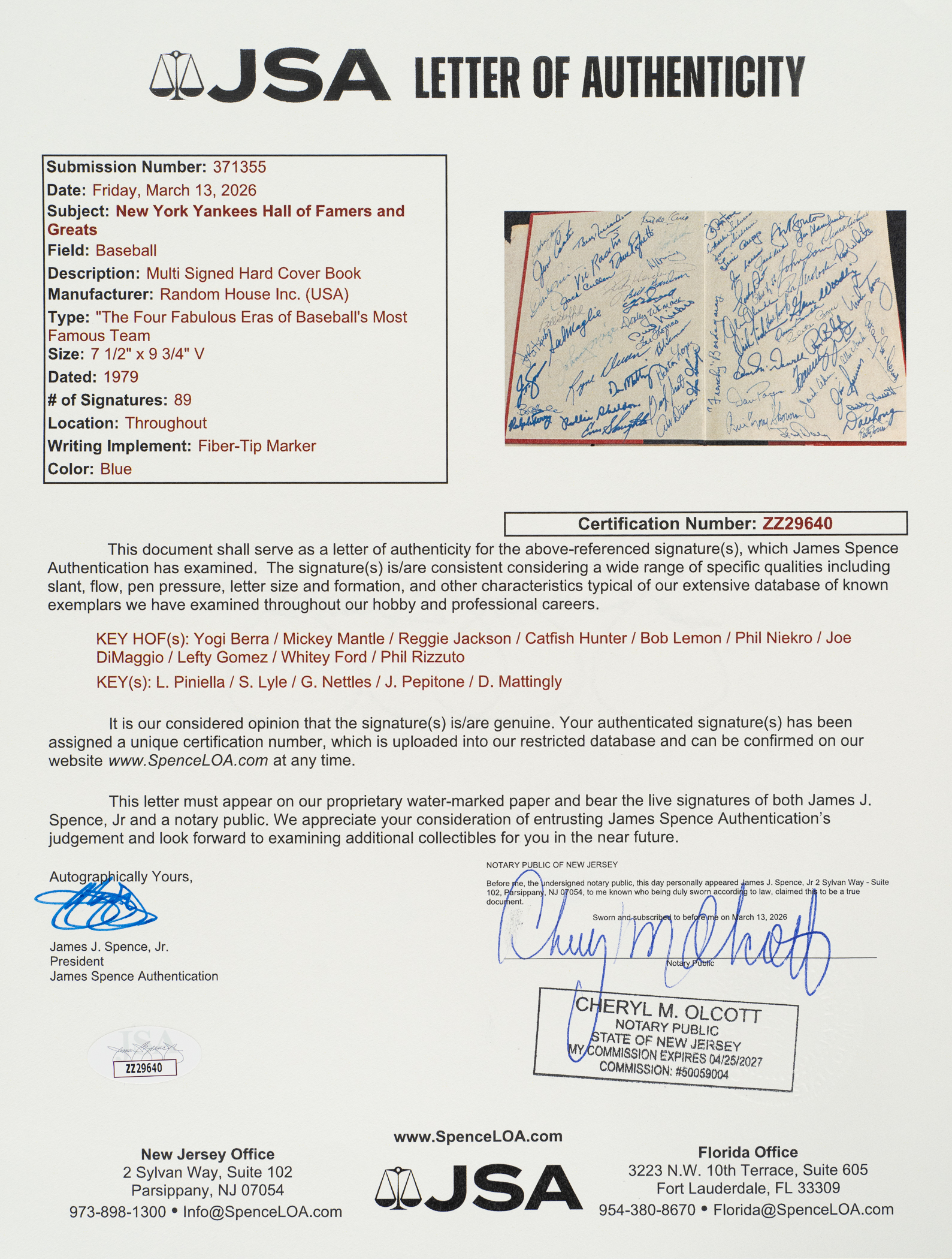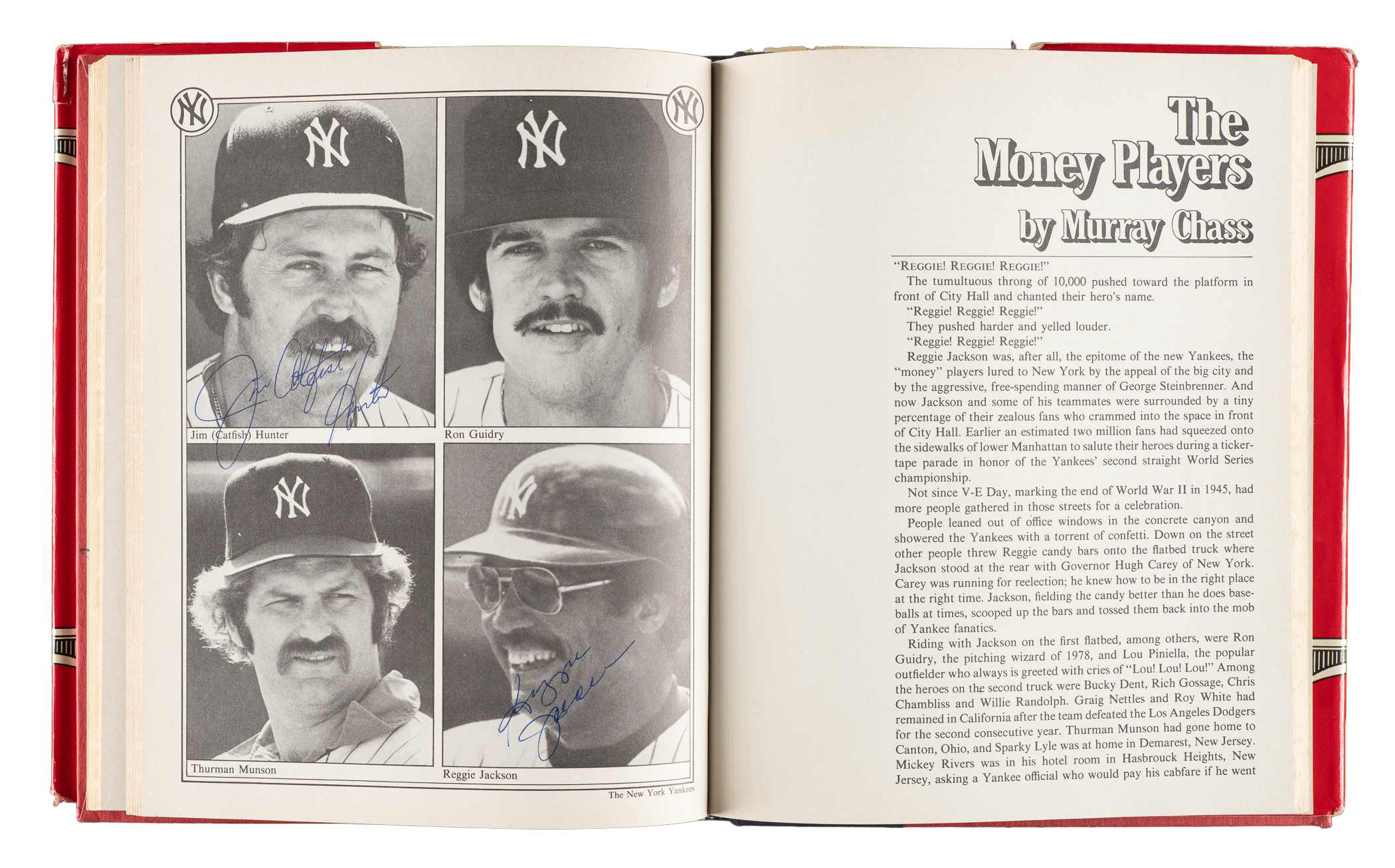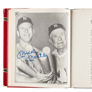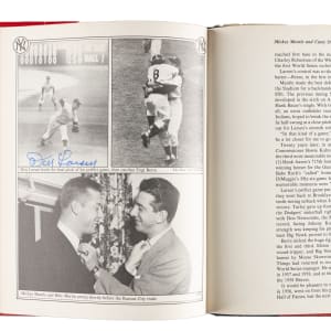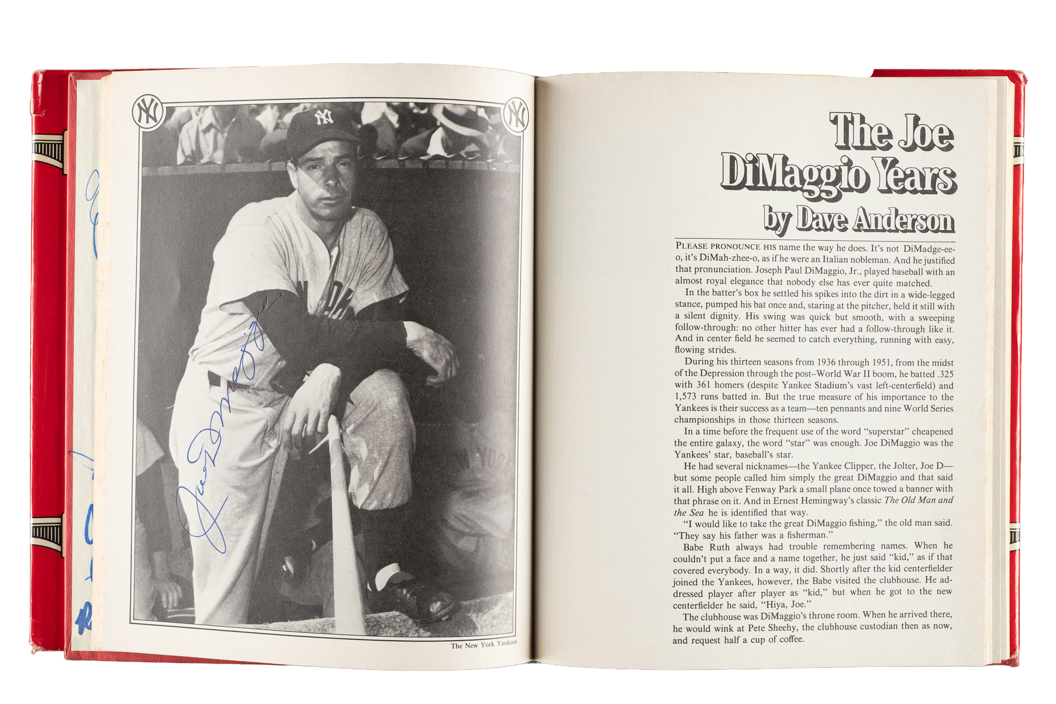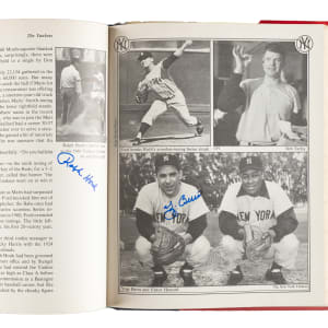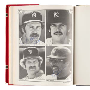 1979 The Yankees: The Four Fabulous Eras of Baseball's Most Famous Team by Dave Anderson, Murray Chass, Robert Creamer, and Harold Rosenthal featuring 80+ signatures. Several players have signed multiple times. The signatures have been scripted along the inside cover and pages in almost exclusively blue marker. Key individuals who have signed include Berra, DiMaggio, Mantle, Gomez, Mize, Slaughter, Rizzuto, Ford, Martin, Hunter, Jackson, Mattingly, Henderson, Niekro, Lemon, Gossage, Larsen, Pepitone, Nettles, Righetti, Lyle, Dent, and Piniella. The hardbound book displays light-to-moderate handling wear and several tears to the original dust jacket; Very Good to Excellent condition overall. Full LOA from James Spence/JSA.