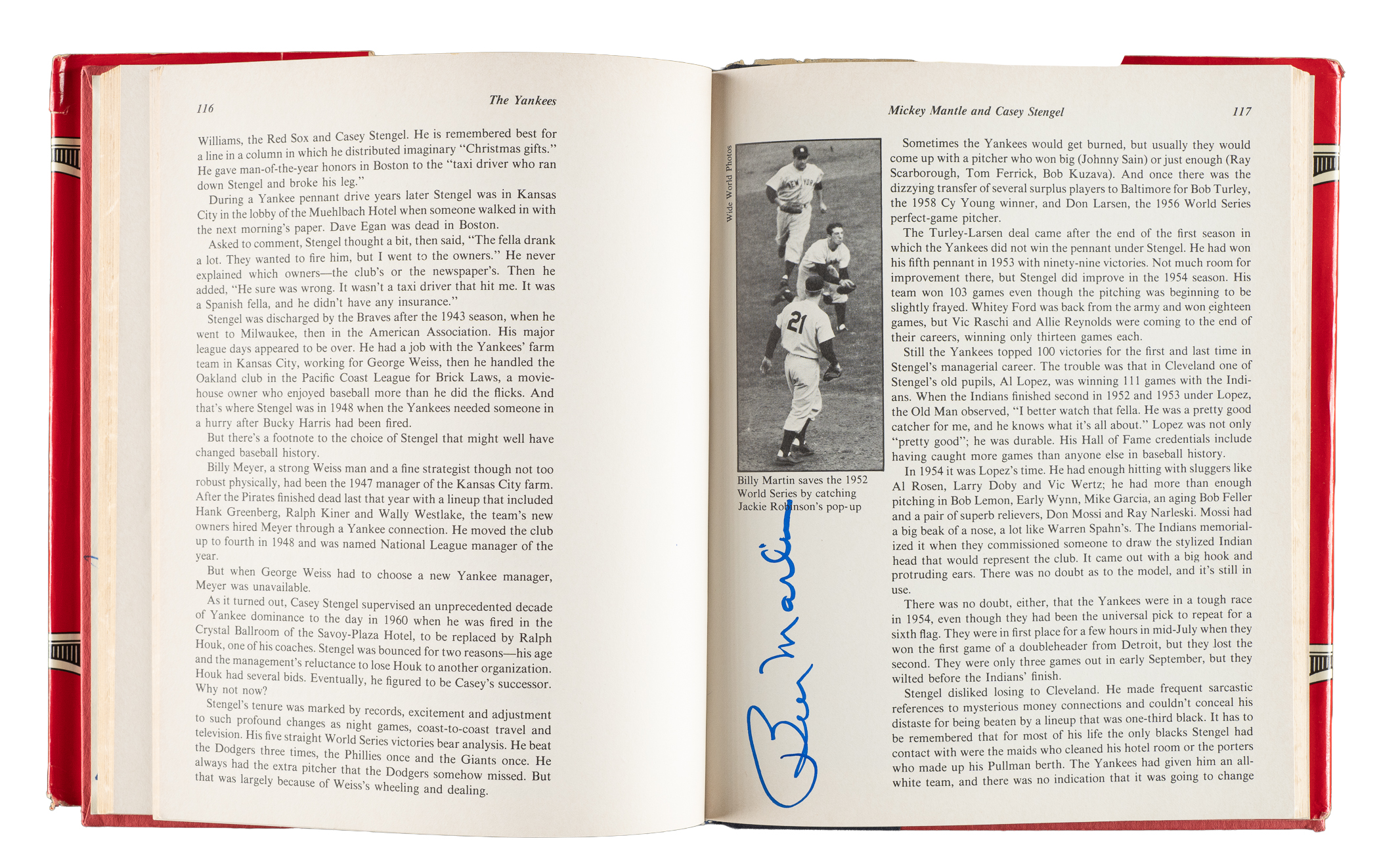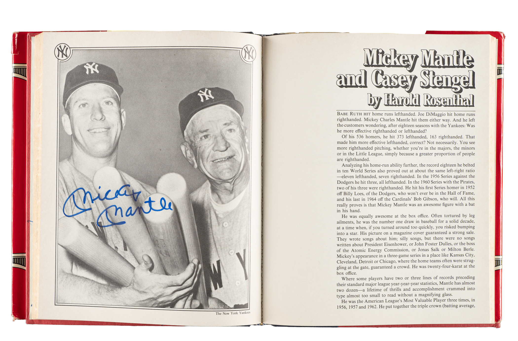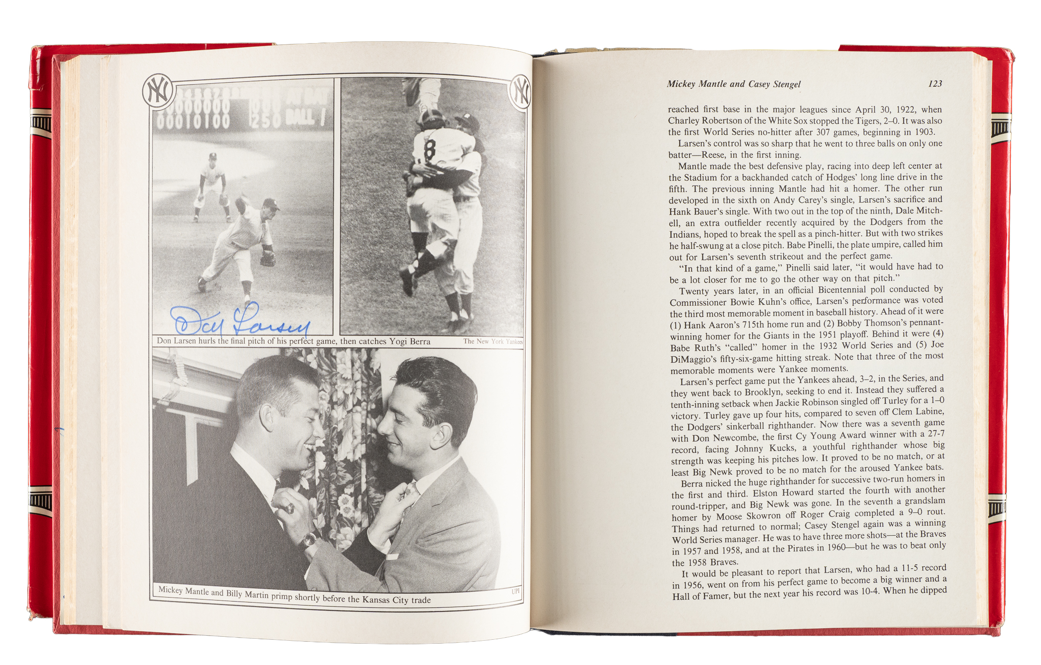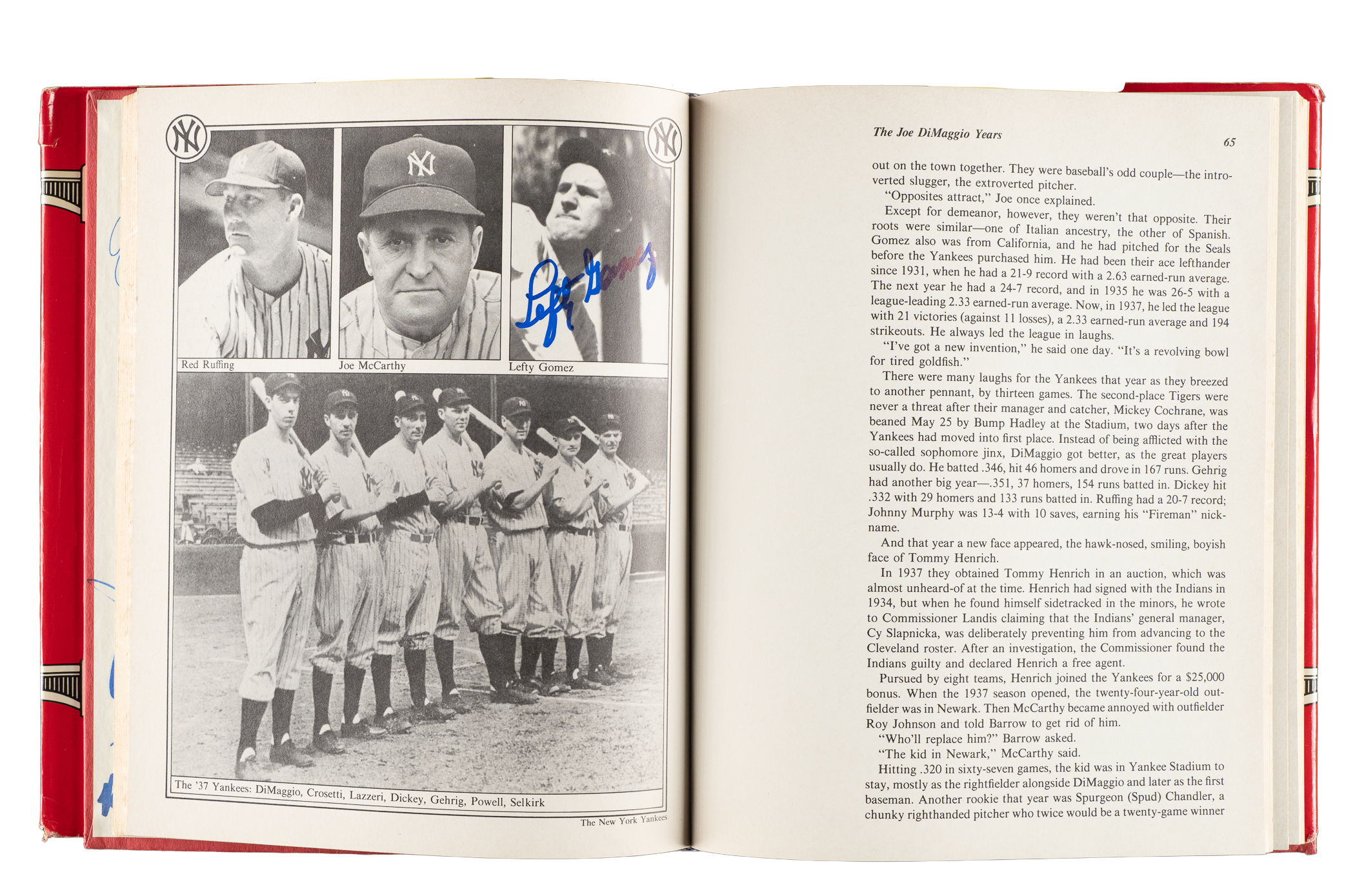 1979 The Yankees: The Four Fabulous Eras of Baseball's Most Famous Team by Dave Anderson, Murray Chass, Robert Creamer, and Harold Rosenthal featuring 80+ signatures. Several players have signed multiple times. The signatures have been scripted along the inside cover and pages in almost exclusively blue marker. Key individuals who have signed include Berra, DiMaggio, Mantle, Gomez, Mize, Slaughter, Rizzuto, Ford, Martin, Hunter, Jackson, Mattingly, Henderson, Niekro, Lemon, Gossage, Larsen, Pepitone, Nettles, Righetti, Lyle, Dent, and Piniella. The hardbound book displays light-to-moderate handling wear and several tears to the original dust jacket; Very Good to Excellent condition overall. Full LOA from James Spence/JSA.