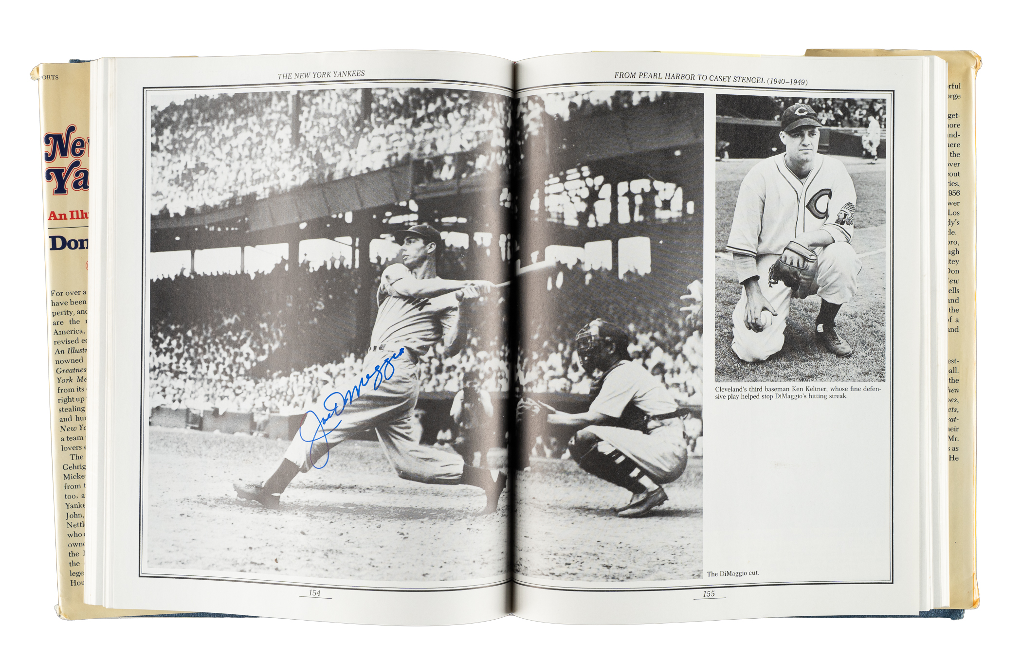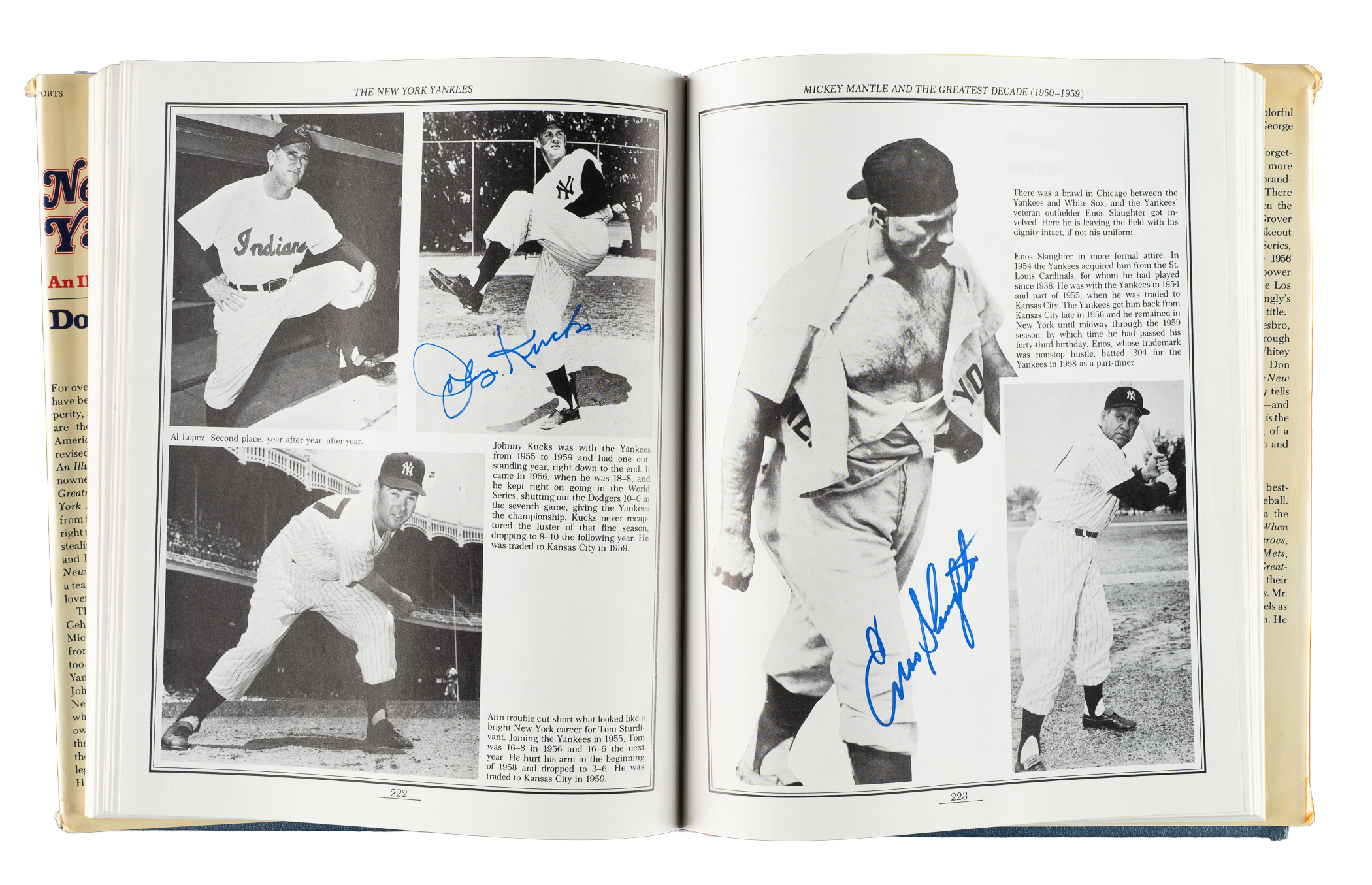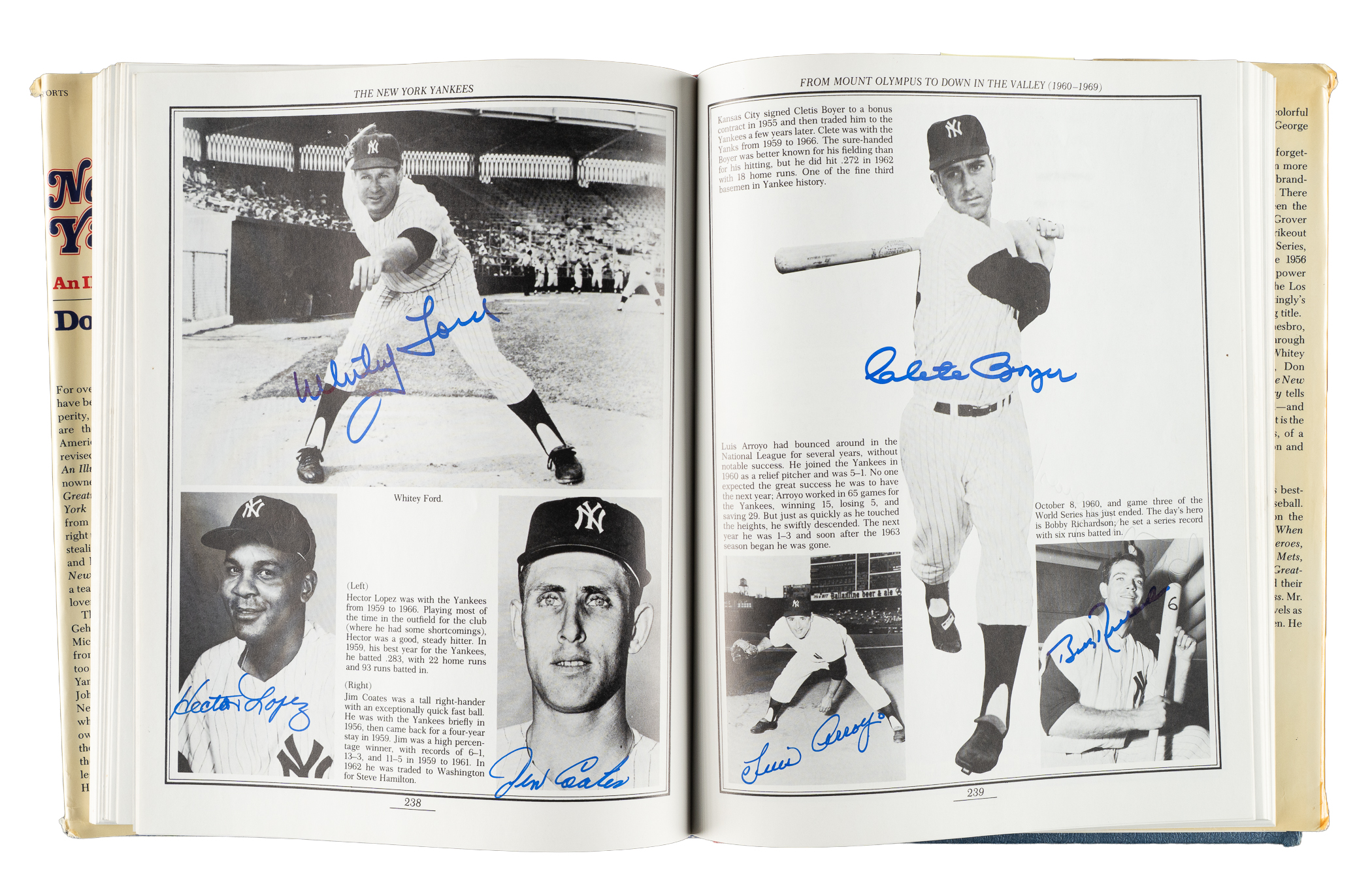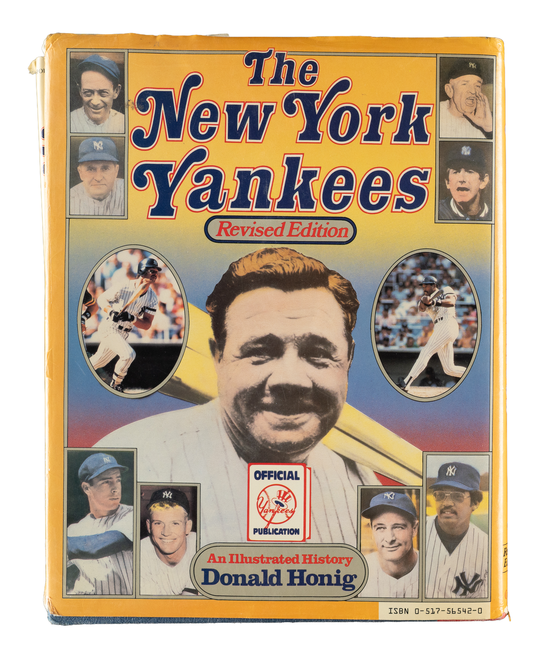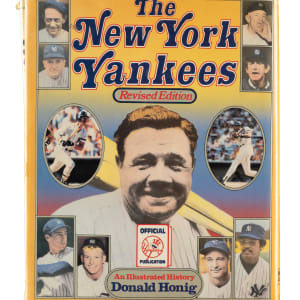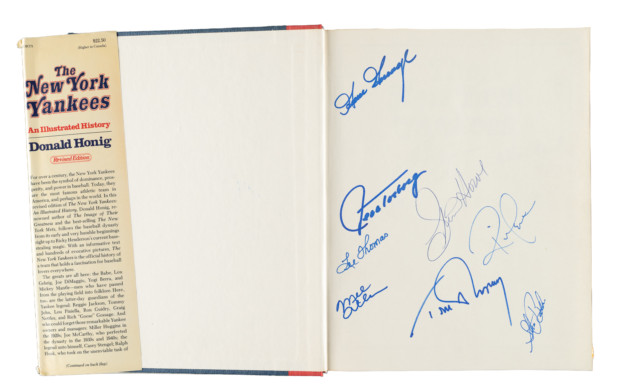 1987 The New York Yankees: An Illustrated History (Revised Edition) by Donald Honig featuring 90+ signatures. Several players have signed multiple times. The signatures have been scripted along the inside cover and pages in almost exclusively blue marker. Key individuals who have signed include Berra, DiMaggio, Gomez, Sewell, Rizzuto, Ford, Mize, Lemon, Slaughter, Larsen, Gossage, Hunter, Niekro, Murcer, S. Howe, J. Spencer, Nettles, Feller, Marichal, Doerr, and Mazeroski. The hardbound book (8-5/8 x 11-1/8 inches) displays light-to-moderate handling wear and a couple stickers affixed to the original dust jacket; Very Good to Excellent condition overall. Auction LOA from James Spence/JSA.