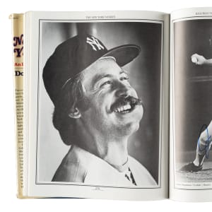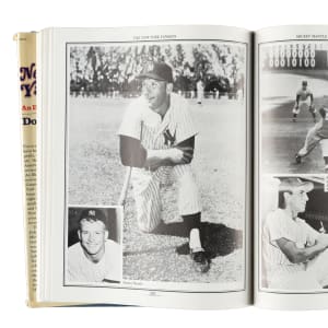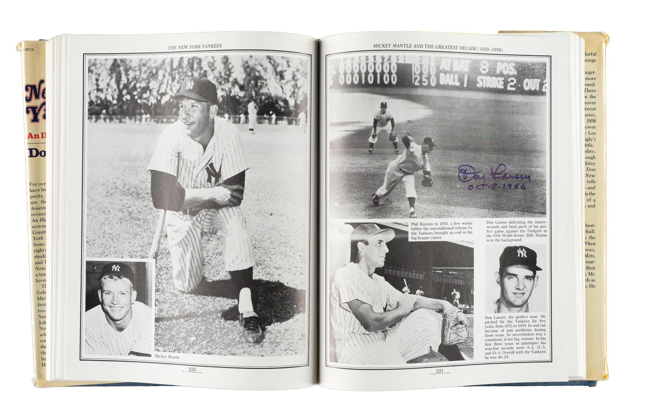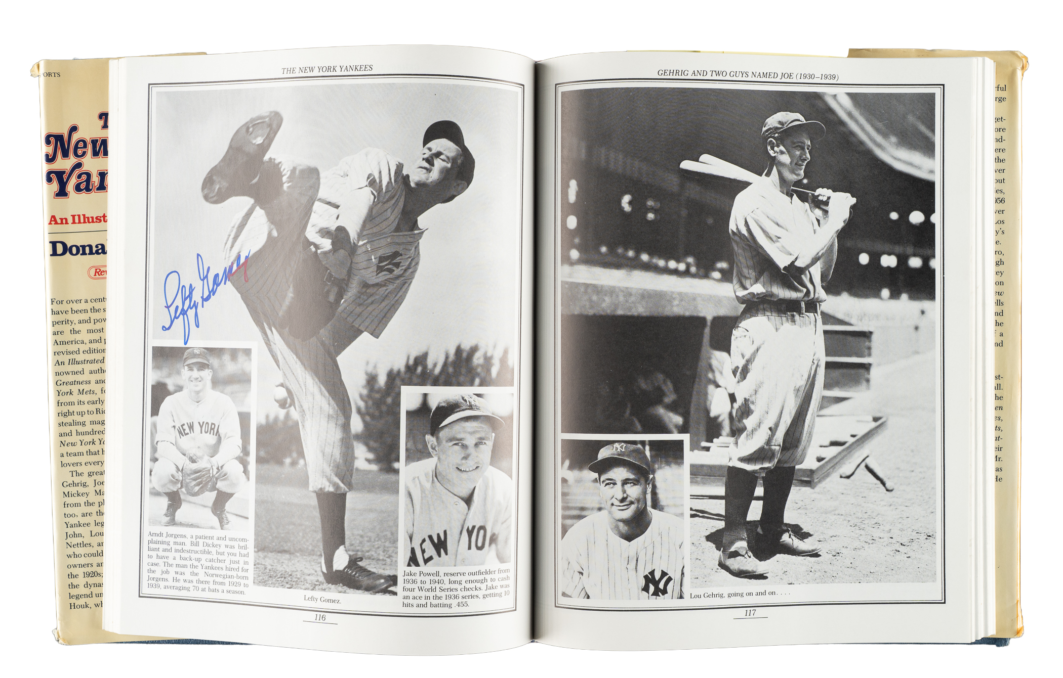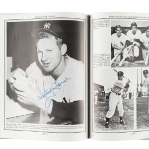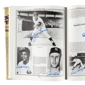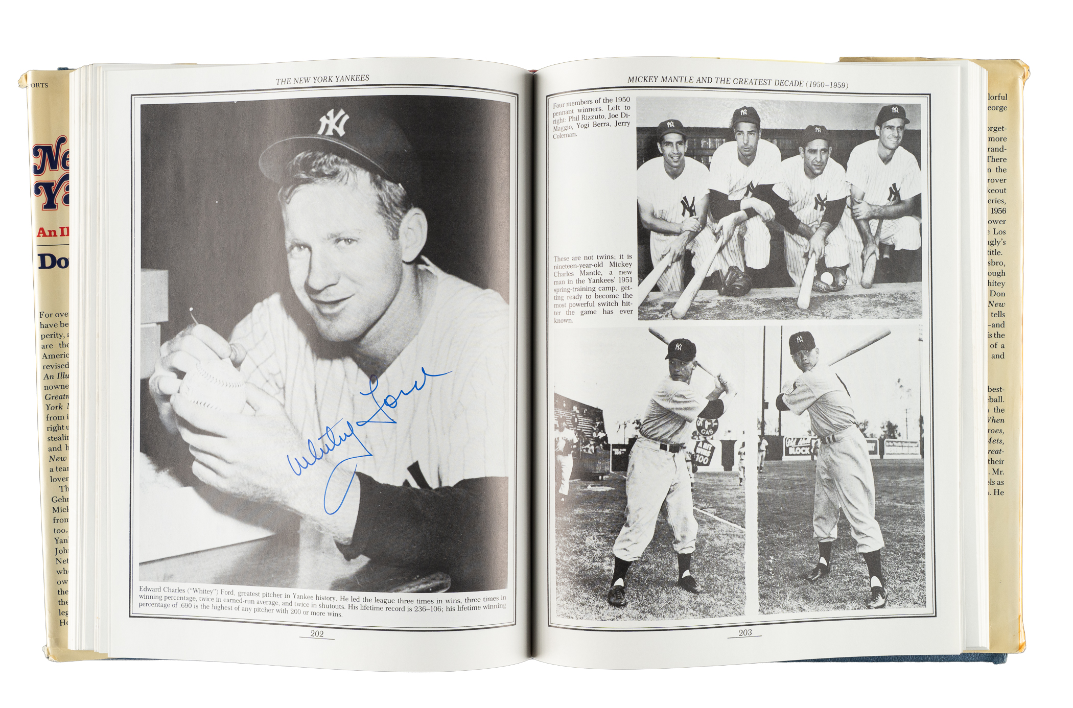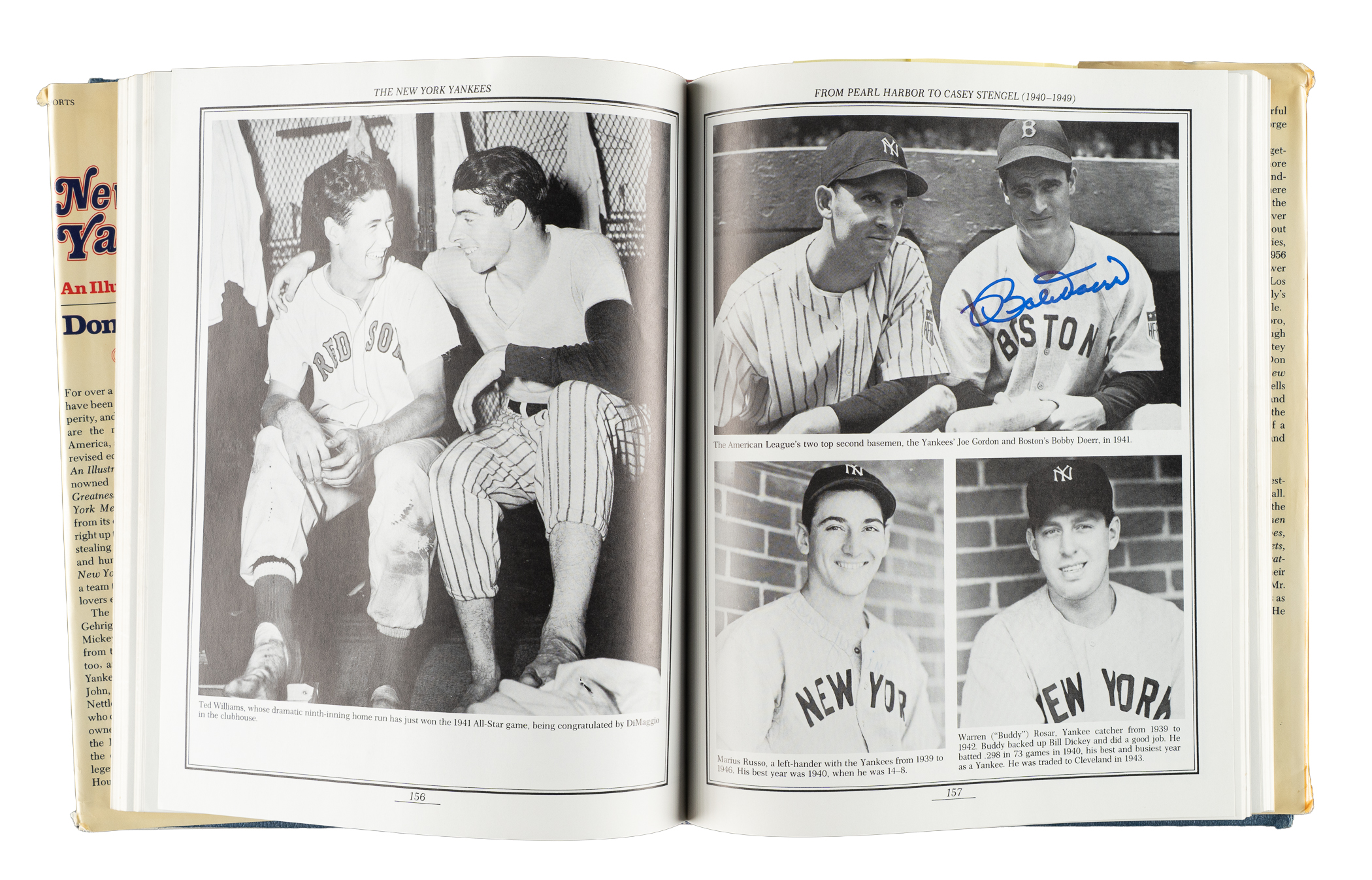 1987 The New York Yankees: An Illustrated History (Revised Edition) by Donald Honig featuring 90+ signatures. Several players have signed multiple times. The signatures have been scripted along the inside cover and pages in almost exclusively blue marker. Key individuals who have signed include Berra, DiMaggio, Gomez, Sewell, Rizzuto, Ford, Mize, Lemon, Slaughter, Larsen, Gossage, Hunter, Niekro, Murcer, S. Howe, J. Spencer, Nettles, Feller, Marichal, Doerr, and Mazeroski. The hardbound book (8-5/8 x 11-1/8 inches) displays light-to-moderate handling wear and a couple stickers affixed to the original dust jacket; Very Good to Excellent condition overall. Auction LOA from James Spence/JSA.