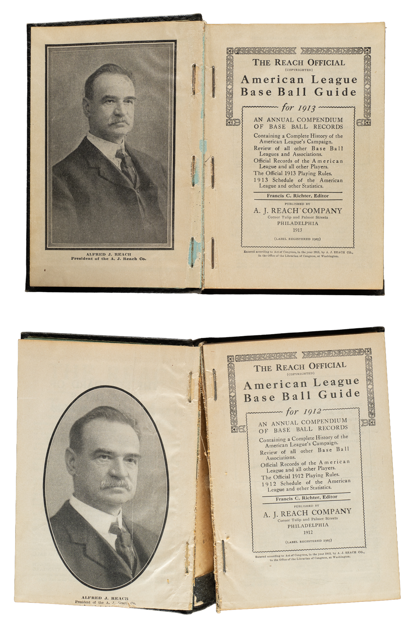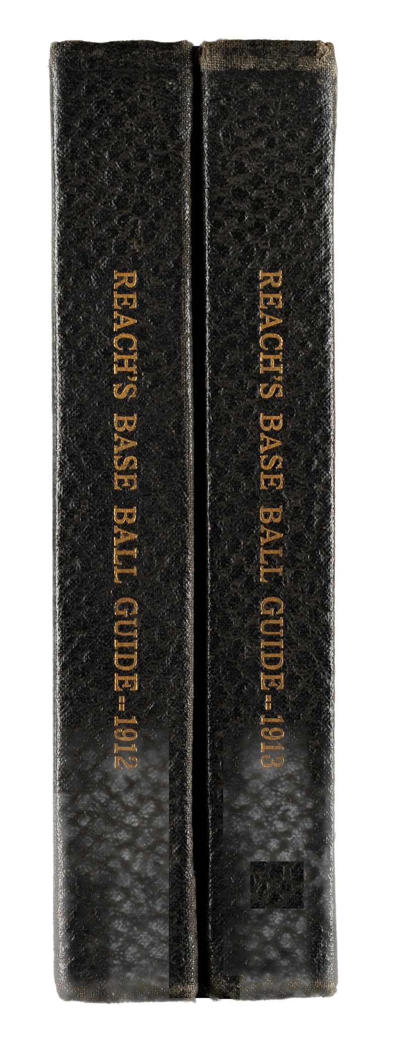 1912 and 1913 Reach American League Baseball Guide pair. Each volume is further identified by a unique handwritten fore-edge notation, with "BB 1912" on the 1912 edition and "BB 1913" on the 1913 edition. The 1912 edition displays hinge separation resulting in partial spine detachment. Fair condition overall. The 1913 edition is in Very Good condition overall. Total: 2 books. The size/weight of this item requires that there will be an additional shipping charge for this lot.