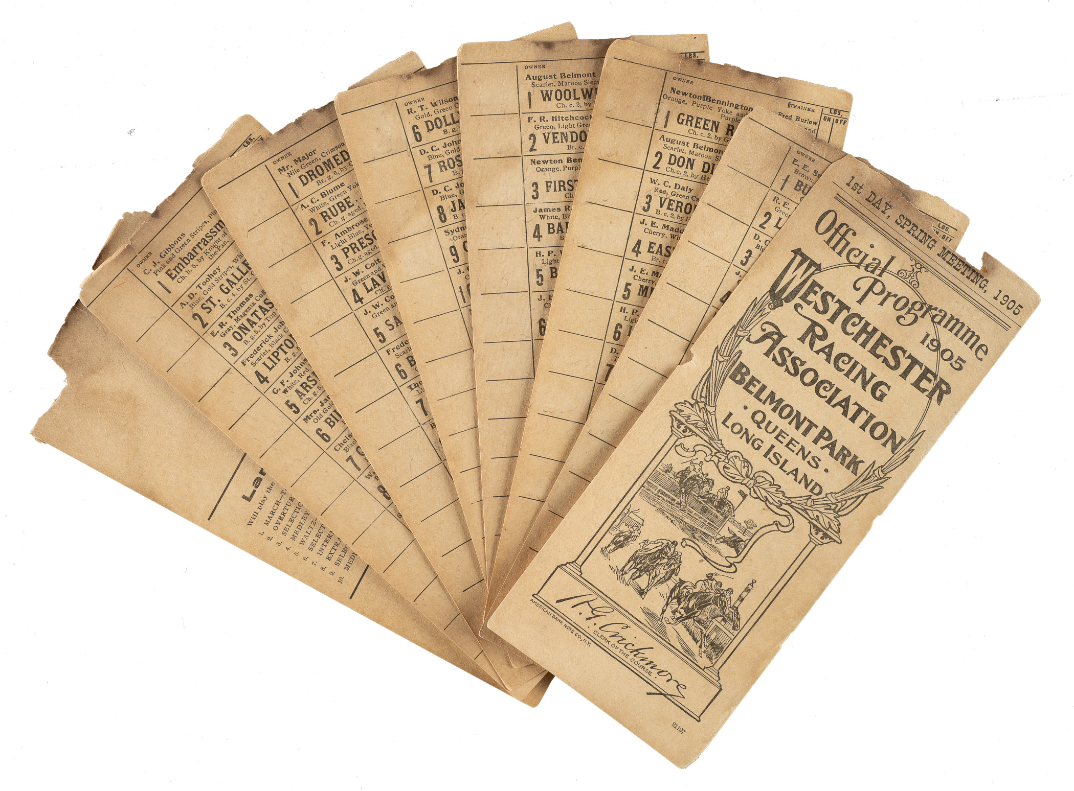 Rarely seen program from the grand opening of Belmont Park in Elmont (Long Island, New York) on May 4, 1904. According to news reports, roughly 40,000 people were in attendance. The first race of the day, the $1500 Belmont Park Inaugural, was won by 7-1 Blandy, who held off 100-1 longshot Oliver Cromwell. August Belmont II, the namesake of the Belmont Stakes and Belmont Park, owned Blendy. Later that month, Blendy ran in the Belmont Stakes (the first year Belmont Park held the race and the final leg of the Triple Crown) and finished second to the filly Tanya. The program's (3.5 x 8 inches) pages have completely split from the spine, but are all present. Additional condition flaws include mild discoloration, chipping, and creasing. Poor condition overall.