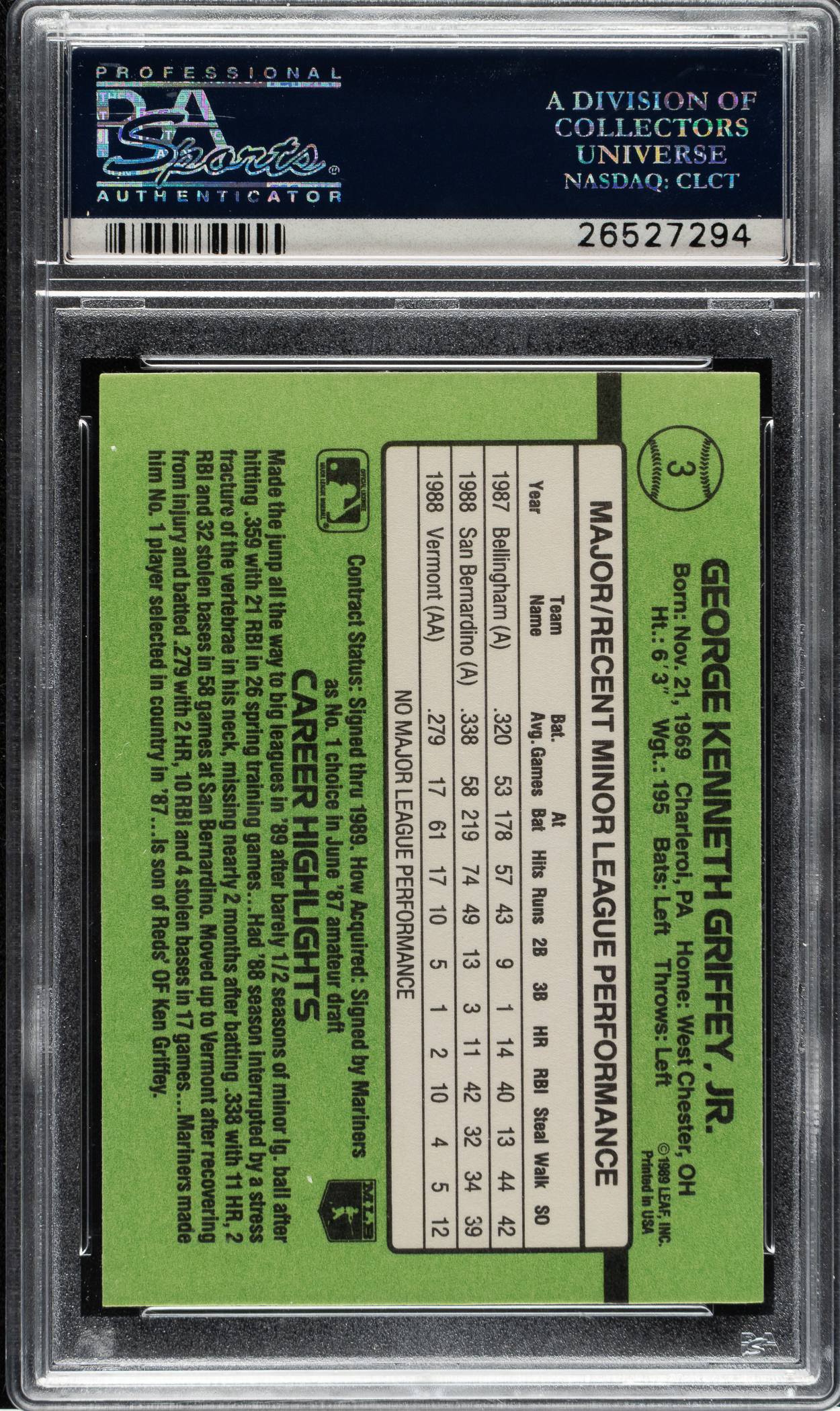 Lot # 2237: 1989 Donruss Rookies #3 Ken Griffey Jr. PSA GEM MINT 10
