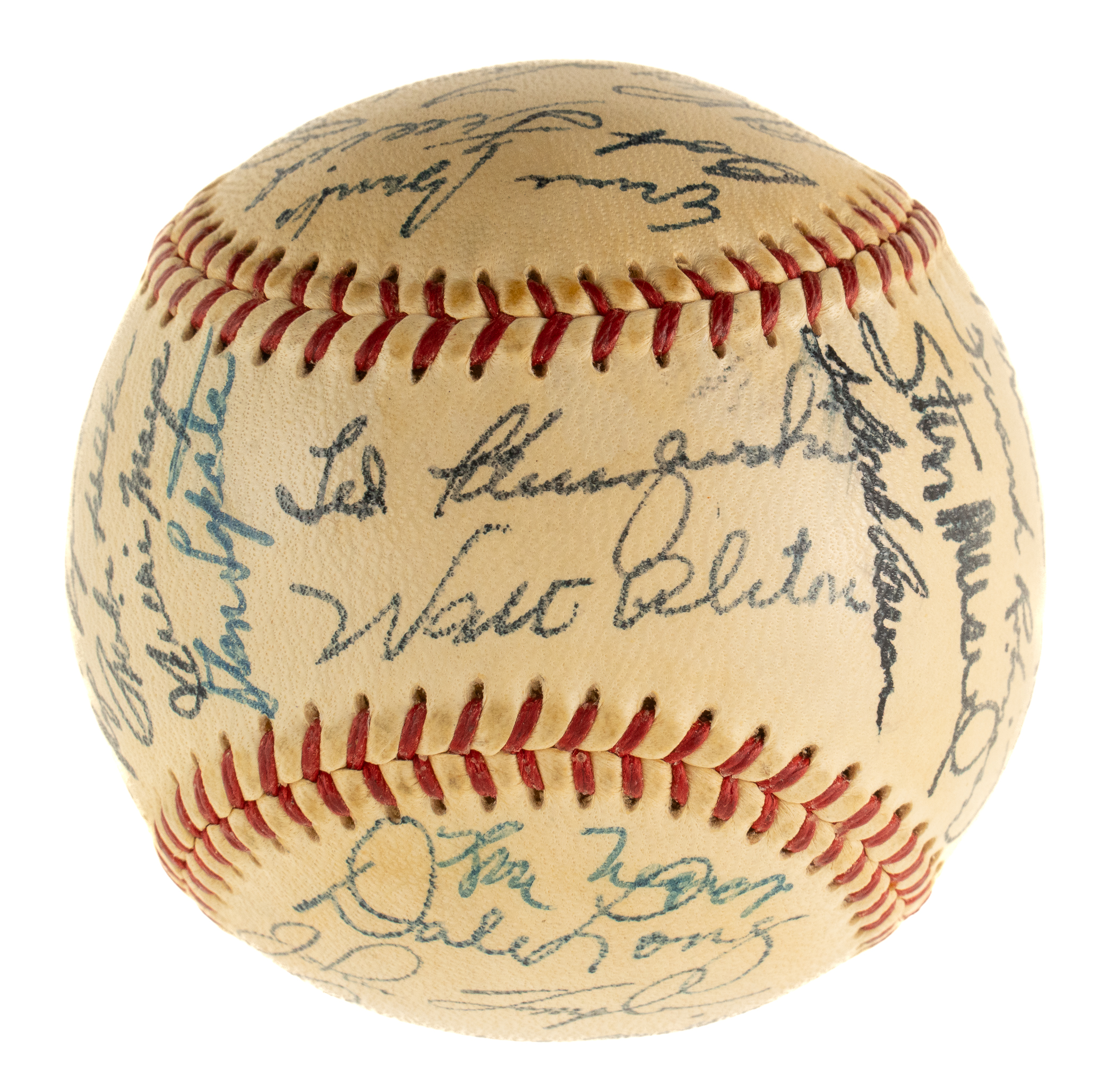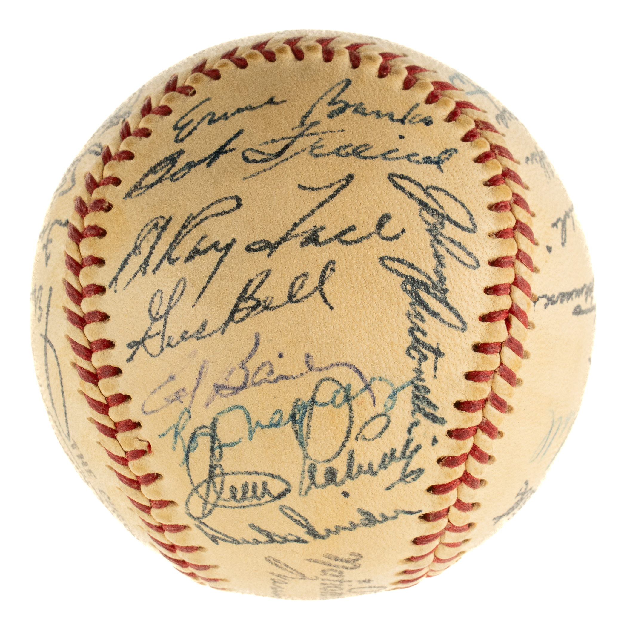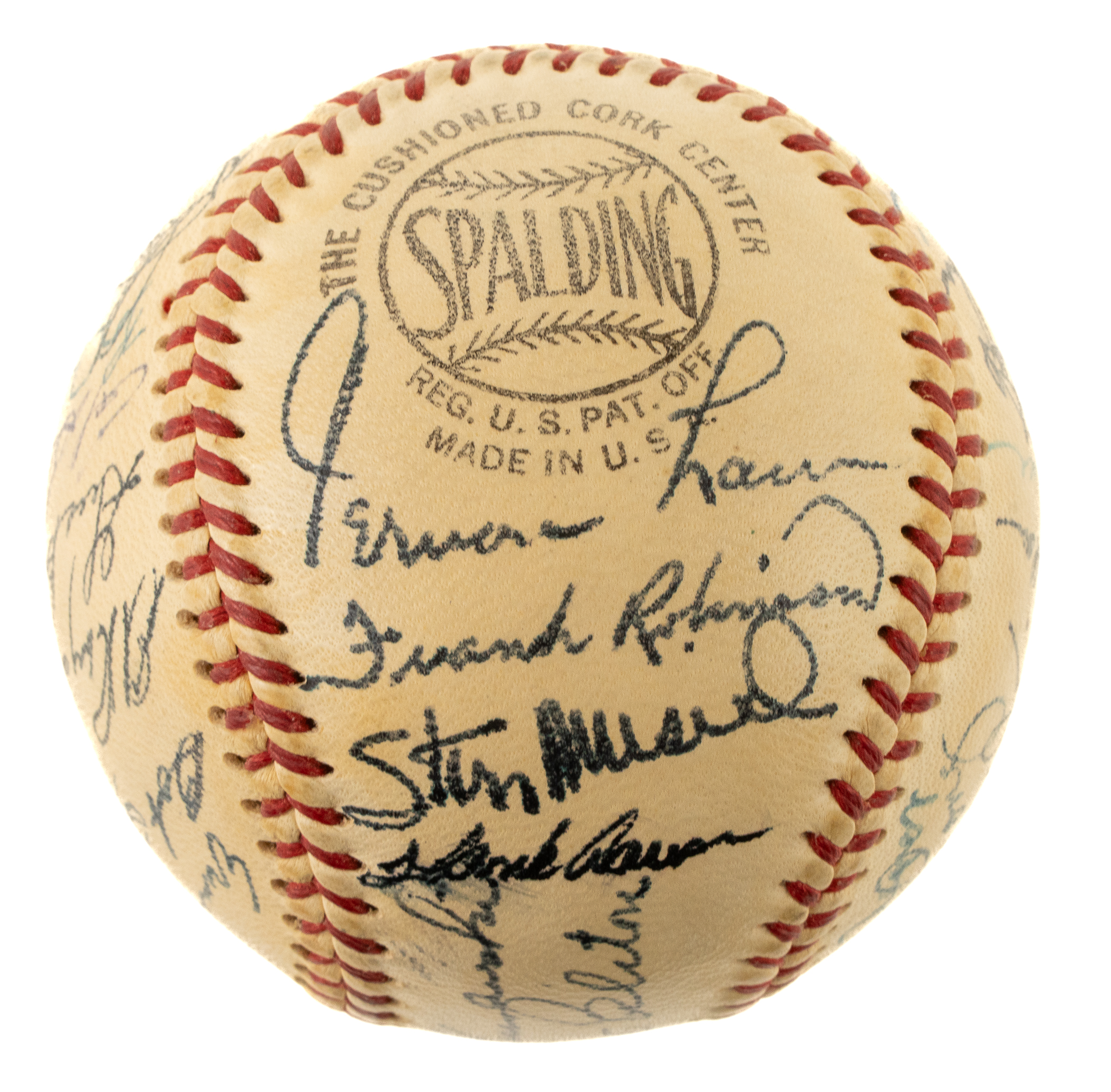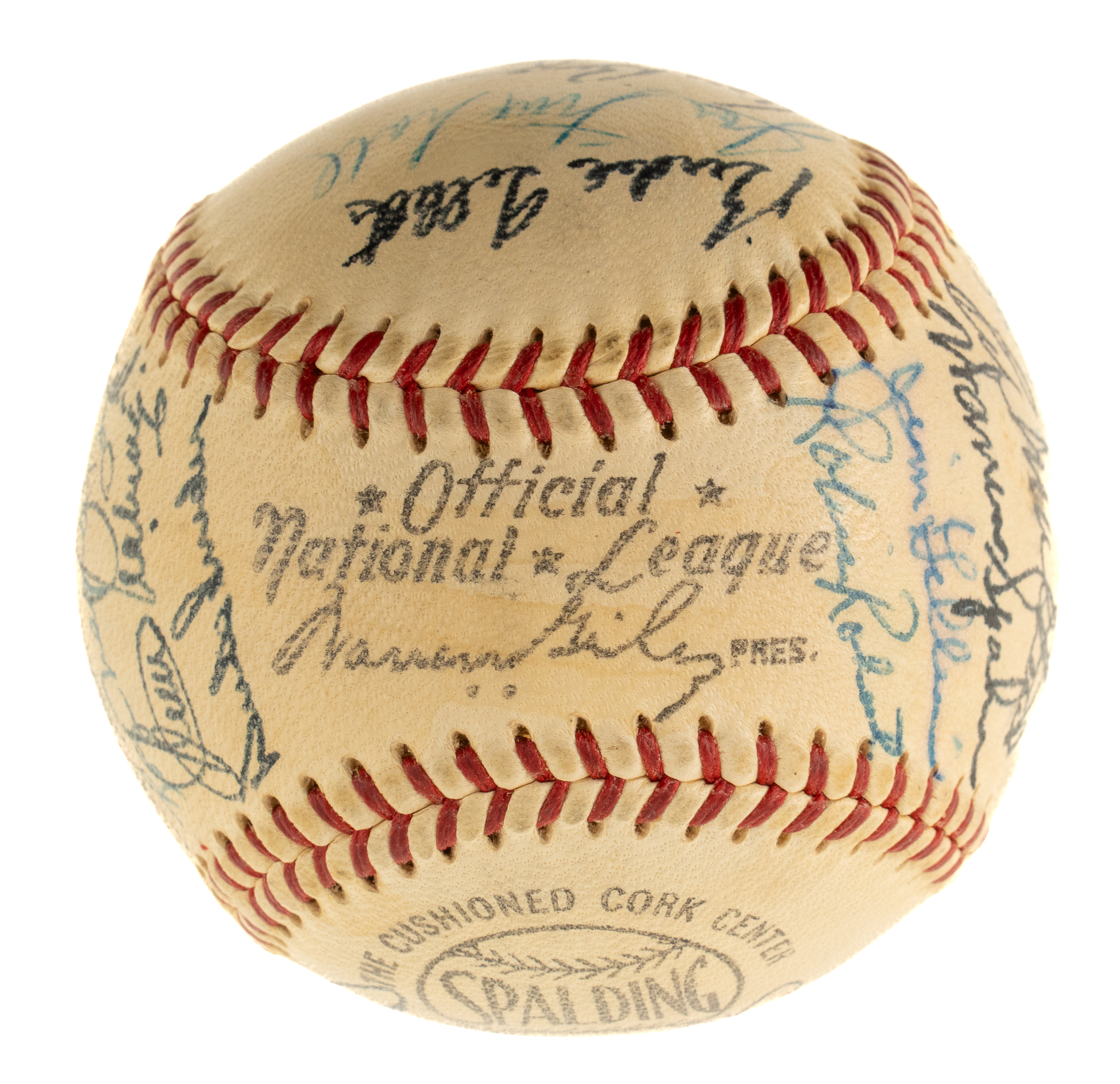 Official National League baseball (Giles) signed in blue ink by 28 members of the 1956 National League All-Star team: Aaron, Mays, Musial, F. Robinson, Mathews, Spahn, Banks, Snider, Roberts, Alston (Mgr., sweet spot), Kluszewski (sweet spot), Nuxhall, Tebbetts (coach), Boyer, Hutchinson (coach), Repulski, Lopata, Friend, Face, Bell, Bailey, Labine, Antonelli, Long, Temple, McMillan, Lawrence, and Gilliam. Four additional signatures appear on the ball but were not officially on the team (Vernon Law, Rube Walker, and two unidentified). The ball has light toning and is otherwise in Near Mint condition. Auction LOA from James Spence/JSA.