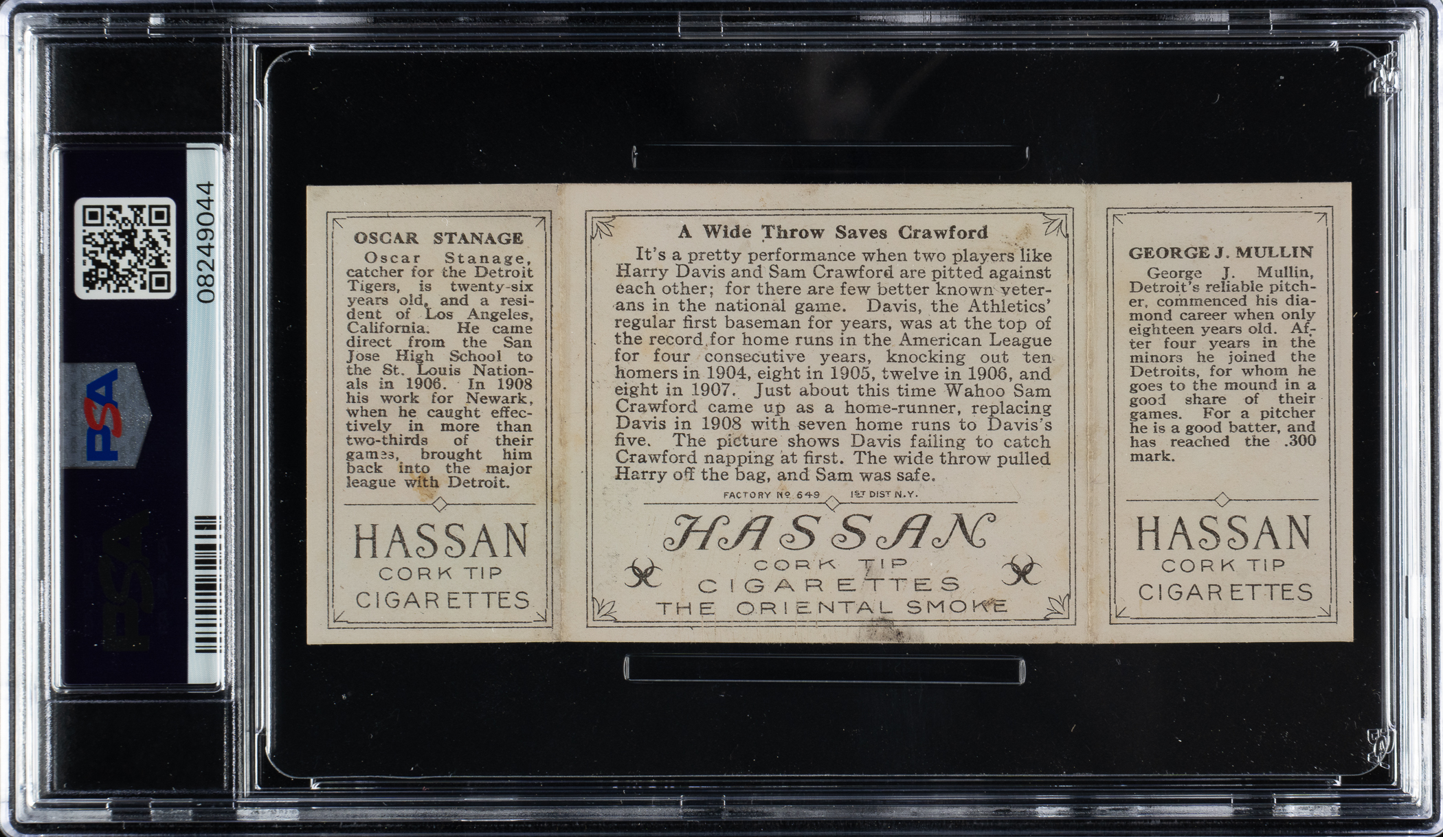 Lot # 840: 1912 T202 Hassan Triple Folder "A Wide Throw Saves Crawford" Stanage/Mullin PSA EX-MT 6