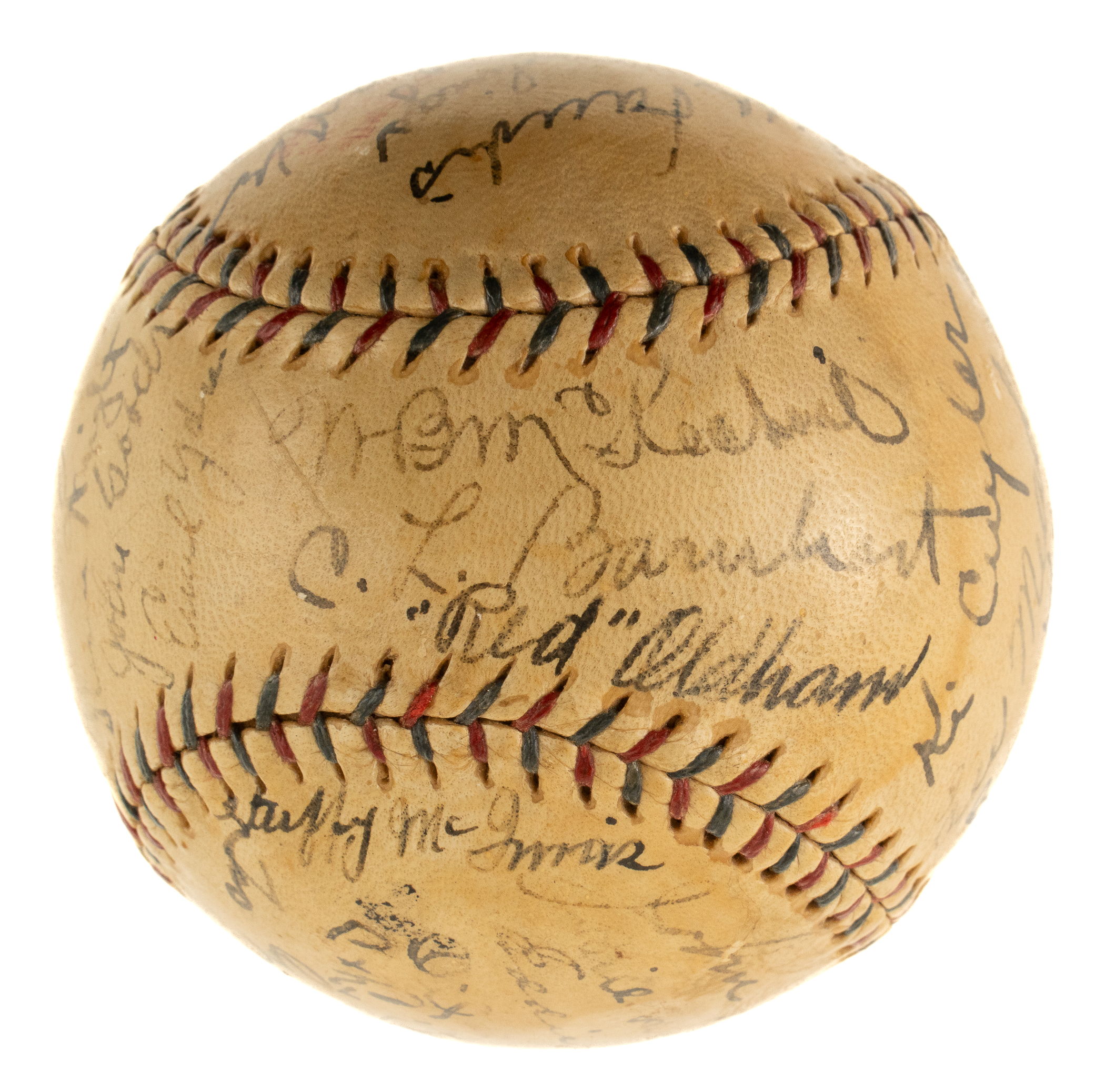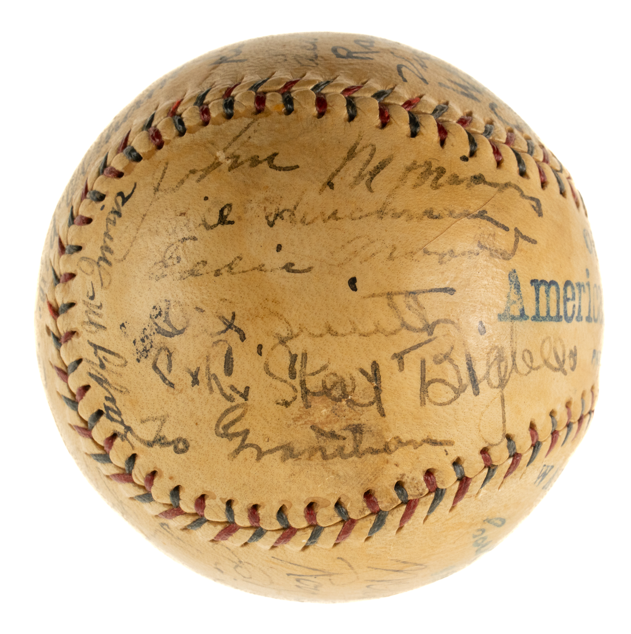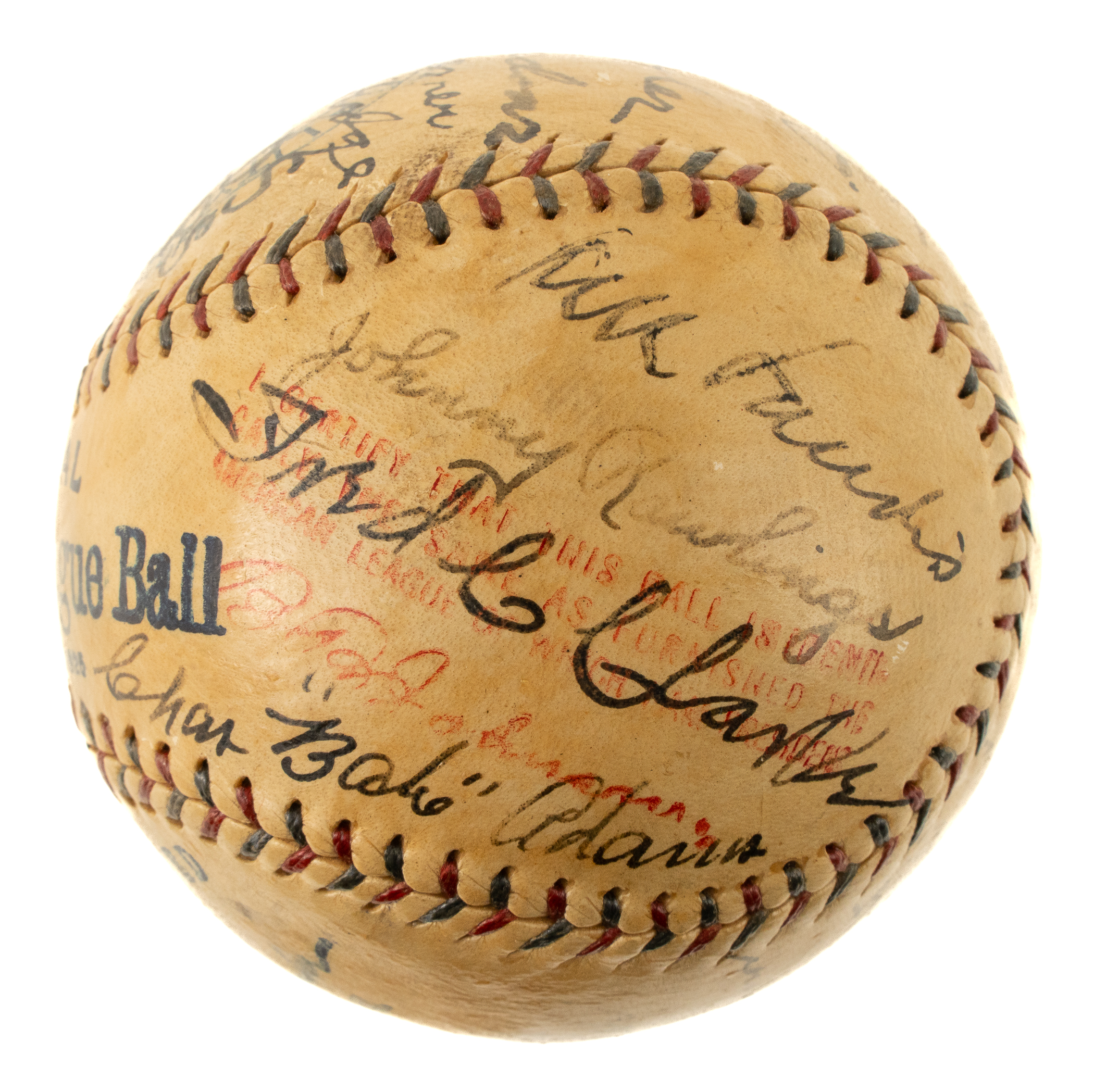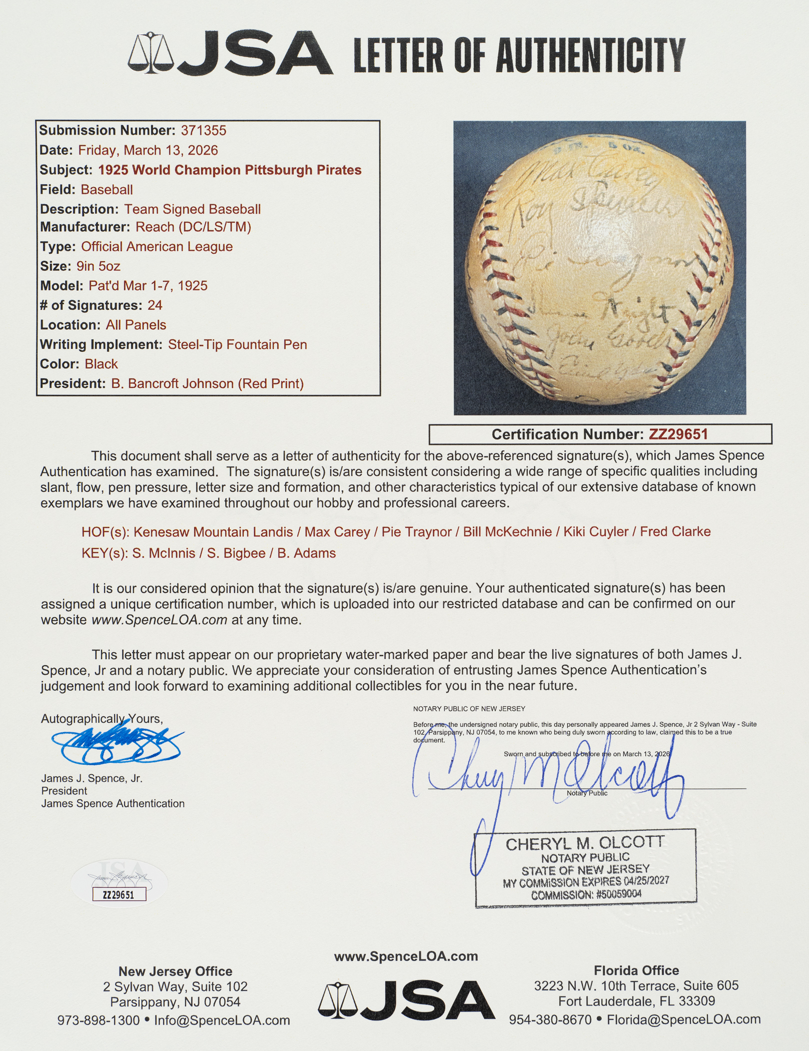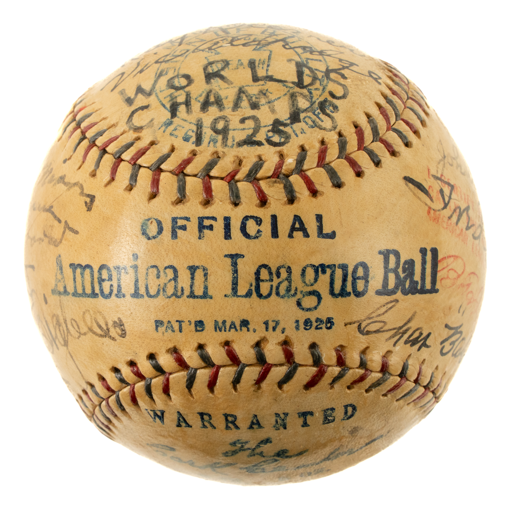 This exceptional team-signed ball features the black fountain pen signatures of 24 members of the 1925 World Champion Pittsburgh Pirates, including Hall of Famers Fred Clarke (coach), Max Carey, Pie Traynor, Bill McKechnie (Mgr., sweet spot), and Kiki Cuyler. The signature of baseball commissioner Kenesaw Mountain Landis also appears on a side panel. The remaining team signatures adorning the Official American League baseball (Johnson) are those of Clyde Barnhart (sweet spot), Red Oldham (sweet spot), Roy Spencer, Glenn Wright, John Gooch, Emil Yde, Lee Meadows, Ray Kremer, Vic Aldridge, Johnny Rawlings, Babe Adams, George Grantham, Stuffy McInnis, Carson Bigbee, Earl Smith, Eddie Moore, Bill Hinchman (coach), and John Morrison. The black-ink notation "Worlds Champs 1925" appears on a side panel. All of the signatures remain clearly legible. The presence of Landis' signature, along with the fact that this is an American League ball, strongly suggests that this ball was most likely signed at the 1925 World Series. The Pirates defeated the Washington Senators in seven games, capturing their second World Championship in franchise history. Team-signed balls of championship clubs from the 1920s are extremely rare, especially those in high-grade condition, as offered here. All of the manufacturer's stampings are bold and legible, and the lightly toned ball has been coated with a very thin layer of protective shellac. In Excellent to Mint condition. This is an outstanding example and one that would be a welcome addition to any advanced Pittsburgh Pirates or team-signed ball collection. Full LOA from James Spence/JSA.