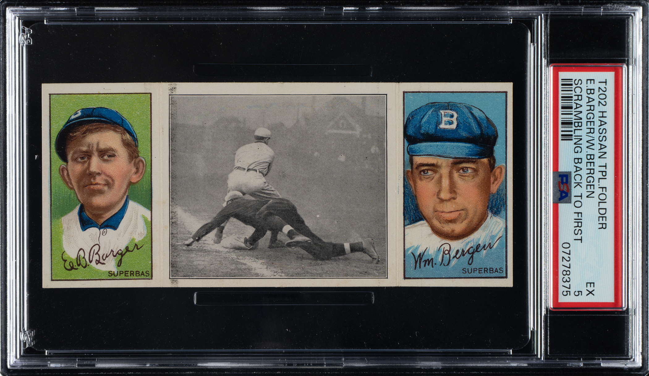 Lot # 882: 1912 T202 Hassan Triple Folder "Scrambling Back To First" Bergen/Barger PSA EX 5