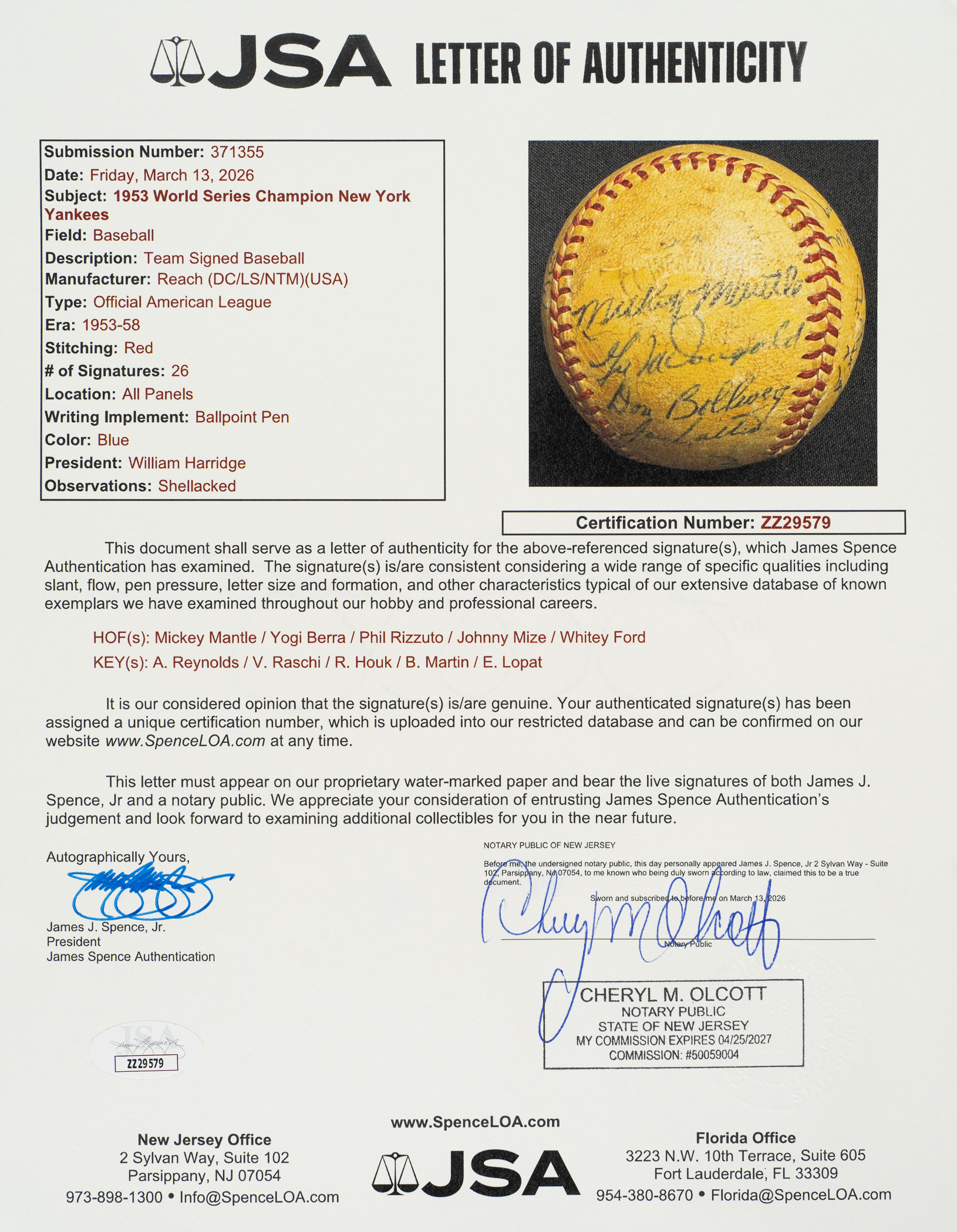Official American League baseball (Harridge) signed in blue ink by 26 members of the 1953 World Champion New York Yankees: Mantle, Berra, Ford, Mize, Rizzuto, Martin, Reynolds (sweet spot), Kuzava, Lopat, Miranda, Gorman, Silvera, Raschi (sweet spot), Noren, Woodling, McDonald, Collins, Bollweg, McDougald, Houk (coach), Renna (only played for the Yankees in 1953), Carey, Blackwell, Sain, Scarborough, and Bauer. The ball has been coated with a layer of protective shellac and the manufacturer stampings have faded. In Fair to Good condition overall. Full LOA from James Spence/JSA.
