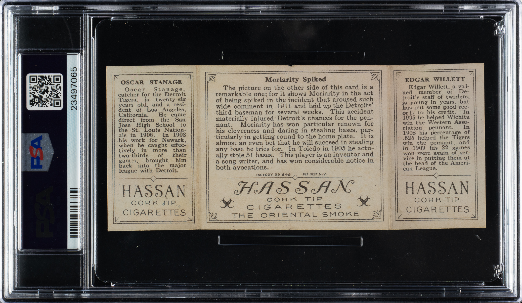 Lot # 875: 1912 T202 Hassan Triple Folder "Moriarity Spiked" Willett/Stanage PSA VG-EX 4