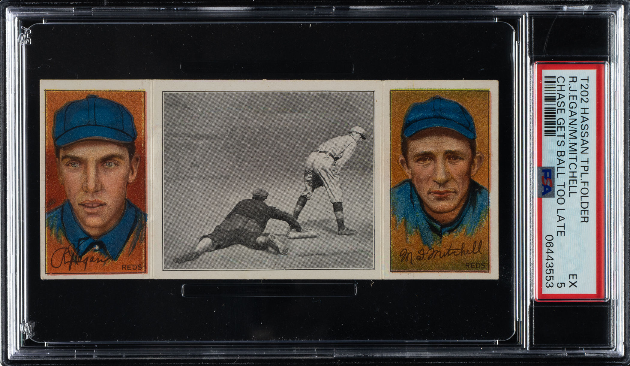 Lot # 848: 1912 T202 Hassan Triple Folder "Chase Gets Ball Too Late" Egan/Mitchell PSA EX 5