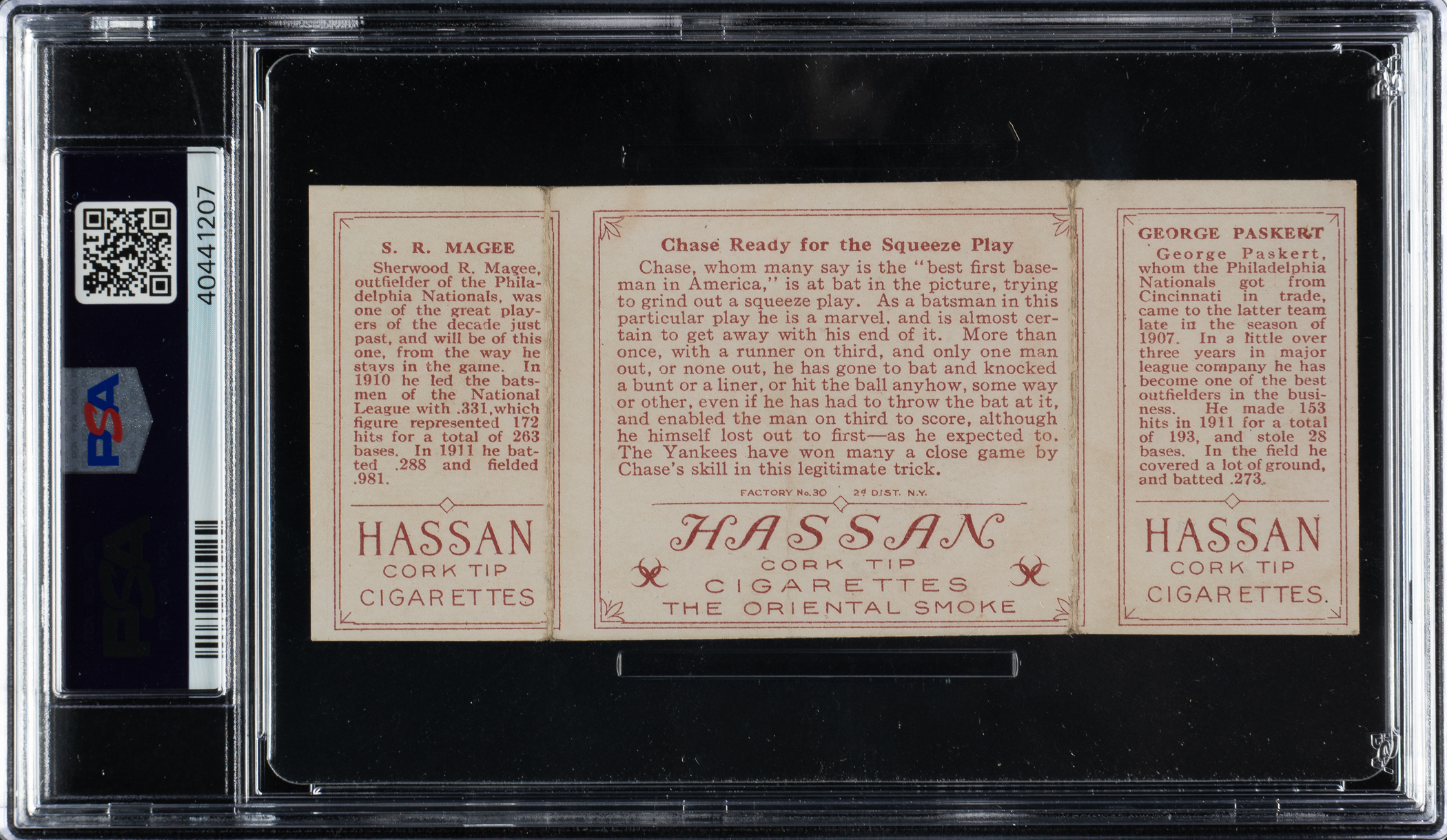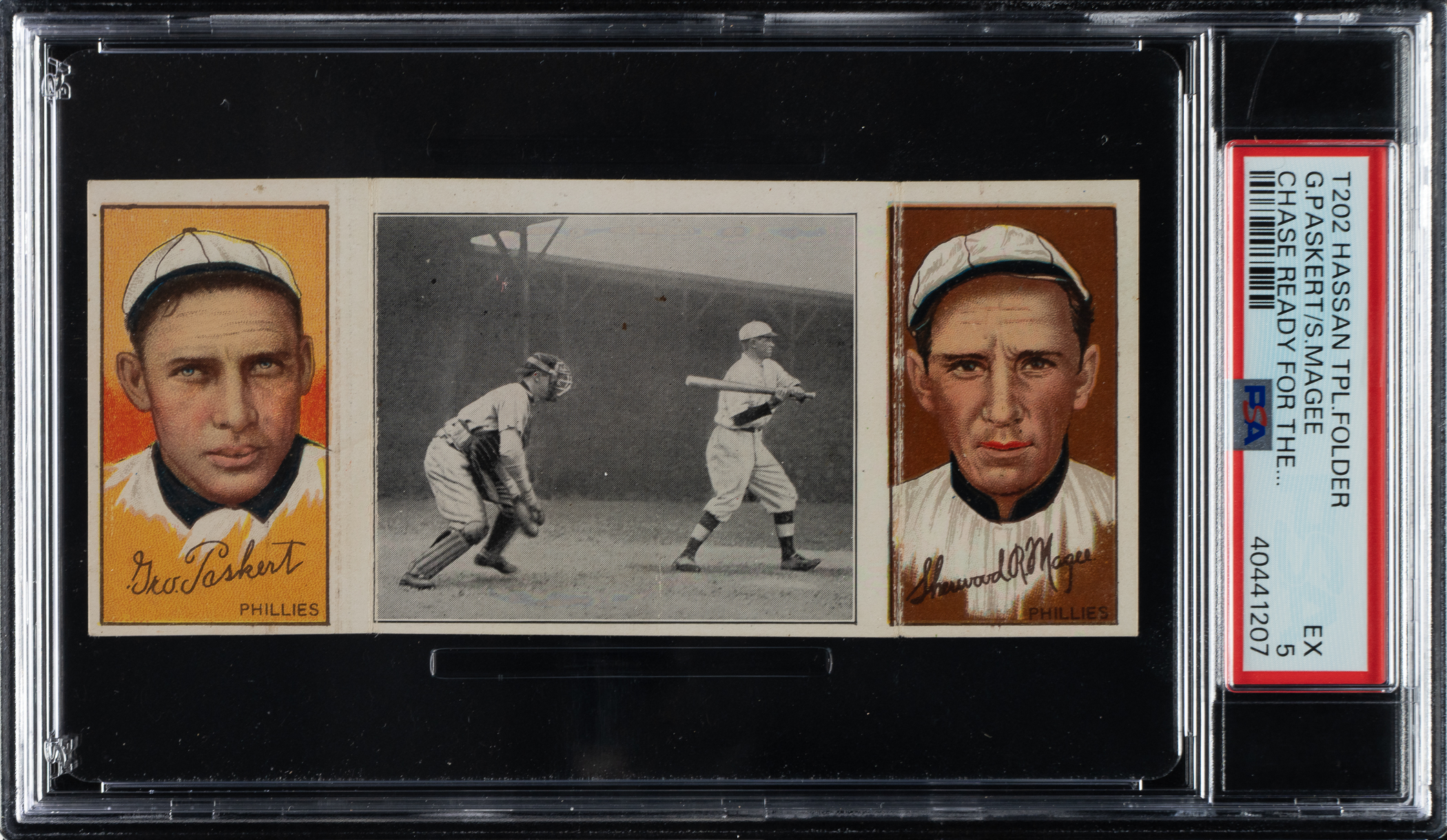 Lot # 850: 1912 T202 Hassan Triple Folder "Chase Ready For Squeeze" Magee/Paskert PSA EX 5
