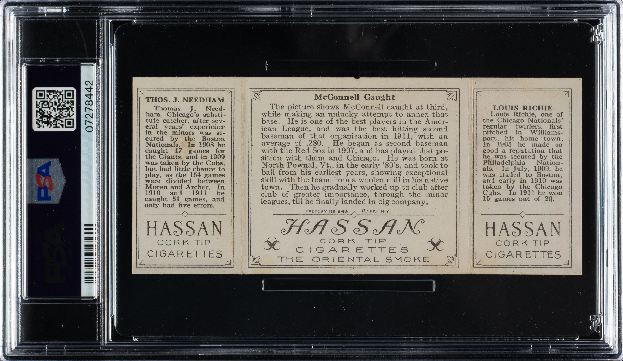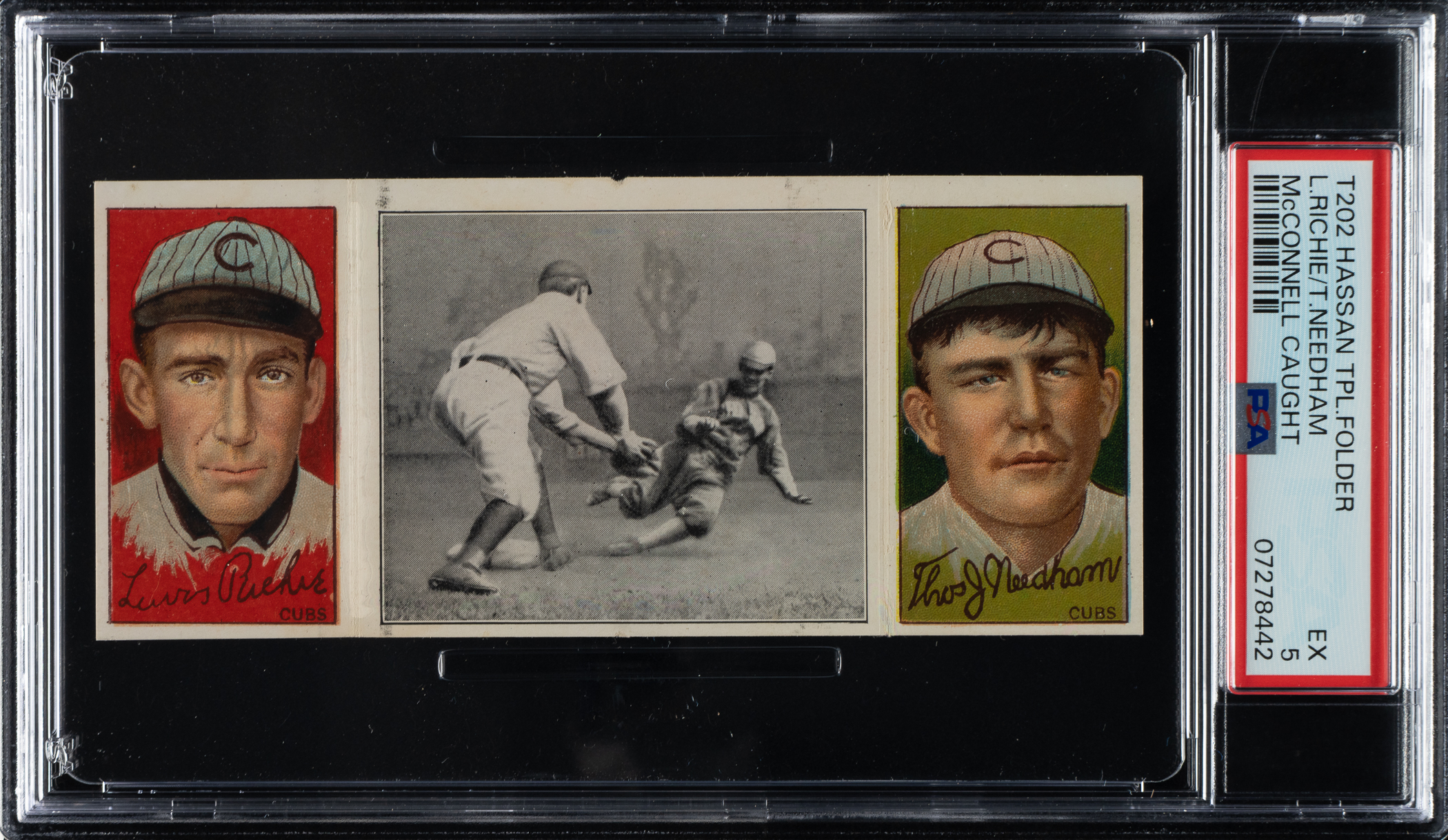 Lot # 873: 1912 T202 Hassan Triple Folder "McConnell Caught" Richie/Needham PSA EX 5