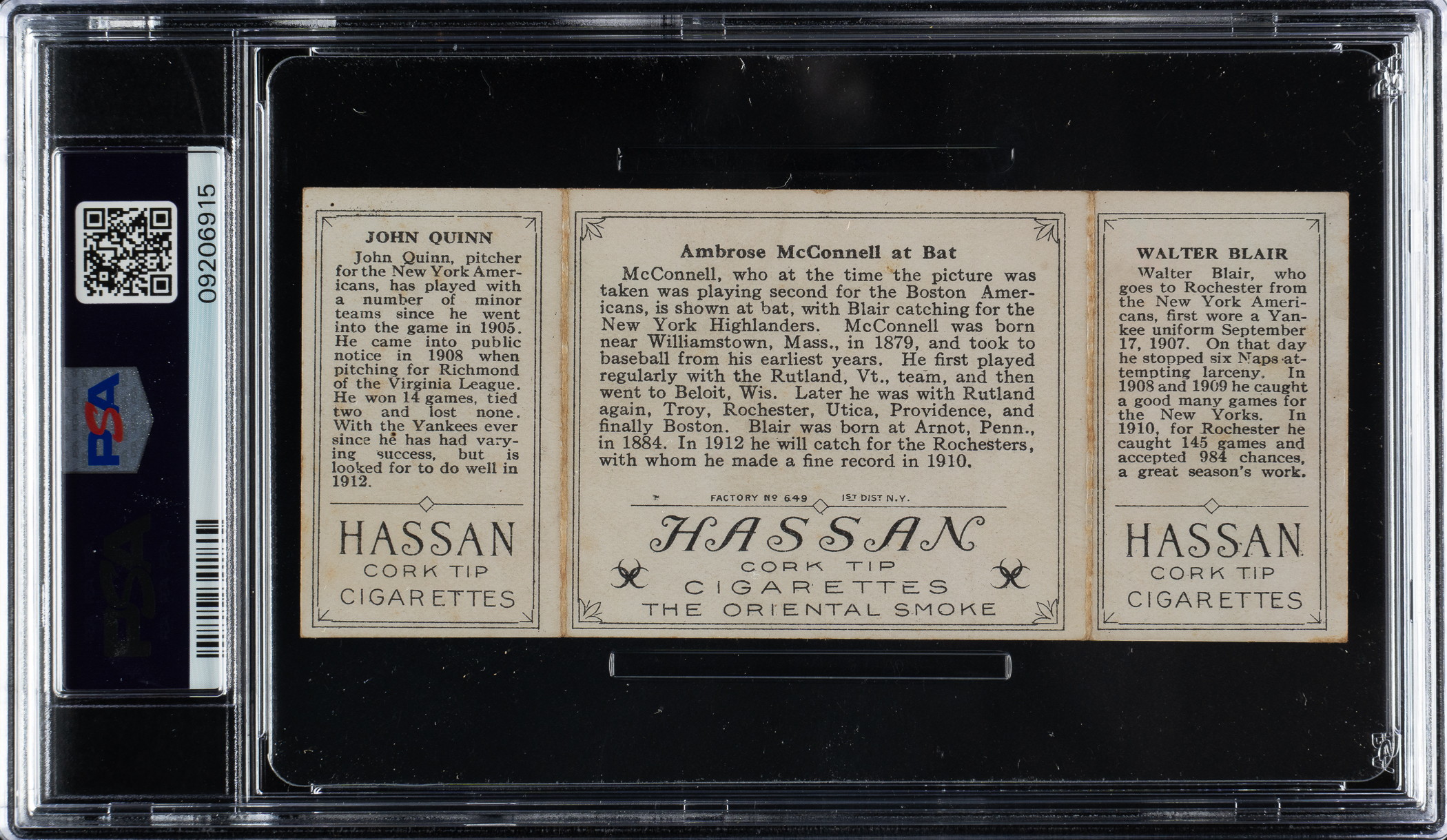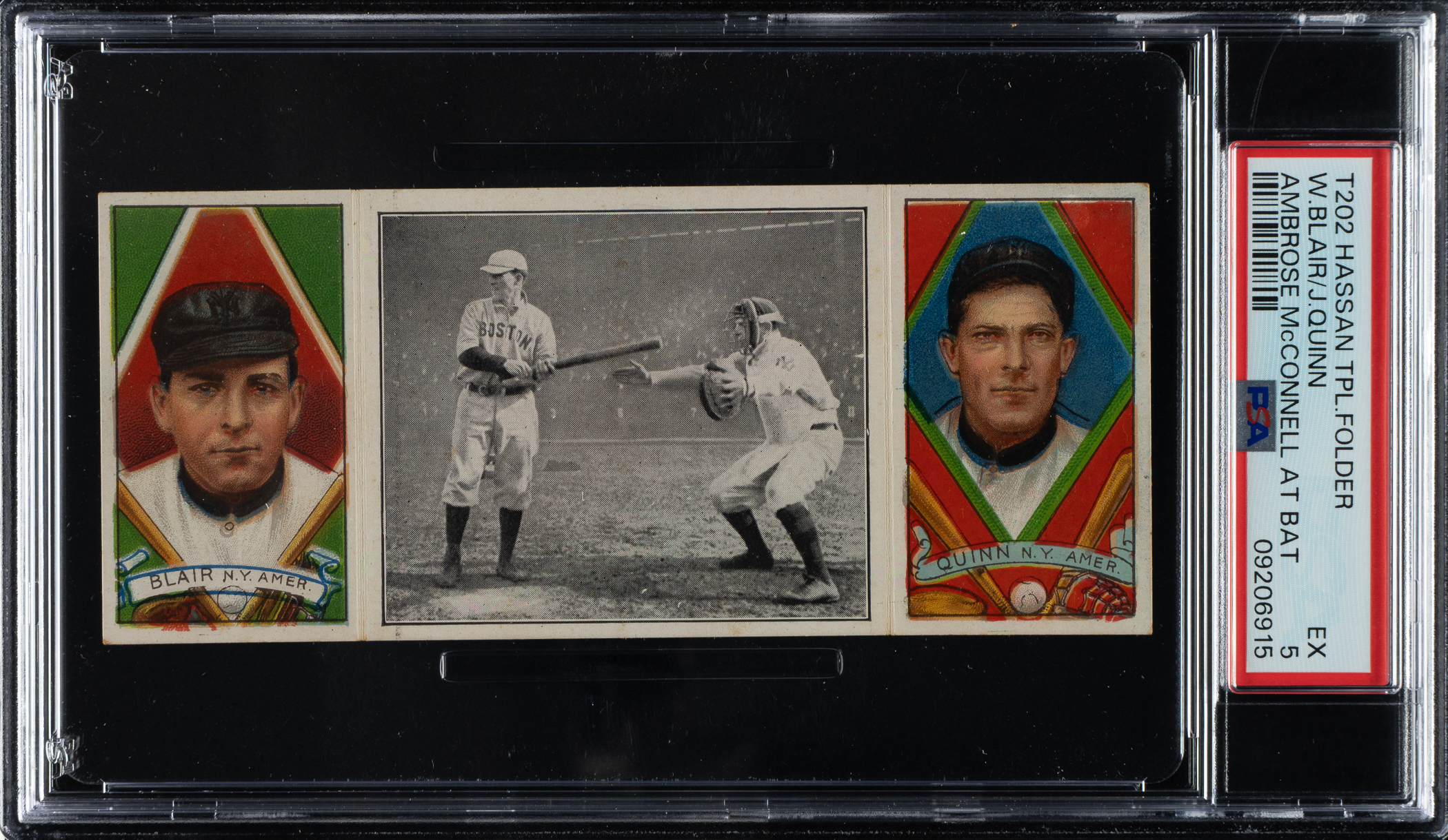 Lot # 841: 1912 T202 Hassan Triple Folder "Ambrose McConnell at Bat" Blair/Quinn PSA EX 5