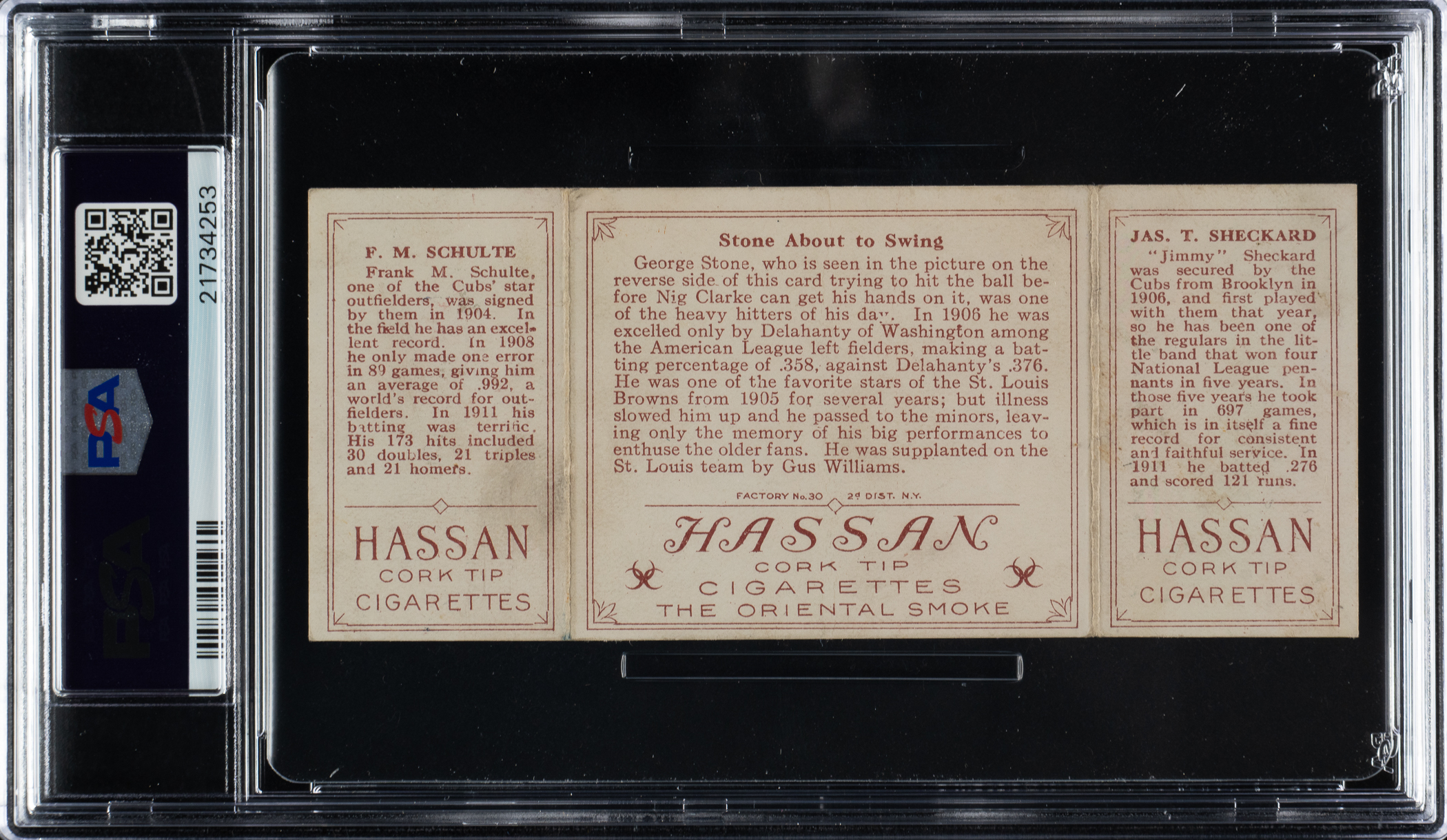 Lot # 884: 1912 T202 Hassan Triple Folder "Stone About To Swing" Schulte/Sheckard PSA EX 5