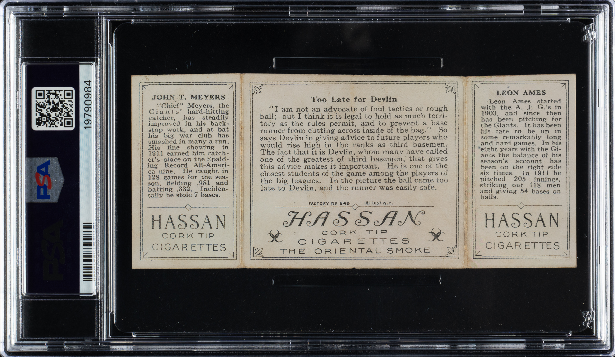 Lot # 896: 1912 T202 Hassan Triple Folder "Too Late For Devlin" Ames/Meyers PSA VG-EX 4