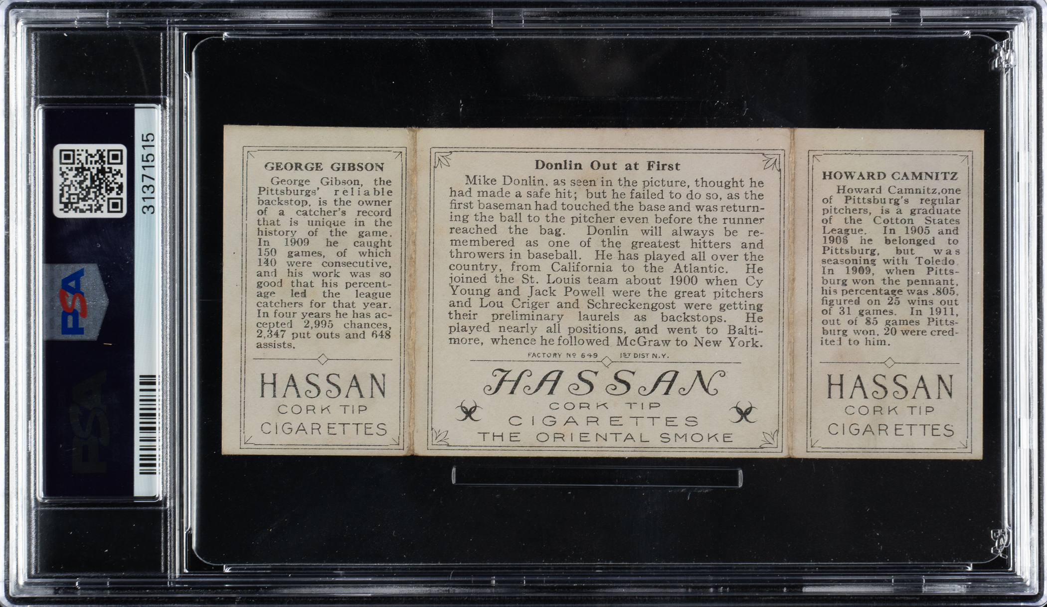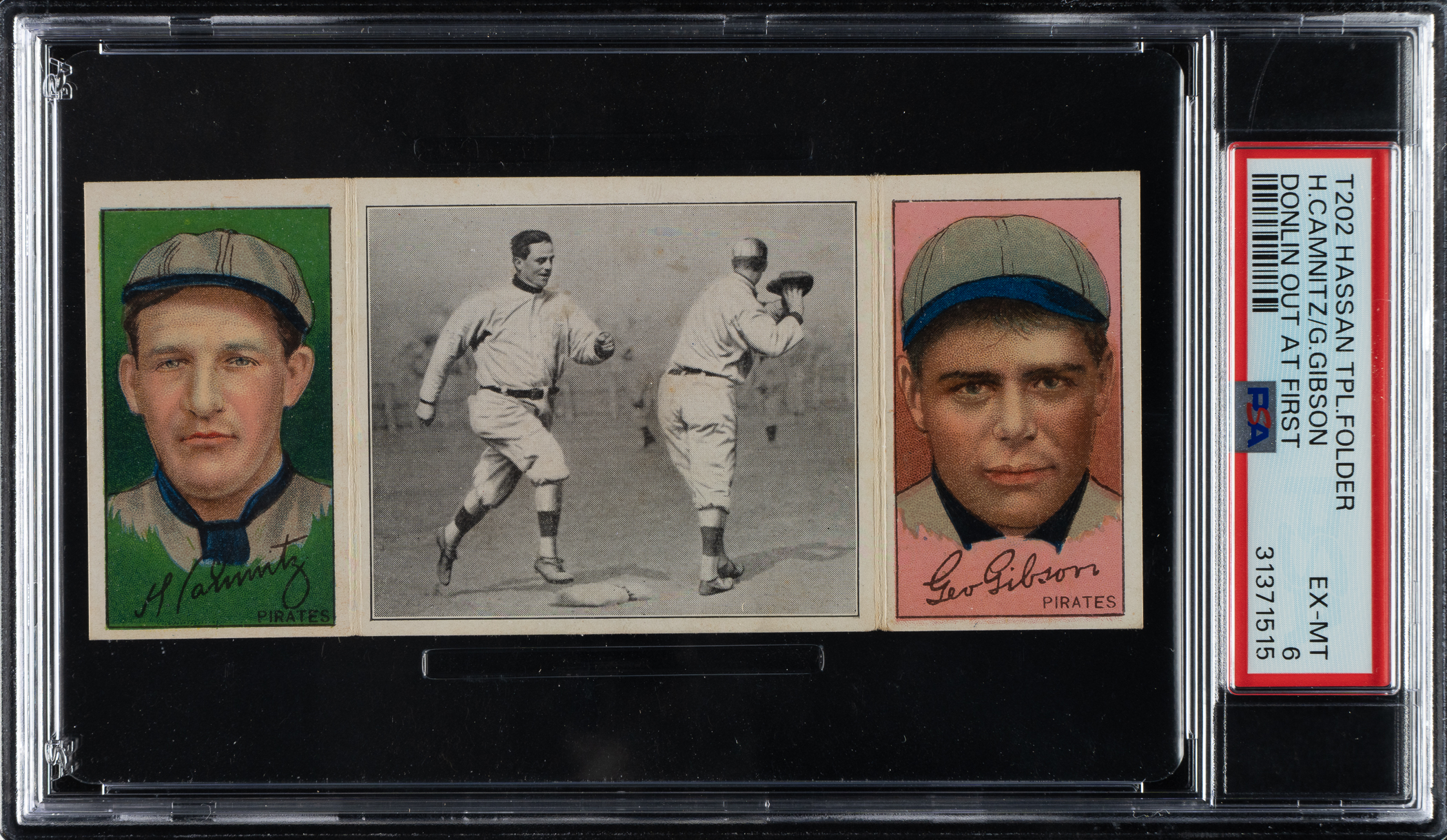 Lot # 855: 1912 T202 Hassan Triple Folder "Donlin Out at First" Gibson/Camnitz PSA EX-MT 6