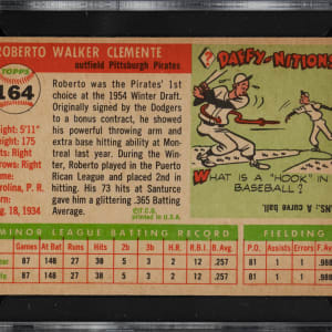 Graded NM 7 by SGC. High-grade example of Pittsburgh Pirates Hall of Famer Roberto Clemente's rookie card. One of card collecting's classics, Clemente's rookie card is the key to the 1955 Topps set and one of the most popular of all postwar baseball cards. The offered example displays deep, rich color, outstanding registration, and strong corners. The reverse is clean with boldly printed text. This is a superb example of one of collecting's most famous cards and would be a worthy cornerstone to either a high-grade 1950s Clemente card collection or a world-class collection of classic baseball cards.